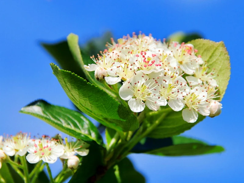Die Apfelbeere ‚Nero‘ bietet sich als Beerenobst für Obst- und Naschgärten sowie als Vogelschutzgehölz an. Im Frühjahr erscheinen strahlend weiße Blütendolden und im Herbst violett-schwarze Früchte. Das anfangs dunkelgrüne Laub nimmt nach dem Sommer eine leuchtend wein- bis braunrote Färbung an. Die (bot.) Aronia prunifolia ‚Nero‘ eignet sich ideal für die Einzelpflanzung. Auch in der Gruppe und als Unterpflanzung von Gehölzen oder für gemischte Naturhecken bezaubert sie den Betrachter. Die dunklen Beeren dieses schönen Gehölzes, auch als Schwarze Apfelbeere bekannt, heben sich kontrastreich von der wunderschönen Belaubung ab. Sie erreichen zirka 1,2 Zentimeter im Durchmesser und sind mit wachsartigem Reif überzogen. Sie eignen sich zur Herstellung von Getränken, Marmeladen und Gelees, für Fruchtjoghurt und Backwaren. Die Beeren enthalten einen tief dunkelroten Saft mit hoher Farbstabilität. Für den Frischverzehr sind sie bedeutungslos. Erst weiterverarbeitet entwickelt sich ihr guter Geschmack. Sie sind von beachtlichem gesundheitlichem Wert. Schon lange sind sie in Russland als Heilpflanze bekannt und tragen den Beinamen ‚Gesundheitsbeere‘. Der Geschmack der reifen Beeren ist im Rohzustand süß-säuerlich-herb. Ursprünglich stammt das sommergrüne Gehölz aus den östlichen Regionen Nordamerikas. Es wächst als dichter und buschiger Strauch mit Wuchshöhen von bis zu zwei Metern. Der jährliche Zuwachs liegt bei fünf bis zwanzig Zentimetern. Durch die niedrige Höhe eignet es sich perfekt für kleinere Gärten. Ab Mitte Mai beeindrucken die schirmrispigen, reinweißen Blütenstände den Betrachter. Sie schmücken sich mit zehn bis zwanzig einfachen Einzelblüten, die einen markanten Duft verströmen.