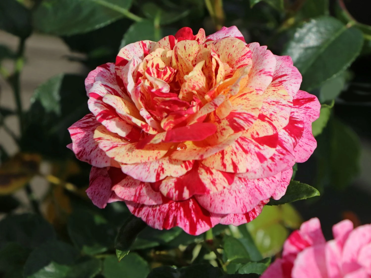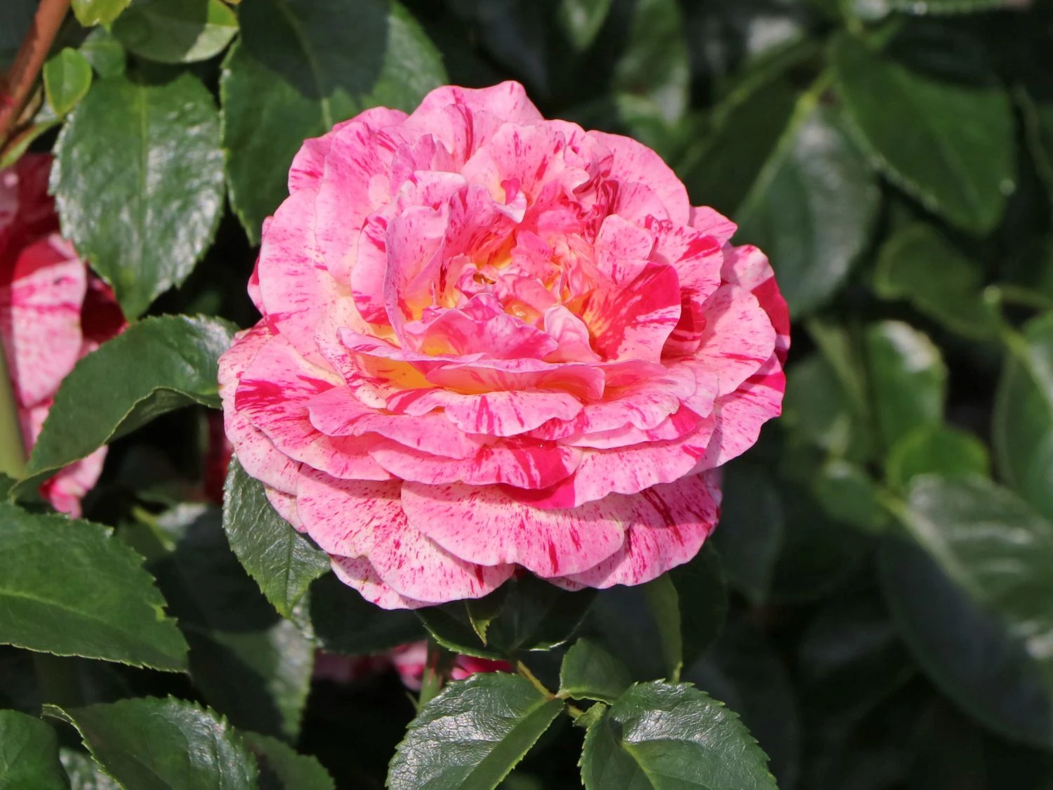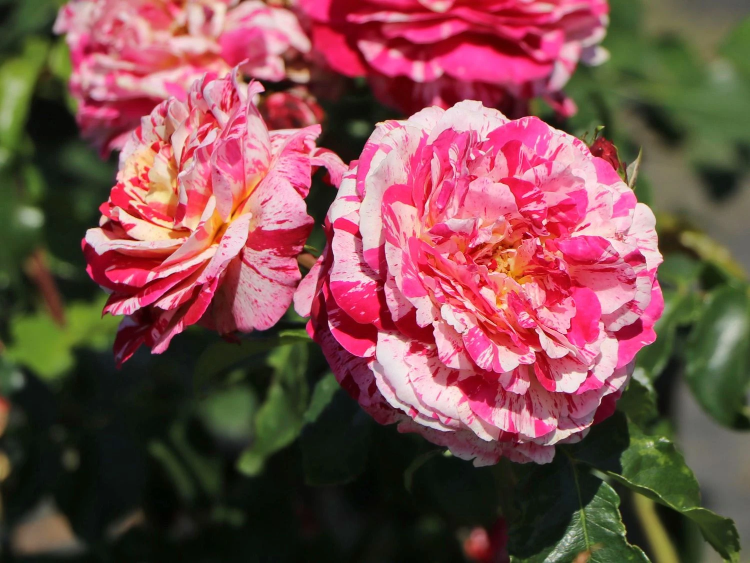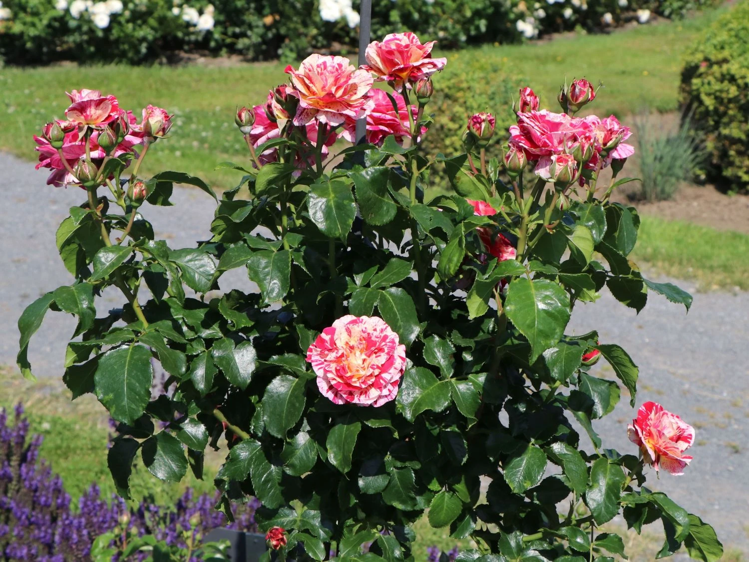 Die Beetrose ‚Abracadabra‘ ® überrascht mit rot-weiß gestreiften Blüten, die sich zur Mitte hin in gelber Färbung schmücken. Als gestreifte Rosensorte ist dieses herrliche Schmuckstück ein besonderes Erlebnis im Garten. In Einzelstellung und in Gruppen auf Beeten und Rabatten rangiert die dekorative Rose als toller Blickfang. Sie blüht den ganzen Sommer, wobei der zweite Flor manches Mal reichhaltiger als der erste ausfällt. Das Farbenspiel ist eher zufällig. Die stark gefüllten und sechs bis neun Zentimeter großen Blüten wirken wie Rosetten. Das dunkelgrün glänzende Laub bildet einen spannenden Kontrast zu der einmalig schön blühenden Schönheit. Die (bot.) Rosa ‚Abracadabra‘ ® benötigt einfarbige Pflanzpartner, um ihre bunt blühende Pracht zu unterstreichen.