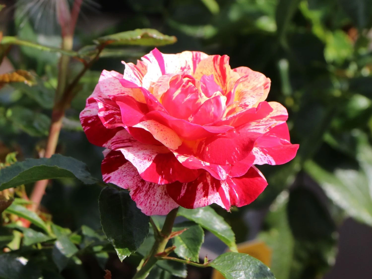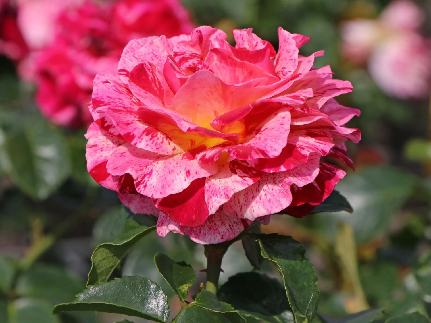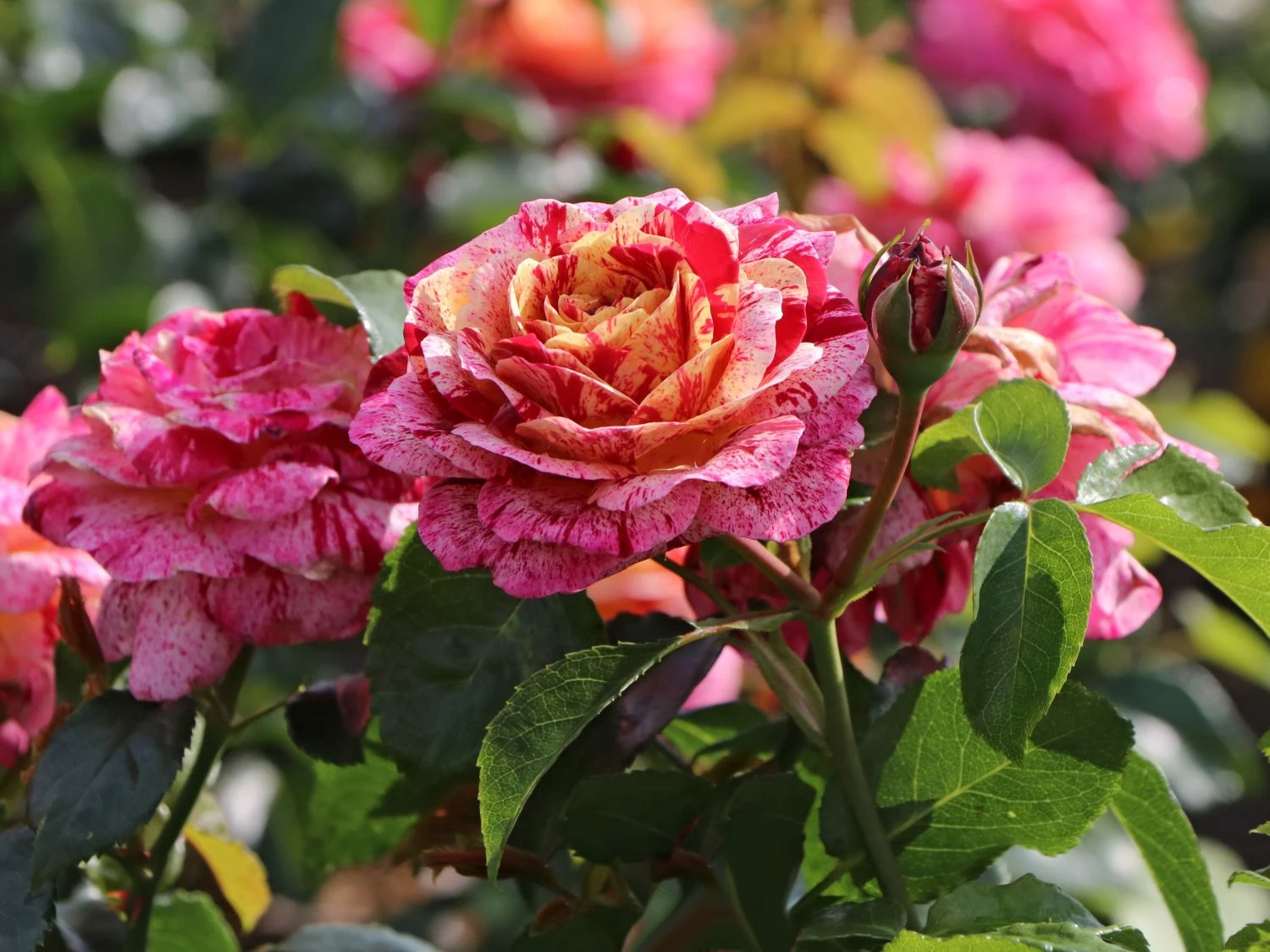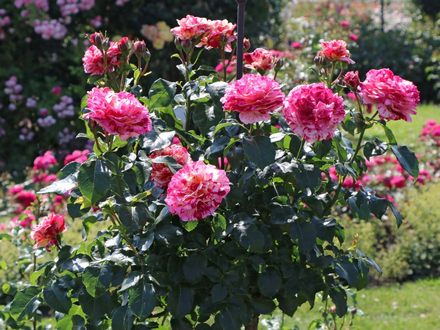 Die Beetrose ‚Abracadabra‘ ® überrascht mit rot-weiß gestreiften Blüten, die sich zur Mitte hin in gelber Färbung schmücken. Als gestreifte Rosensorte ist dieses herrliche Schmuckstück ein besonderes Erlebnis im Garten. In Einzelstellung und in Gruppen auf Beeten und Rabatten rangiert die dekorative Rose als toller Blickfang. Sie blüht den ganzen Sommer, wobei der zweite Flor manches Mal reichhaltiger als der erste ausfällt. Das Farbenspiel ist eher zufällig. Die stark gefüllten und sechs bis neun Zentimeter großen Blüten wirken wie Rosetten. Das dunkelgrün glänzende Laub bildet einen spannenden Kontrast zu der einmalig schön blühenden Schönheit. Die (bot.) Rosa ‚Abracadabra‘ ® benötigt einfarbige Pflanzpartner, um ihre bunt blühende Pracht zu unterstreichen.