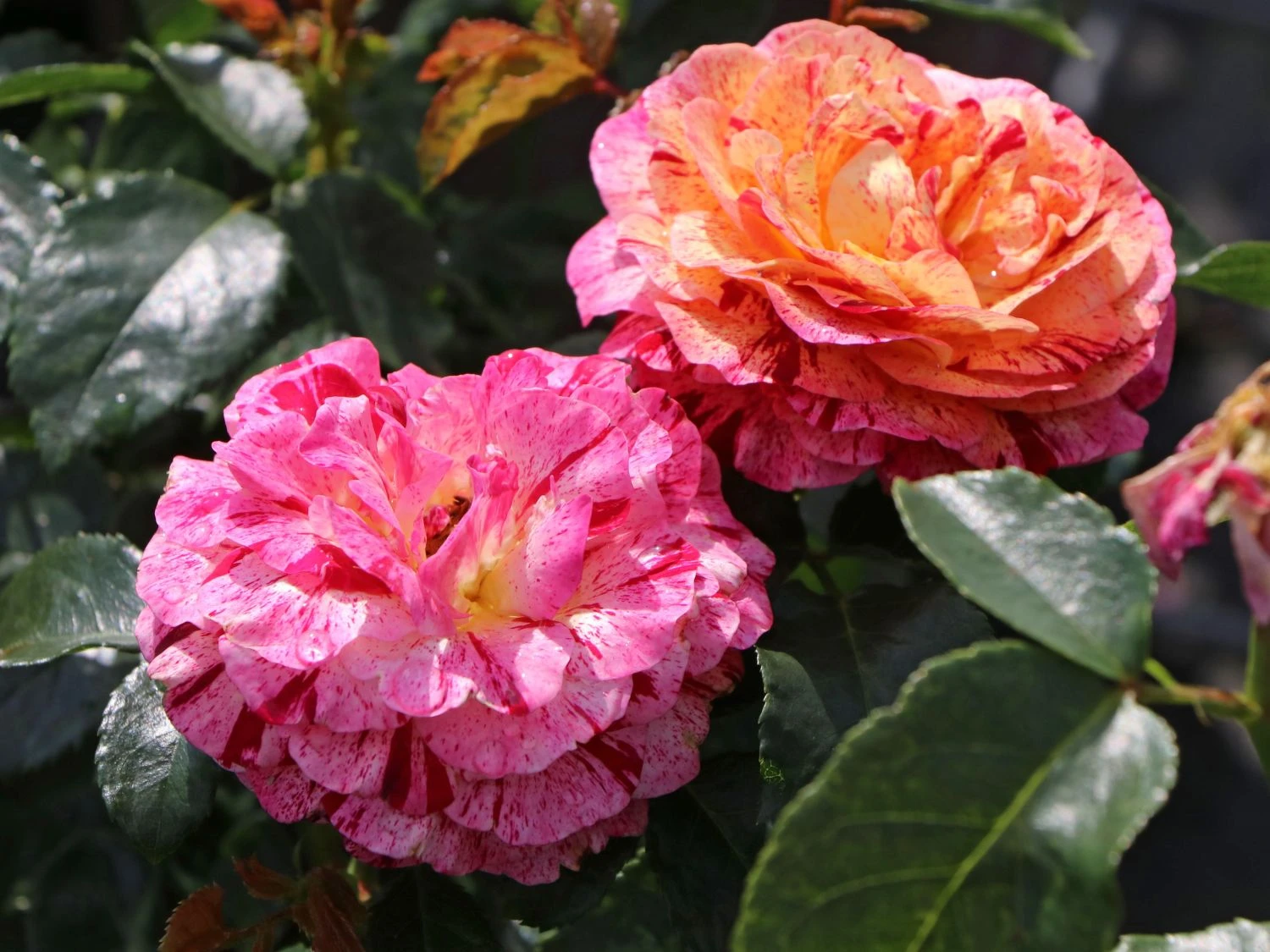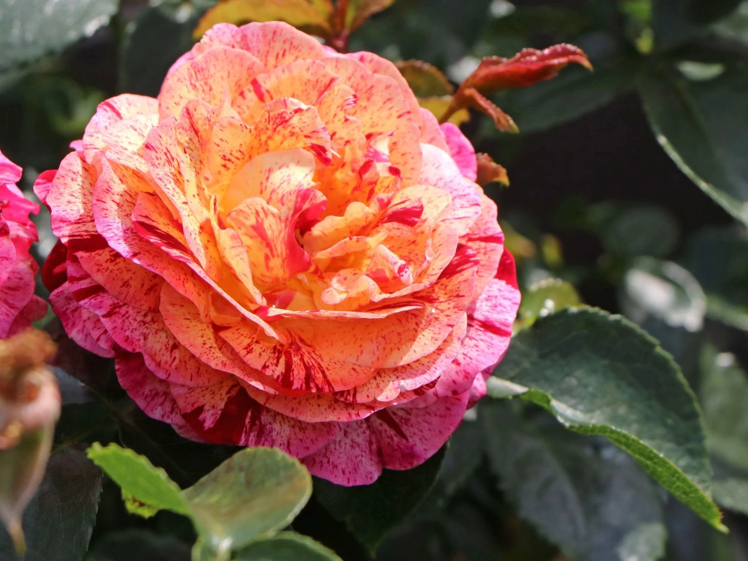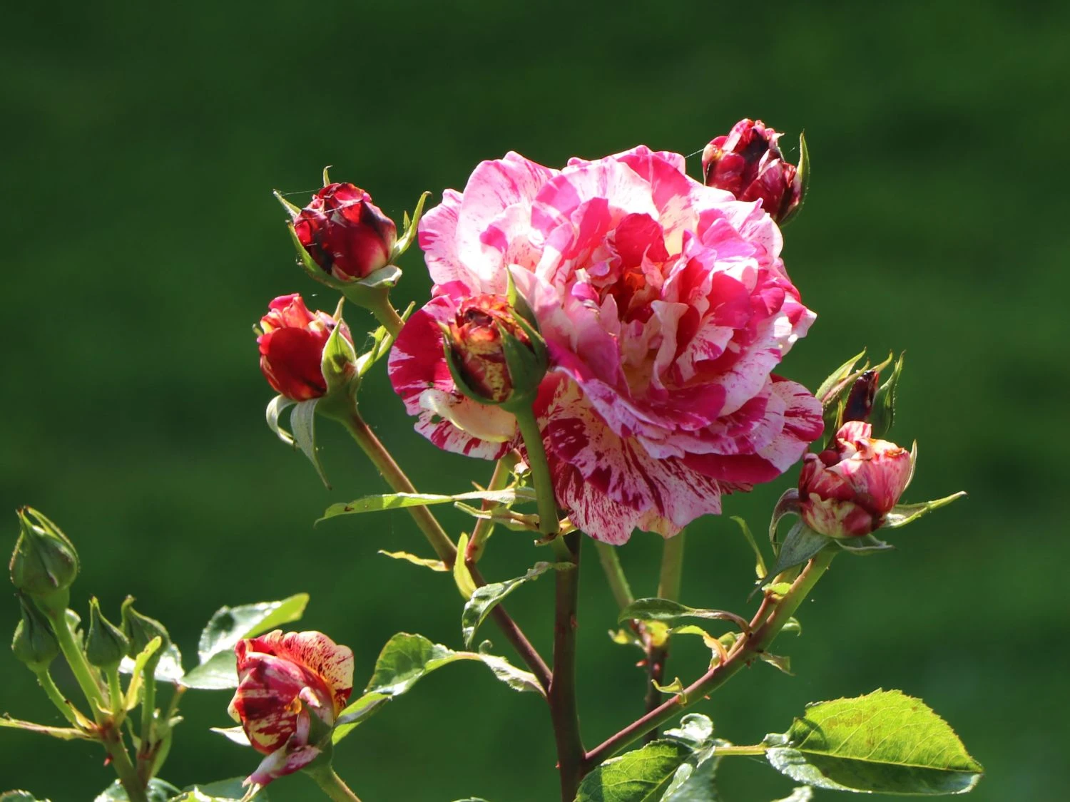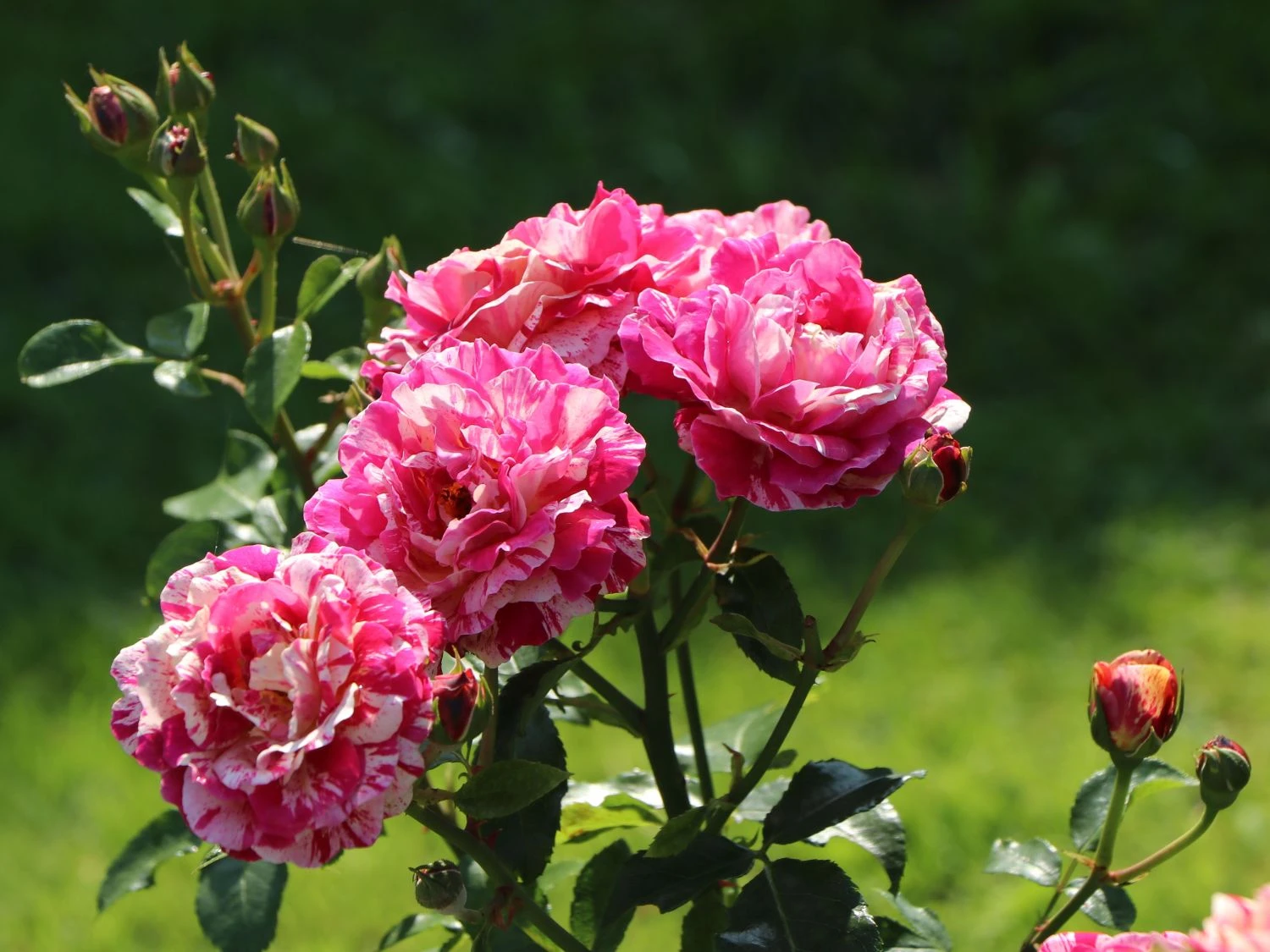 Die Beetrose ‚Abracadabra‘ ® überrascht mit rot-weiß gestreiften Blüten, die sich zur Mitte hin in gelber Färbung schmücken. Als gestreifte Rosensorte ist dieses herrliche Schmuckstück ein besonderes Erlebnis im Garten. In Einzelstellung und in Gruppen auf Beeten und Rabatten rangiert die dekorative Rose als toller Blickfang. Sie blüht den ganzen Sommer, wobei der zweite Flor manches Mal reichhaltiger als der erste ausfällt. Das Farbenspiel ist eher zufällig. Die stark gefüllten und sechs bis neun Zentimeter großen Blüten wirken wie Rosetten. Das dunkelgrün glänzende Laub bildet einen spannenden Kontrast zu der einmalig schön blühenden Schönheit. Die (bot.) Rosa ‚Abracadabra‘ ® benötigt einfarbige Pflanzpartner, um ihre bunt blühende Pracht zu unterstreichen.