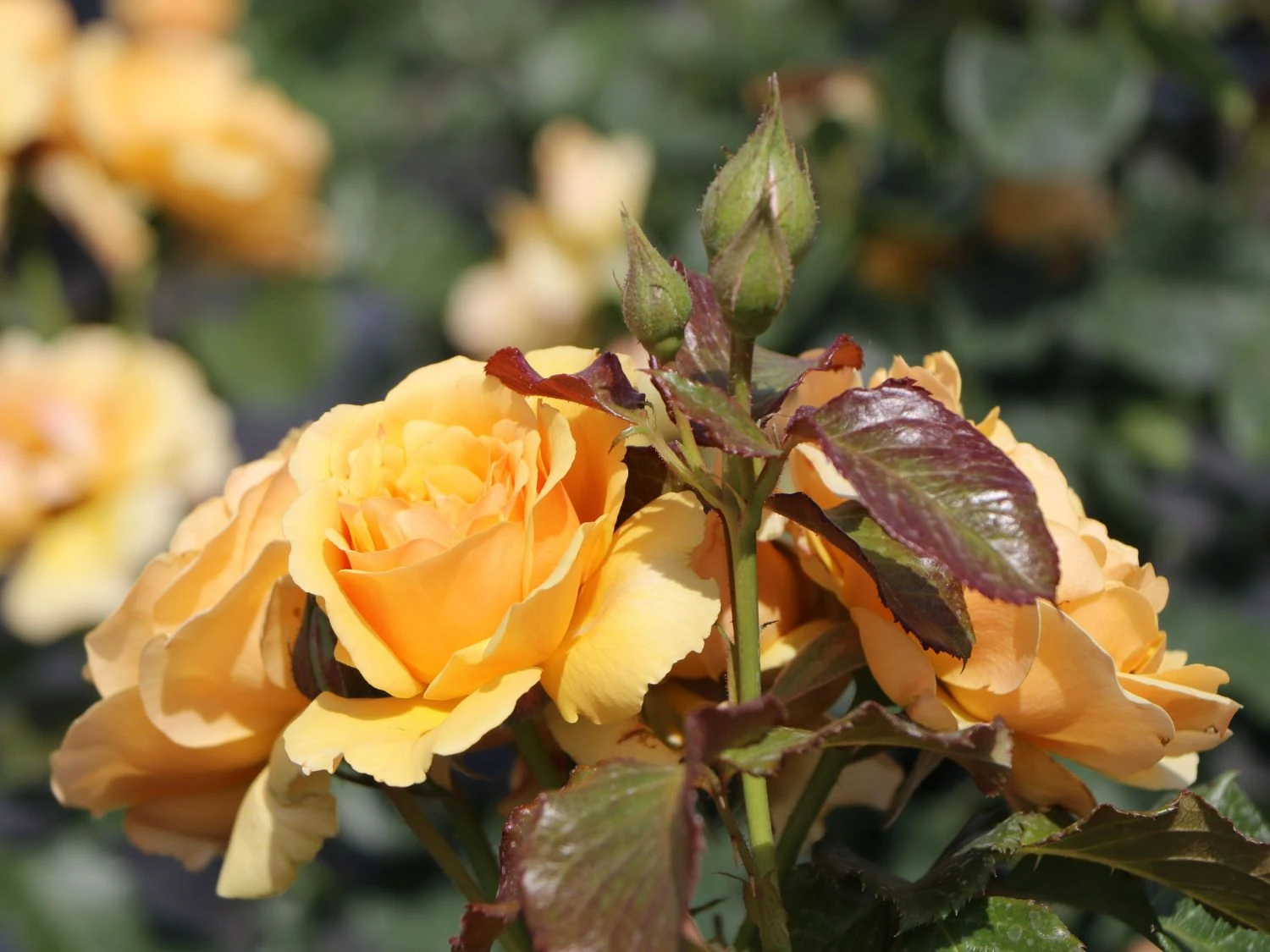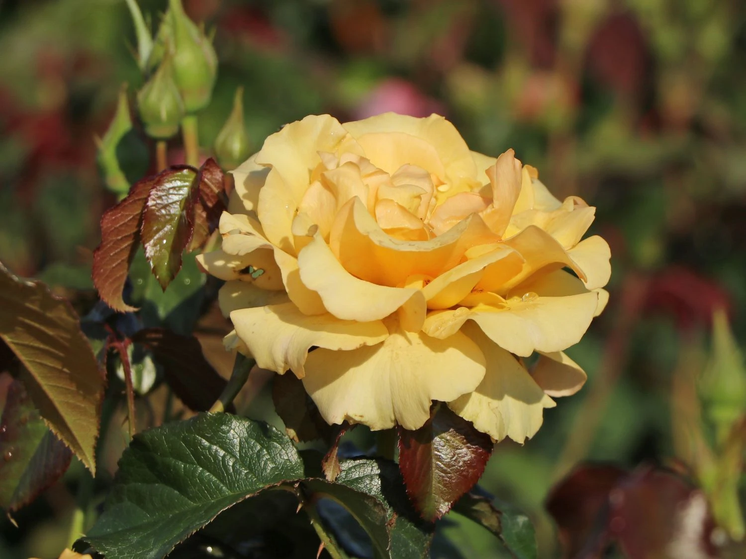 Die Beetrose ‚Amber Queen‘ ® bezaubert mit ihren gelben Blüten, die in ihrer Farbe an Bernstein erinnern. Der Kontrast zwischen Blüte und dem dunklem Laub der (bot.) Rosa ‚Amber Queen‘ ® ist ein fantastischer Anblick. Mit dieser auffälligen Blütenpracht setzt sie sich in vielen Garten-Arrangements in Szene. Als wahre Alleskönnerin brilliert sie im Rosenbeet und setzt in gemischten Blumenbeeten einmalige Akzente. Auch für den Kübel ist diese Sorte geeignet und bringt darin frische Farbe auf Balkone und Terrassen. Mit ihren gefüllten Blüten zaubert sie in Gruppen gepflanzt ein traumhaftes Bild in den Garten und wirkt schon aus der Ferne einladend auf den Betrachter. Für eine wirkungsvolle Komposition setzt der Gärtner fünf bis sieben Pflanzen pro Quadratmeter. Die Beetrose ‚Amber Queen‘ ® erreicht eine Breite von circa 40 Zentimetern und eine Wuchshöhe von bis zu 60 Zentimetern. Sie wächst gleichmäßig und dabei buschig und bildet damit einen formvollendeten Anblick. Mit den gelben Blüten dieser Sorte ist es dem Gärtner möglich, seinen Garten kreativ zu gestalten. In Kombination mit anderen Rosen entsteht ein fantastisches Farbenspiel im Beet. Mit ihrem leichten Duft lädt sie zum Verweilen ein und eignet sich im Kübel als freundlicher Gruß vor dem Hauseingang.
