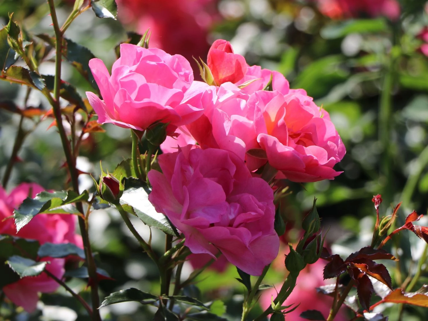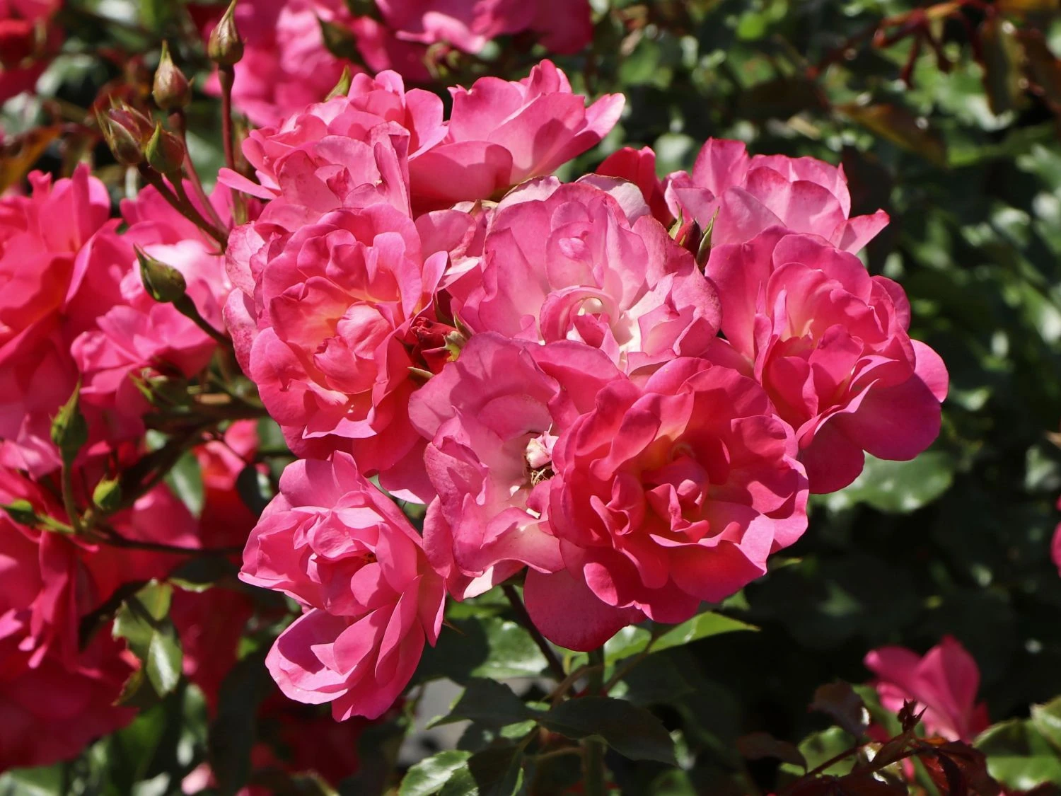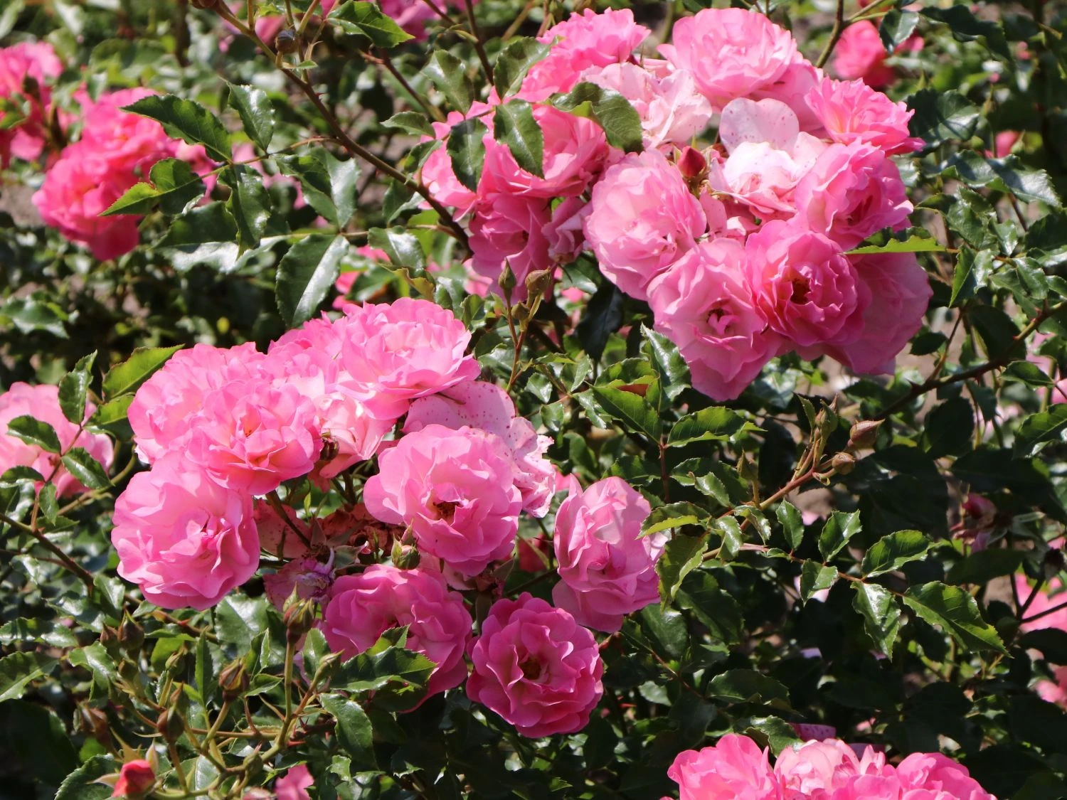 Die Beetrose / Bodendecker-Rose ‚Maxi Vita‘ ® hat sich mit ihrem niedrigen Wuchs und dem kräftigen Laub an unterschiedlichen Standorten bewährt und verschiedene Gartenschauen bereichert. Ab Juni bildet sie Blütenknospen, die sich zu einer lockeren Schalenblüte mit mehrfachen, kreisförmig angeordneten und gewellten Blütenblättern entfalten. Orangerosa leuchten die inneren Blütenblätter, die von rein rosa Blättern umschlossen sind. Ein Kranz gelb und dunkelbraun gefärbter Staubgefäße bilden die Blütenmitte. Das Farbenspiel wiederholt sich wochenlang an jeder Blüte und macht die Sorte zur Attraktion. Ihre Blüten sitzen in Tuffs am Ende der Zweige und ergeben einen wunderschönen Rosenstrauß. Gärtner setzen die Beetrose / Bodendecker-Rose ‚Maxi Vita‘ ® in ein Schnittblumenareal und ernten bis in die Herbstmonate zauberhafte Rosen. Gartenlose Rosenfreunde geben der Beetrose / Bodendecker-Rose ‚Maxi Vita‘ ® einen tiefen Kübel mit guter Kübelpflanzenerde. Sie freuen sich über eine gelungene und lang anhaltende Blütendekoration auf Balkon und Terrasse. Rosa ‚Maxi Vita‘ ® wächst mit kräftiger Wurzel in nährstoffreichem, gut drainiertem und tiefgründigem Boden. In Staunässe und verfestigtem Boden gedeiht sie nicht. Sie verträgt kleine Anteile Kalk, toleriert Sand, übersteht Hitzephasen gut und gedeiht in trockener Stadtluft. Raue Winde, Regen und feuchte Winter quittiert sie mit Blütensegen. Gärtner suchen einen luftigen, sonnigen Standort aus, der in den Mittagsstunden in dünnem Schatten liegt. Im Frühjahr erhält der Strauch Kompost, Kübelpflanzen bekommen Dünger. Im Freiland hält eine Schicht Mulch die Feuchtigkeit in der Erde. Der Strauch wächst locker, mit ähnlicher Höhe und Breite und erfordert keinen regelmäßigen Schnitt. Gartenfreunde beseitigen beschädigte Triebe zu jeder Zeit und kürzen lange Zweige im Frühjahr. Die Beetrose / Bodendecker-Rose ‚Maxi Vita‘ ® ist winterhart. Rosenfreunde begeistern sich für die malerischen Blüten und erfreuen sich viele Jahre an einem prächtigen Strauch.