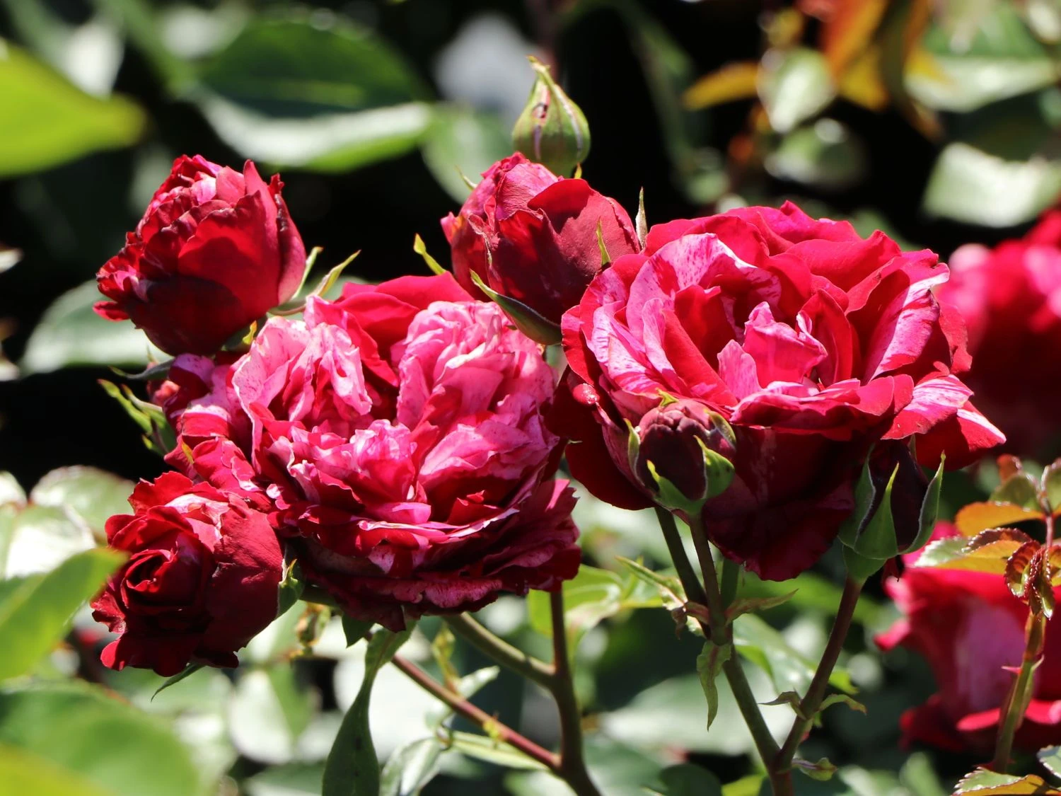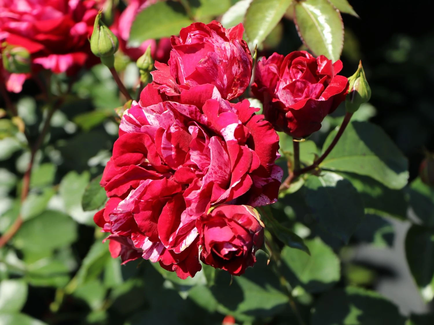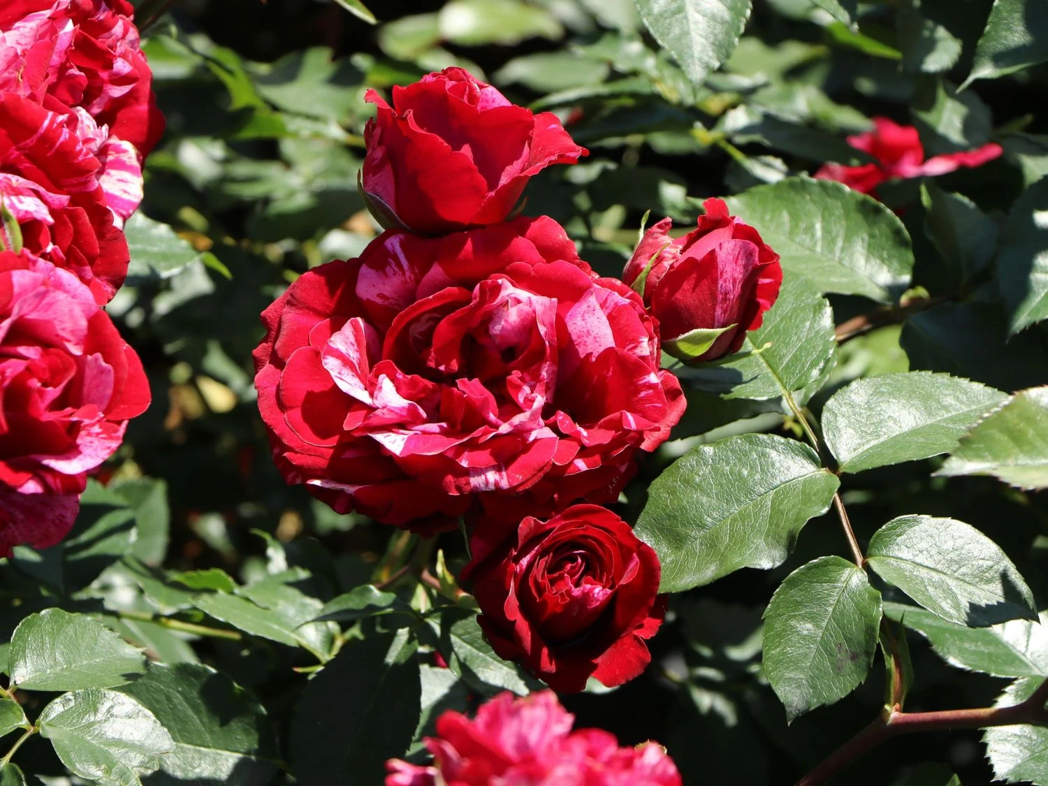 Die Beetrose ‚Deep Impression ®‘ setzt in jedem Garten einen besonderen farblichen Akzent. Die mittelgroßen, halbgefüllten Blüten der Pflanze bezaubern durch ihren dunkelroten Farbton, der wiederum mit pinken Streifen durchsetzt ist. Die Blütenköpfe sind in dunkelgrünes, glänzendes Laub eingebettet. Beides steht in einen schönen Kontrast zueinander. Die Beetrose ‚Deep Impression ®‘ verströmt einen leicht fruchtigen Duft, der an reife Himbeeren erinnert. Rosa ‚Deep Impression ®‘ blüht in der Zeit von Juni bis Oktober. Sie ist eine öfterblühende Sorte und erfreut durch den ganzen Sommer mit ihrer Blütenpracht. Das Entfernen verwelkter Blüten fördert das Wachstum neuer Blüten. Die Früchte der Beetrose sind Hagebutten. Diese haben einen süßlichen Geschmack und dienen Vögeln als winterliche Nahrungsquelle.