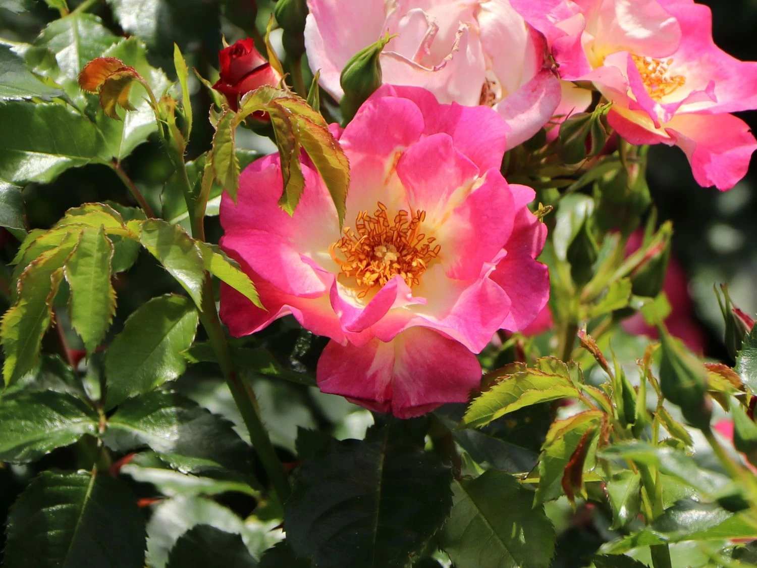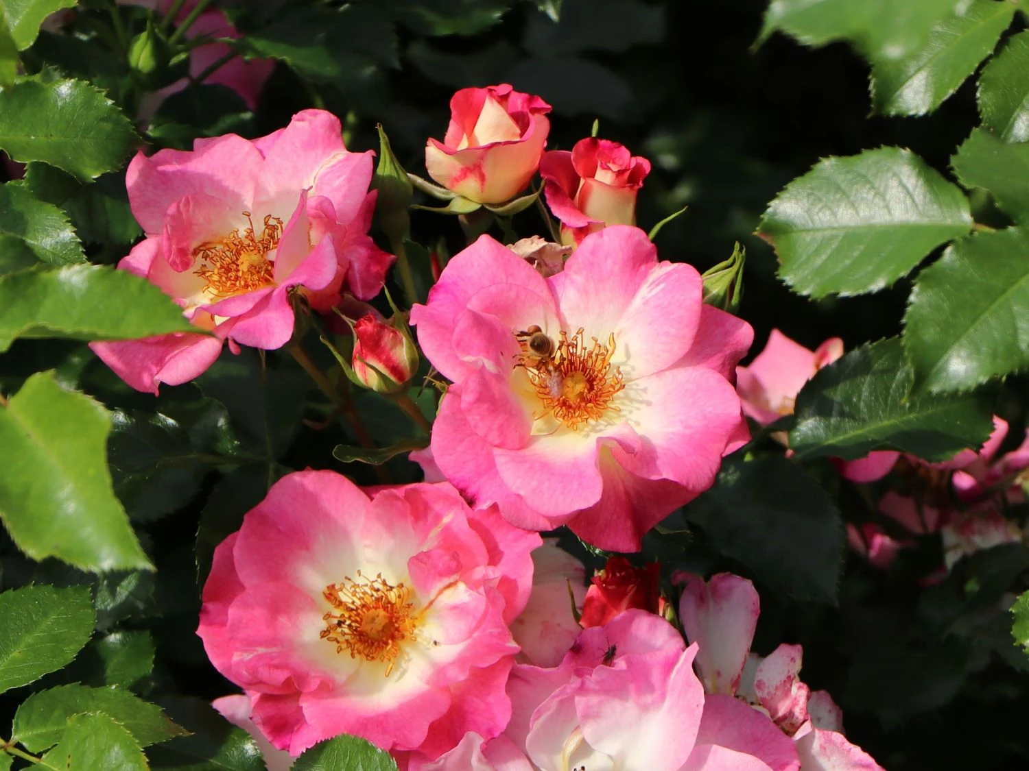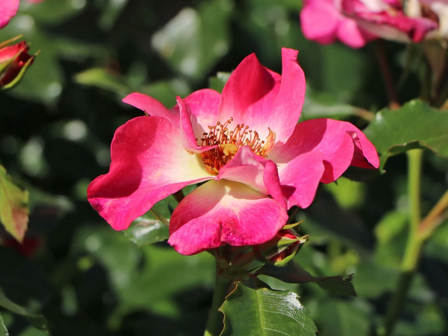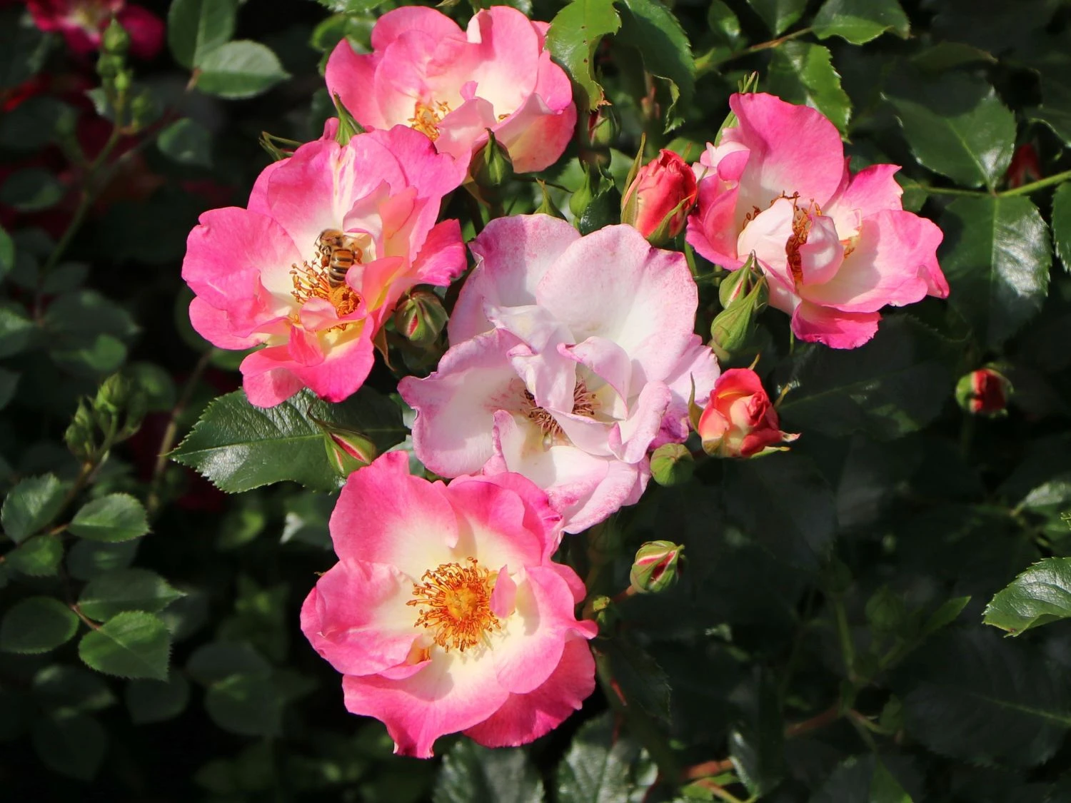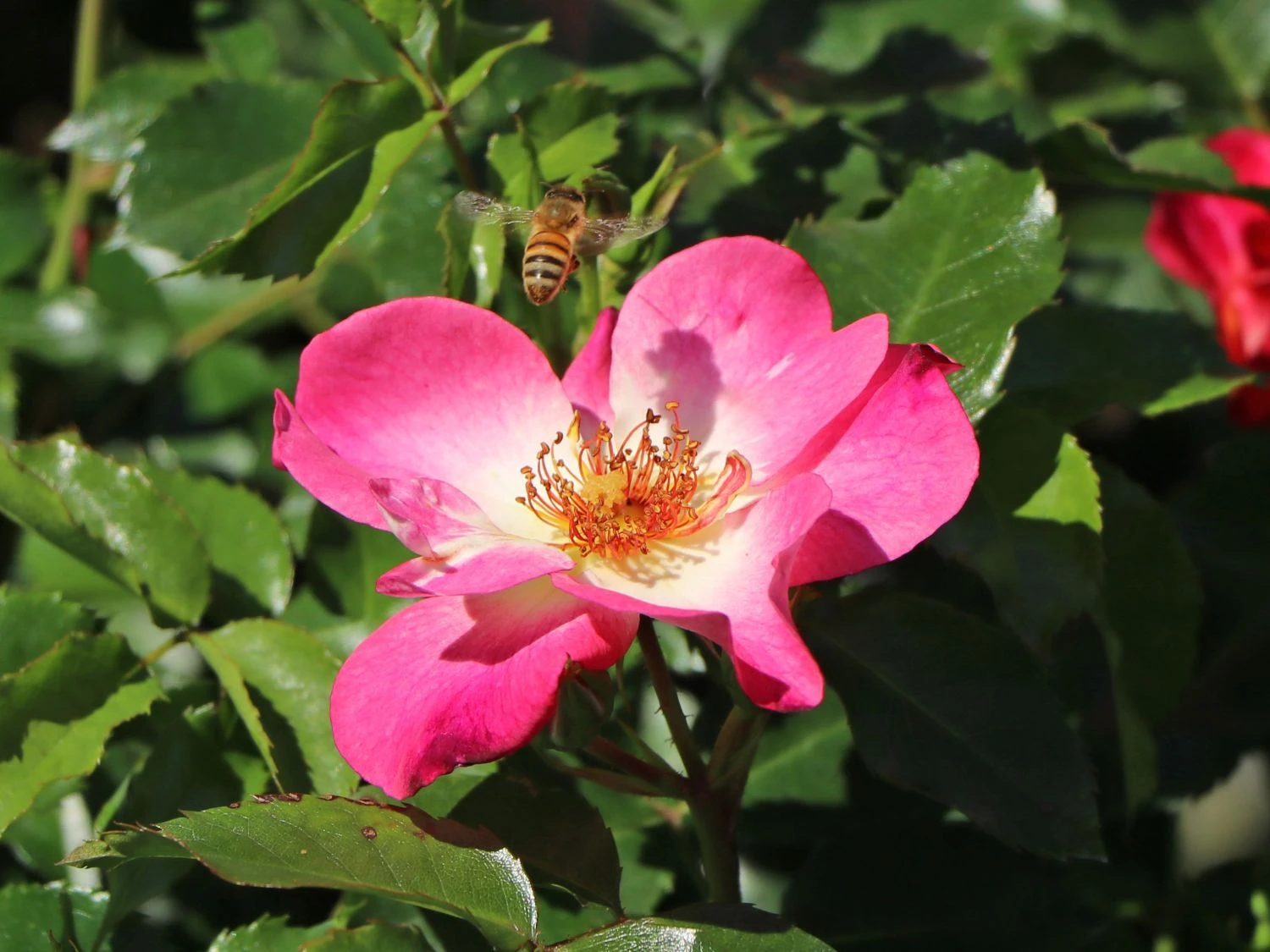 Beetrose ‚Dolomiti‘ ® ist eine magisch schöne Floribunda mit ungefüllten Blüten. Die Rosa ‚Dolomiti‘ ® ADR-Rose ist eine neuere Sorte aus dem Jahr 2009. (Bot.) Rosa ‚Dolomiti‘ ® ADR-Rose stammt aus der Gärtnerei W. Kordes‘ Söhne. Die Blüte ist ein Traum! Sie ist karmesinrosa und besitzt in der Mitte ein cremefarbenes Auge. Die Blüten werden bis zu fünf Zentimeter groß und ziehen mit ihrem feinen Duft Bienen und Hummeln an. Im Spätsommer bilden sich aus den wundervollen Blüten der Beetrose ‚Dolomiti‘ ® orangerote Hagebutten. Sie sind ein begehrtes Zusatzfutter für zahlreiche Tiere. Diese Beetrose besticht mit einem aparten Farbspiel von Juni bis in den September. Die Rose verzaubert jeden Garten mit ihrem romantischen Wildrosencharme. ‚Dolomiti‘ ® zählt zu den schönsten rosa Sorten. Ihre einfachen, offenen Blüten heben sich von den dunkelgrünen Laubblättern markant ab. Die mattglänzenden Blätter besitzen eine ledrige Textur, sind fiederförmig und zeichnen sich durch eine sehr hohe Blattgesundheit aus.