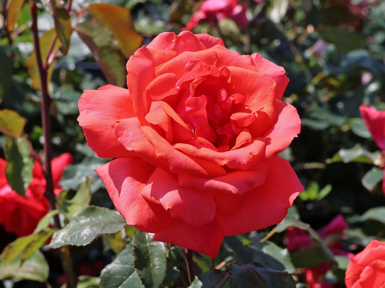 Die Beetrose / Edelrose ‚Duftwolke‘ ® fasziniert mit ihrem imposanten, reichen und lange blühenden Flor. Ihren Namen verdankt sie dem intensiven, betörenden Duft, der die Sinne verführt. Sie gehört zu den besonders früh und öfterblühenden Sorten. Im Juni öffnet sie die ersten wohlgeformten Knospen. Diese entfalten sich zu großen, üppig gefüllten Blüten, die den Gartenbesitzer bis September erfreuen. Die Blüten präsentieren sich in einem flammenden, weithin sichtbaren Korallenrot. Glänzend mittel- bis dunkelgrün zeigt sich das Laub der Rosa ‚Duftwolke‘ ®. Ihre gefiederten Blätter sind oval, laufen spitz zu und weisen einen gesägten Rand auf. Die Beetrose / Edelrose ‚Duftwolke‘ ® wächst aufrecht, buschig und gut verzweigt. Sie erreicht eine Höhe von 50 bis 80 cm und eine Breite von 30 bis 50 cm. 1963 von dem renommierten Rosenzüchter Tantau eingeführt, erhielt die Sorte bereits zahlreiche Preise. Dazu gehören das Prädikat ADR-Rose, die Auszeichnung als „Weltrose“ des Jahres 1981 und die Wahl zur besten Duftrose aller Zeiten im Rosendorf Steinfurth.
