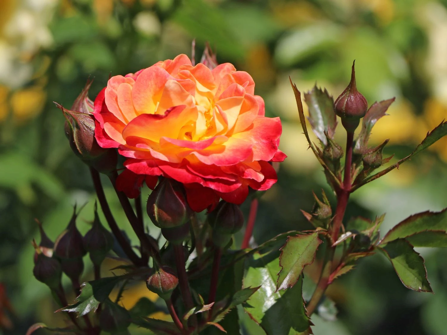 Die Beetrose ‚Firebird‘ ® zählt mit ihren farbintensiven Blüten zu den Stars in jedem Garten! Ihre auffällige Blütenpracht ist von einem kräftigen Gelb, eingerahmt von einem noch intensiveren Rot. Von Juni bis in den Oktober läuft dieses Rosenwunder zu seiner Höchstform auf. Rosa ‚Firebird‘ ® ist eine Attraktion, die vielen anderen Pflanzen im Garten die Show stiehlt! Die breitbuschige Beetrose stammt aus dem Jahre 2015 und ist eine Züchtung aus dem Hause Kordes‘ Söhne. Benannt ist der „Feuervogel“ mit seinen an lodernde Flammen erinnernden Blüten nach der deutschlandweit größten Feuerwehr-Benefiz-Veranstaltung „Appen musiziert“. Wohl niemand kann sich dem gelbroten Farbrausch der Rosa ‚Firebird‘ ® im Garten entziehen! Was für ein Blütenwunder! Die gefüllten gelben Blüten erhalten beim Aufblühen eine intensive leuchtend rote Farbe. Ein großartiges Farbspiel, das sich durch das dunkelgrüne, glänzende Laub noch steigert. Die mittelgroßen schalenförmigen Blüten stehen in Dolden an den Zweigen. Die munter „lodernden“ Blüten haben einen Durchmesser von sechs bis sieben Zentimeter. Sie sind locker gefüllt und verströmen keinen Duft. Die ganze Ausdruckskraft der ‚Firebird‘ ® liegt in ihrer lebhaften Farbintensität. Die Beetrose mit dem feurigen Farbspiel wächst aufrecht und buschig. Rosa ‚Firebird‘ ® zeichnet sich als reich blühende Gartenschönheit aus. Wie überschwänglich sich die ausgezeichnete (Prix du public Le Roeulx) Beetrose mit ihren auffälligen Blüten bis in den Herbst schmückt! Ein absolutes Highlight in jedem Garten.