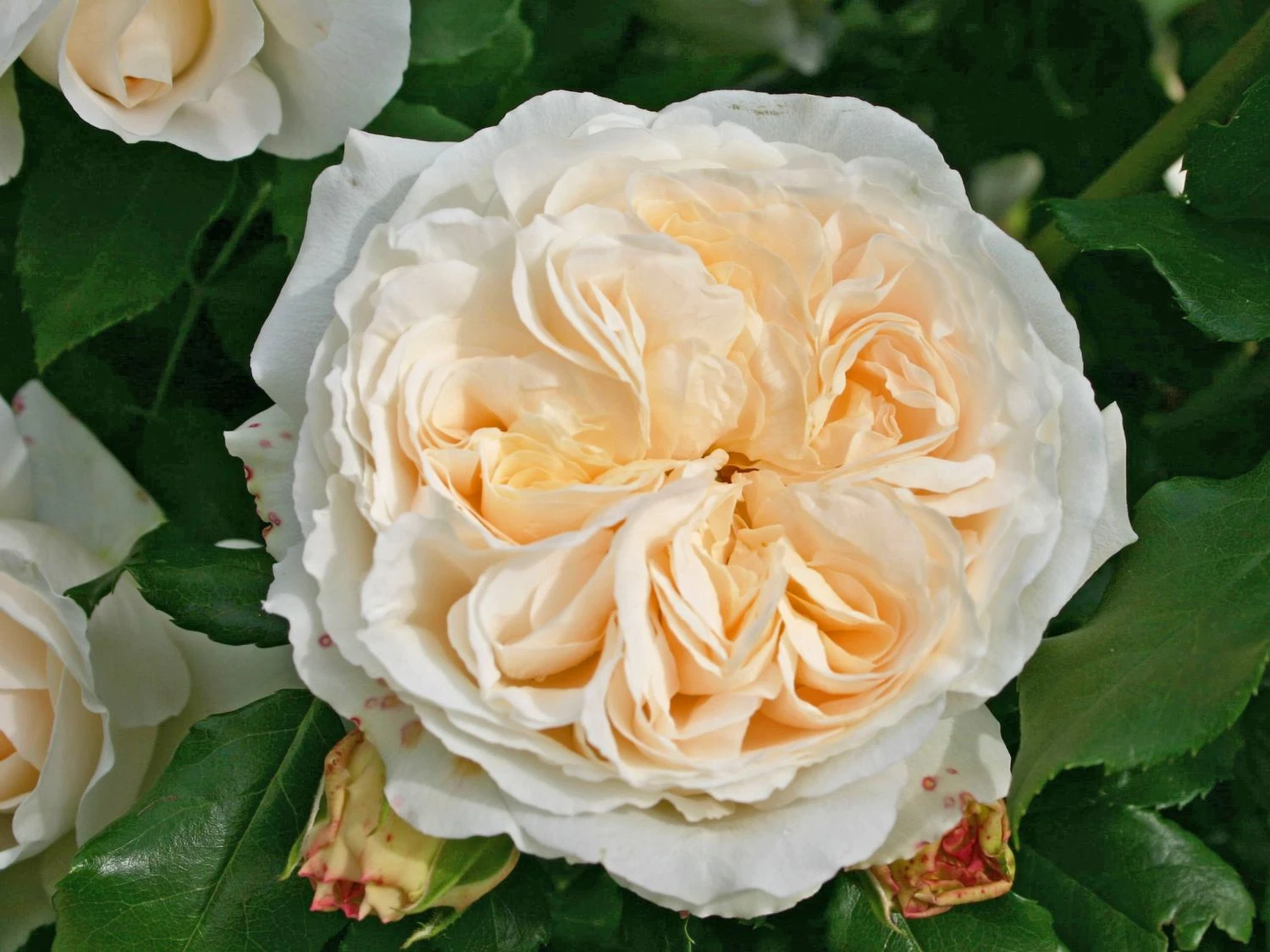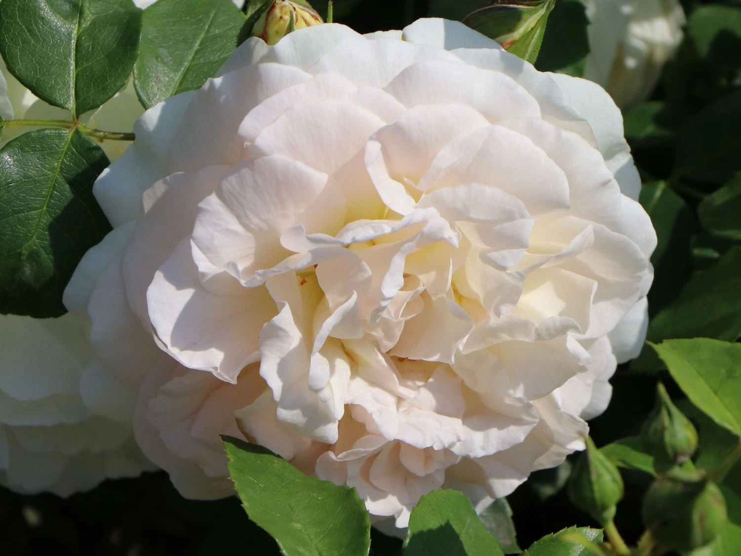 Die laubabwerfende Beetrose besitzt gefiederte Blätter. Sie sind mittelgrün und heben das Cremeweiß der Blüten fantastisch hervor. Die Beetrose ‚Kosmos‘ ® / ‚Brindisi‘ bevorzugt einen sonnigen bis halbschattigen Standort. Sie ist nicht wählerisch, was den Boden betrifft. Die Beetrose gedeiht auf humosem, tiefgründigem und frischem Untergrund. Sie schmückt Beete, Rabatten und Freiflächen. Traumhaft schön sieht sie auch im Kübel für die Terrasse oder den Balkon aus. Die Beetrose geht gerne harmonische Partnerschaften mit Stauden oder zarten Gräsern ein. Wunderbar sieht die Beetrose ‚Kosmos‘ ® / ‚Brindisi‘ in Kombination mit blau blühendem Rittersporn, Salbei oder Lavendel aus. Die Rosa ‚Kosmos‘ / ‚Brindisi‘ ADR-Rose ist robust und winterhart. Bei starken Kahlfrösten bedeckt der Gärtner den Boden um die Rose mit einer Schicht Reisig. Der beste Zeitpunkt für einen Rückschnitt ist das Frühjahr. Die beste Pflanzzeit für diese Beetrose ist ganzjährig an frostfreien Tagen. Beim Pflanzen achtet der Gartenfreund darauf, dass die Veredelungsstelle etwa fünf Zentimeter unter der Erdoberfläche liegt. Diese Beetrose begeistert jeden Betrachter mit ihren gefüllten Blüten.