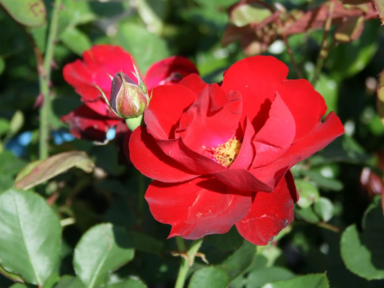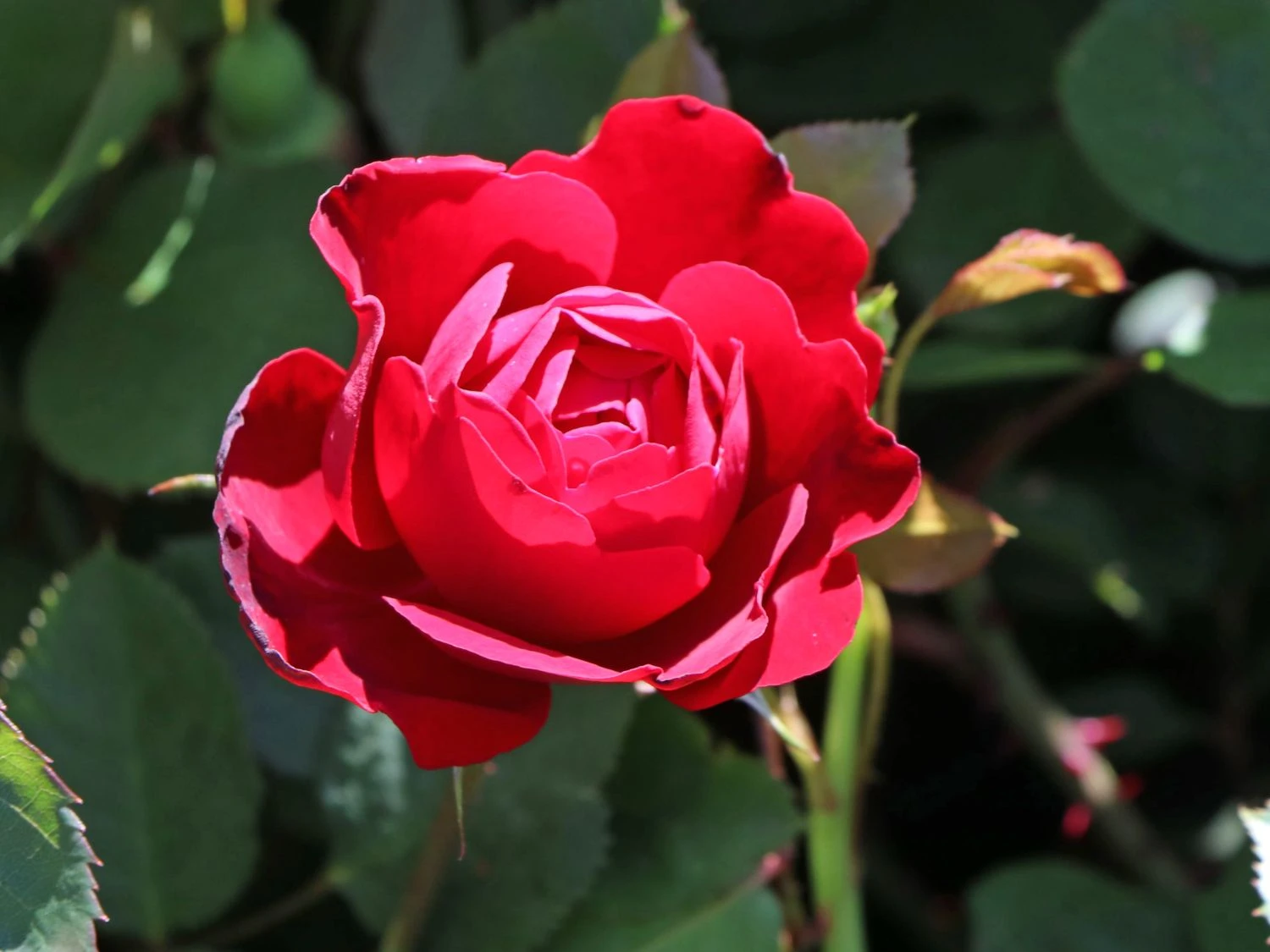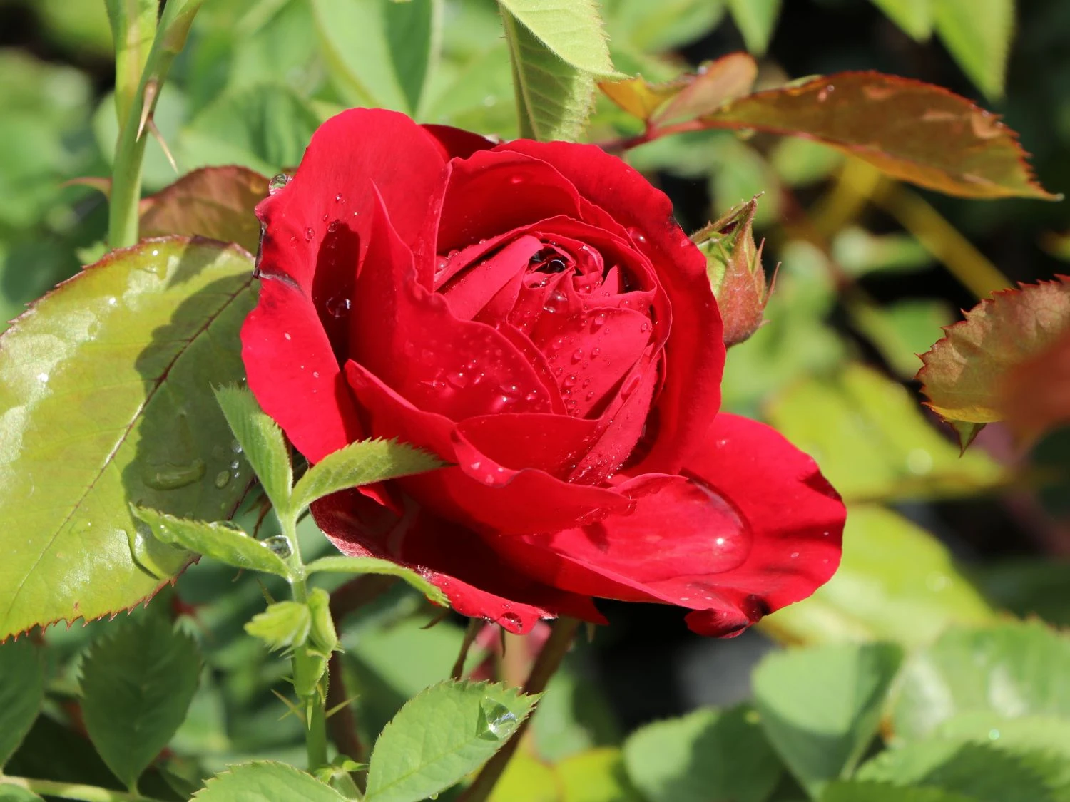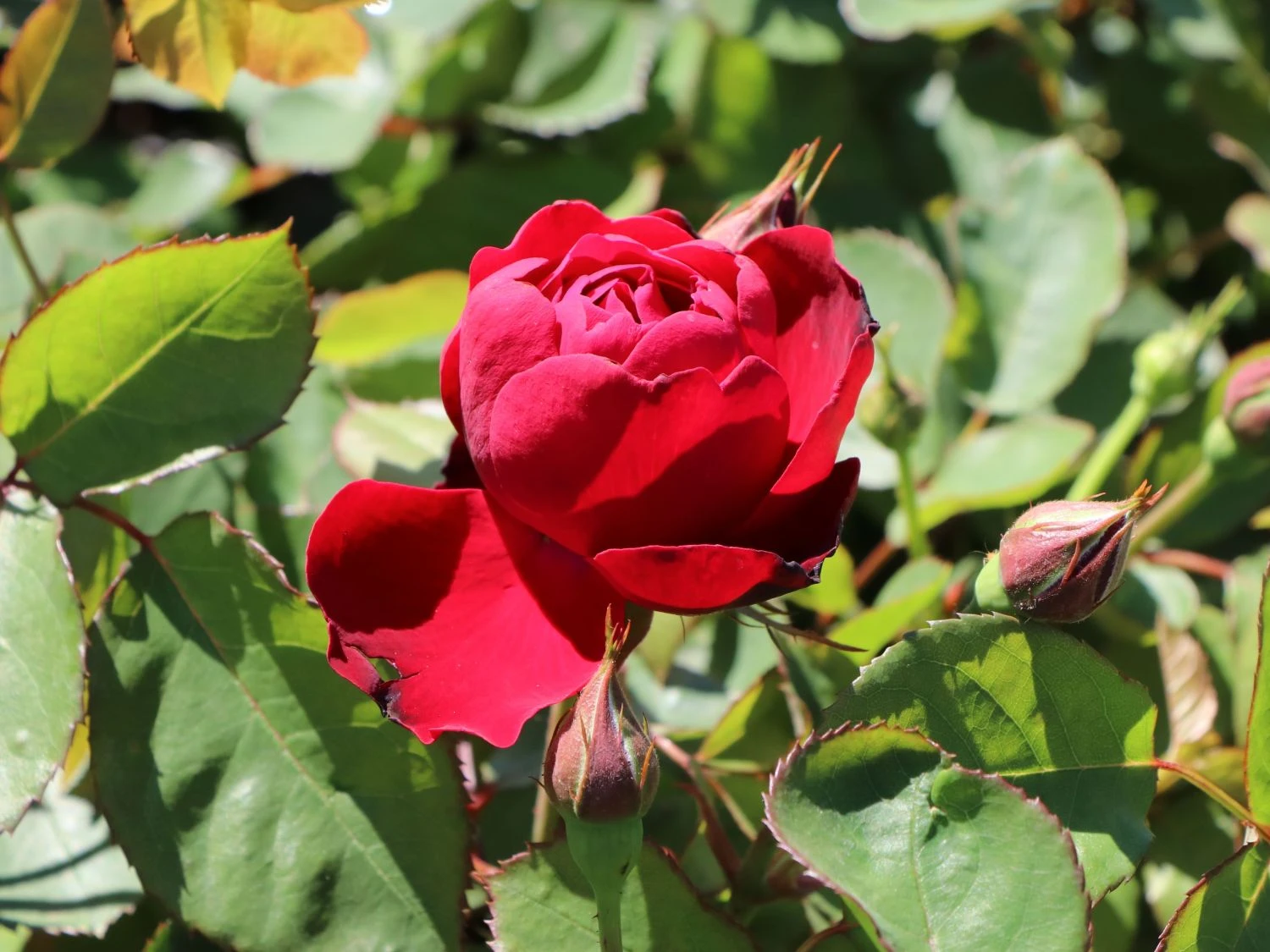 Der Name dieser Sorte ist eine Reminiszenz an das berühmte gleichnamige Lied. Das sattgrüne Laub dieser Rose sorgt für einen markanten Kontrast zu den Blüten. Auch abseits der Blütezeit ist die Pflanze durch die gefiederten Blätter ein schöner Anblick. Die Beetrose ‚Lilli Marleen‘ ® gedeiht an sonnigen oder halbschattigen Plätzen. Idealerweise ist der Untergrund humos, tiefgründig und gut durchlässig. Bei sommerlicher Hitze benötigt Rosa ‚Lilli Marleen‘ ® regelmäßige Wassergaben. Dabei kommt es darauf an, dass die Erde zwischendurch gut abtrocknet, damit keine Staunässe entsteht. die Beetrose ‚Lilli Marleen‘ ® benötigt keinen Winterschutz. Lediglich bei starken Kahlfrösten schützt der Gärtner die Pflanze mit Reisig oder Vlies. Die beste Zeit für einen Rückschnitt ist das Frühjahr. Dann kürzt der Rosenfreund die bedornten Triebe ein.