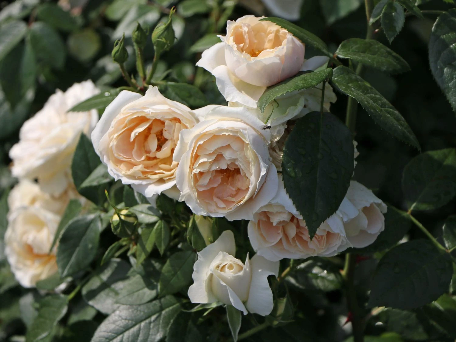 Die Beetrose ‚Lions-Rose‘ verzaubert mit nostalgischem Flair. Sie zählt zur Serie der Märchenrosen des renommierten Rosenzüchters W. Kordes‘ Söhne. Diese sagenhafte Sorte ist seit 2002 auf dem Markt und erhielt im selben Jahr das ADR-Prädikat. Denn sie ist nicht alleine blütenreich und ein traumhafter Anblick, ihre Blattgesundheit und robuste Art machen sie zur idealen Wahl für jeden Garten. Die (bot.) Rosa ‚Lions-Rose‘ ADR-Rose zählt zu den schönsten weißen Beetrosen. Die Blüten der Beetrose ‚Lions-Rose‘ sind gefüllt und zeichnen sich durch den besonderen zarten Apricot- und Rosaton im Aufblühen aus. Die Blüten sind edel und romantisch zugleich. Sie verströmen einen harmonischen Duft. Die Rosa ‚Lions-Rose‘ ADR-Rose ist eine Attraktion im Rosengarten und zieht alle Blicke an. Schon im Frühjahr wecken die rosa Knospen der Beetrose ‚Lions-Rose‘ die Vorfreude eines jeden Gärtners auf die Blütezeit der Beetrose. Diese beginnt im Juni und dauert bis in den September. Die Rose blüht ununterbrochen, ihre unzähligen Blüten stehen in Dolden an den Trieben. Sie erreichen eine Größe von 5 bis 10 cm. Die Beetrose wächst breitbuschig und aufrecht. Sie ist wuchsfreudig und erreicht eine maximale Wuchshöhe von 70 cm. Die Beetrose ‚Lions-Rose‘ streckt sich circa einen halben Meter in die Breite. mit ihren märchenhaften Blüten ist sie ein Juwel im Gartenbeet und schmückt gleichsam Rabatten und Freiflächen. Auch im Pflanzkübel oder Töpfen ist sie auf der Terrasse oder dem Balkon ein willkommener Anblick.