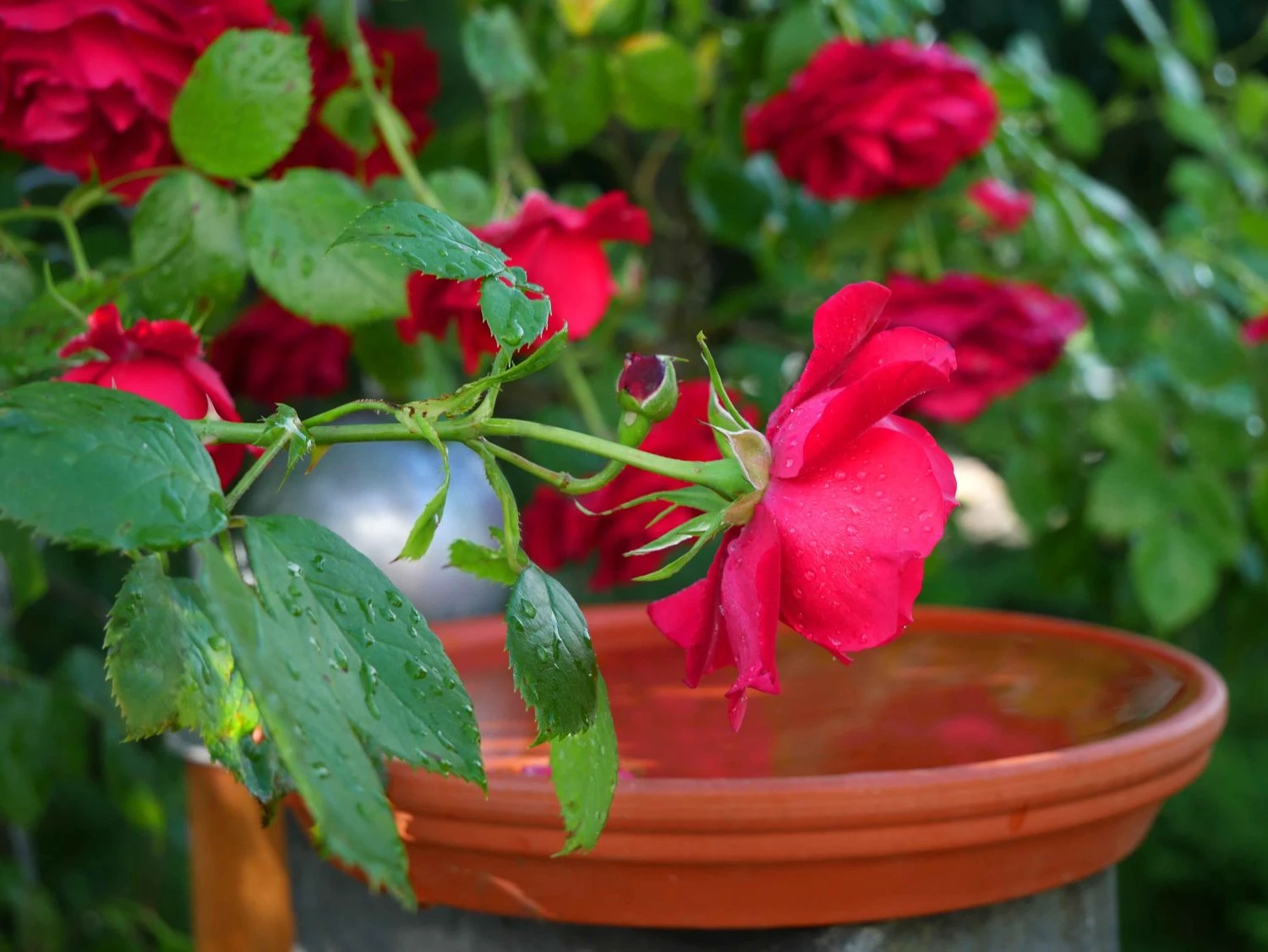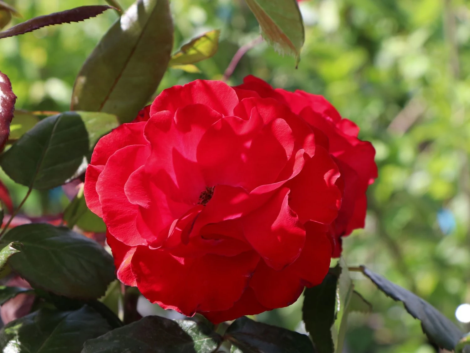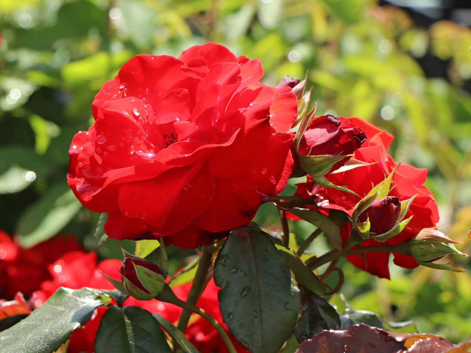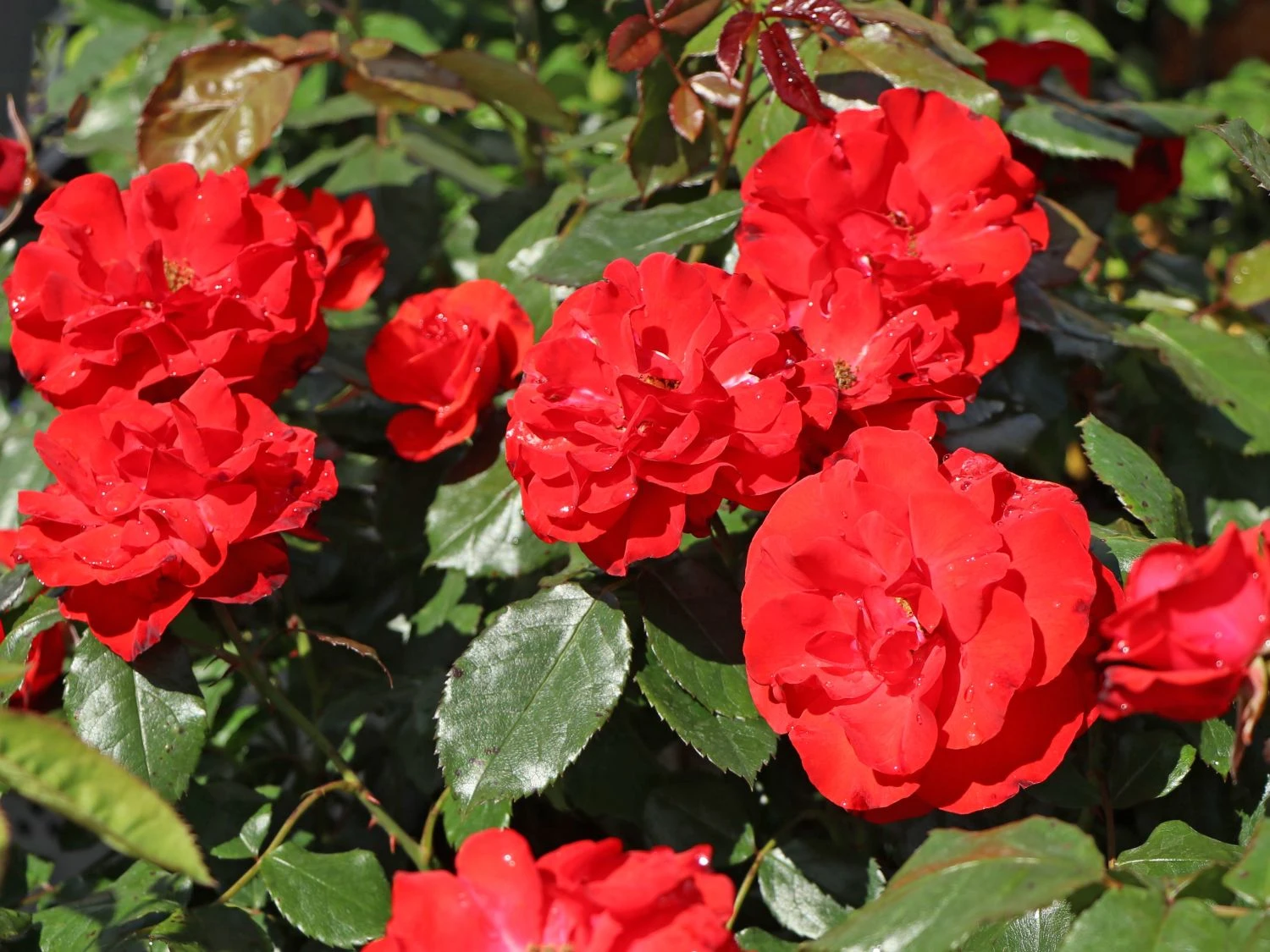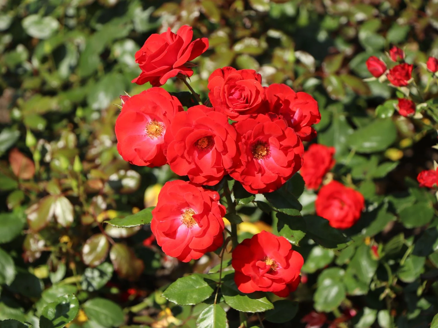 Die roten Blüten sind mittelgroß und erreichen im Durchmesser 5 bis 10 cm. Sie stehen in Büscheln an den stabilen Zweigen. Markant heben sie sich von den dunkelgrünen Laubblättern ab. Die Blätter sind gefiedert und lederartig. Die Rosa ‚Montana‘ ® erweist sich als robust und unkompliziert. Die Beetrose gedeiht am besten an einem sonnigen bis halbschattigen Standort. Optimal ist ein humoser, tiefgründiger, frischer und gut durchlässiger Boden. Sind diese Grundlagen gegeben, entwickelt sich diese rotblühende Rose zu einem Hingucker im Garten. Vor allem in einer Pflanzgruppe überzeugt die blühfreudige Beetrose ‚Montana‘ ® jeden Rosenliebhaber. Auf einem Quadratmeter finden zwischen 5 und 6 Pflanzen dieser Sorte Platz. Der Gärtner putzt die verblühten Blüten regelmäßig aus. Die Beetrose bildet kontinuierlich neue Blüten nach. Die Beetrose ‚Montana‘ ® ist winterhart und benötigt keinen besonderen Schutz. Nur bei starken Kahlfrösten schützt der Rosenfreund den Wurzelbereich mit Reisig oder Mulch. Im Frühjahr schneidet der Gärtner die Triebe um die Hälfte zurück. Damit spornt er die Beetrose ‚Montana‘ ® zu einem frischen Austrieb an.