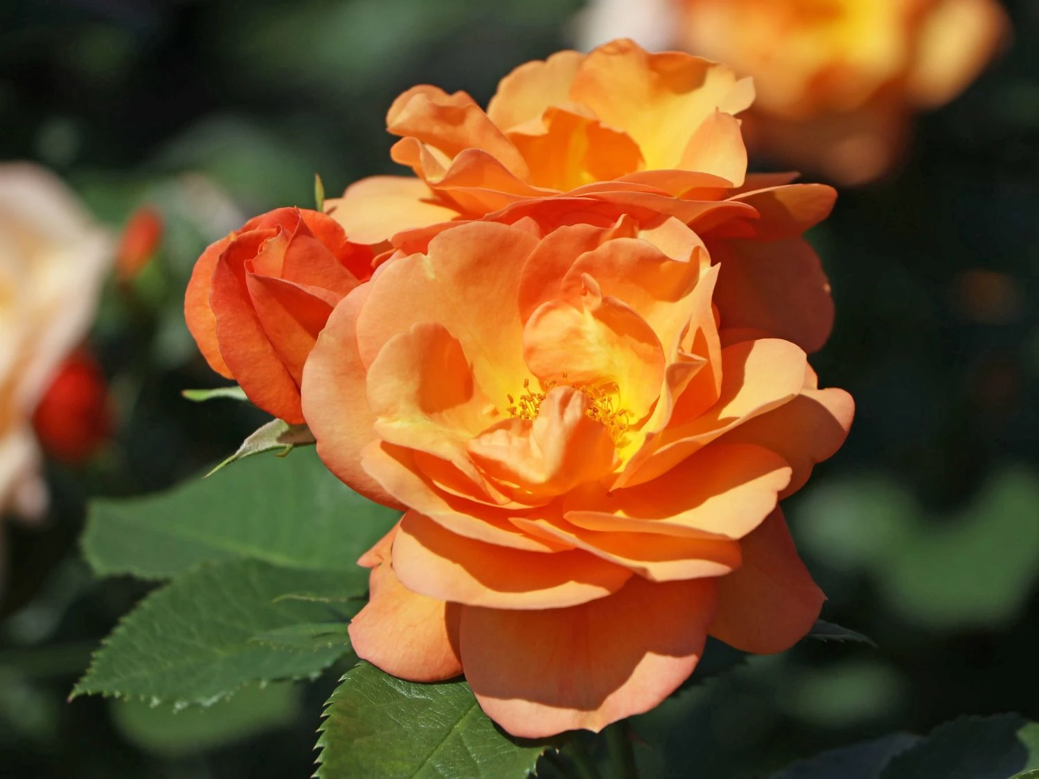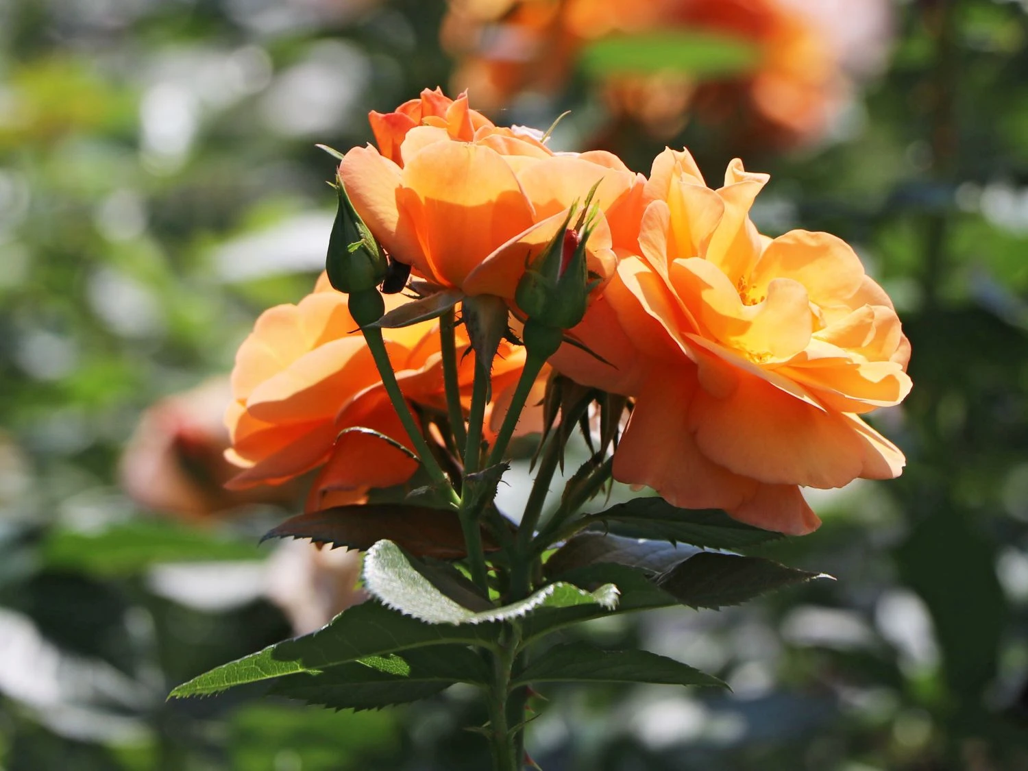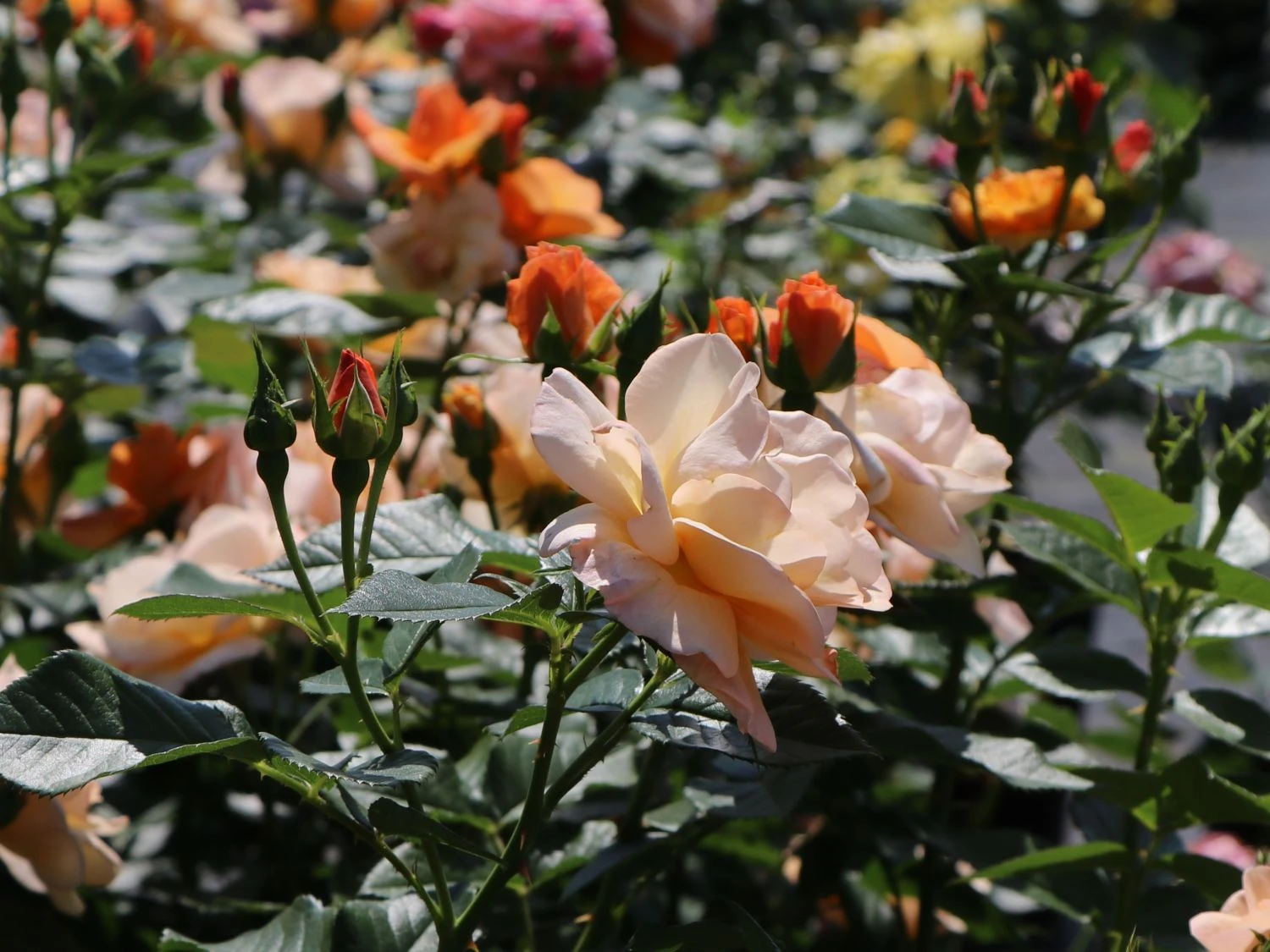 Dank ihrer üppigen Blütenpracht schmückt die Beetrose ‚Portoroz‘ ®, botanisch Rosa ‚Portoroz‘ ® jede Grünfläche. Von leuchtendem Orange, über intensive Lachstöne bis ins zarte Apricot reicht die Farbvielfalt der Rose. Der kräftige, warme Ton der Blütenblätter wird mit zunehmendem Alter der Blütenstände blasser. Es entsteht eine atemberaubende Optik mit den Nuancen einer ganzen Farbkarte. Dies bring Lebendigkeit und Frische in den Garten. Schalenförmig und locker gefüllt, sind die circa sieben Zentimeter großen Blütenköpfe. Sie ragen aus einem buschigen Blattwerk hervor. Dieses bildet in glänzendem Mittelgrün einen stimmigen Hintergrund für die farbenfrohen Blüten. Der Duft der Beetrose ‚Portoroz‘ ® ist fein und lieblich. Die leicht fruchtige Note harmonisiert gut mit weiteren Duftpflanzen. Durch eine regelmäßige Knospenbildung blüht das Rosengewächs stetig von Juni bis in den Herbst. Ihr ansprechendes Äußeres bewahrt sich die Rosa ‚Portoroz‘ ® aufgrund ihrer selbstreinigenden Eigenschaft. Verwelkte Blätter fallen ab und schaffen Platz für neue Triebe.