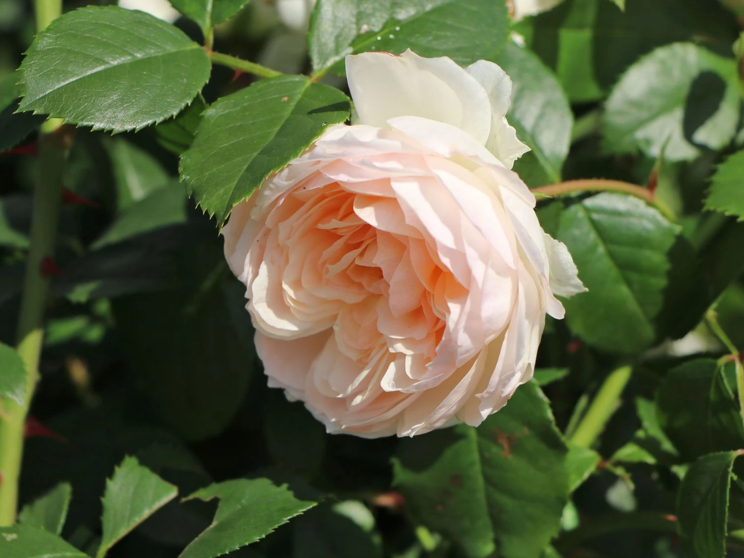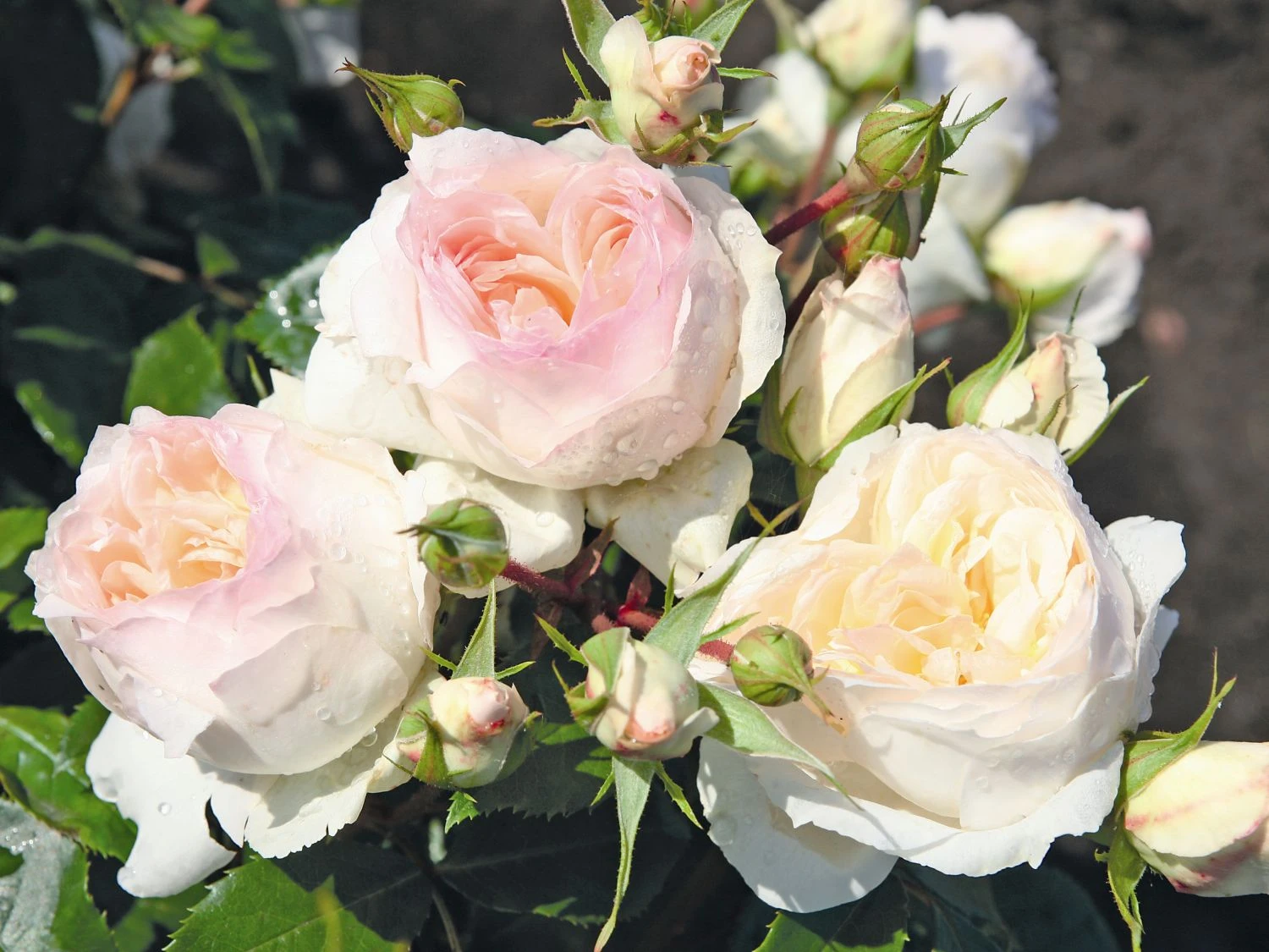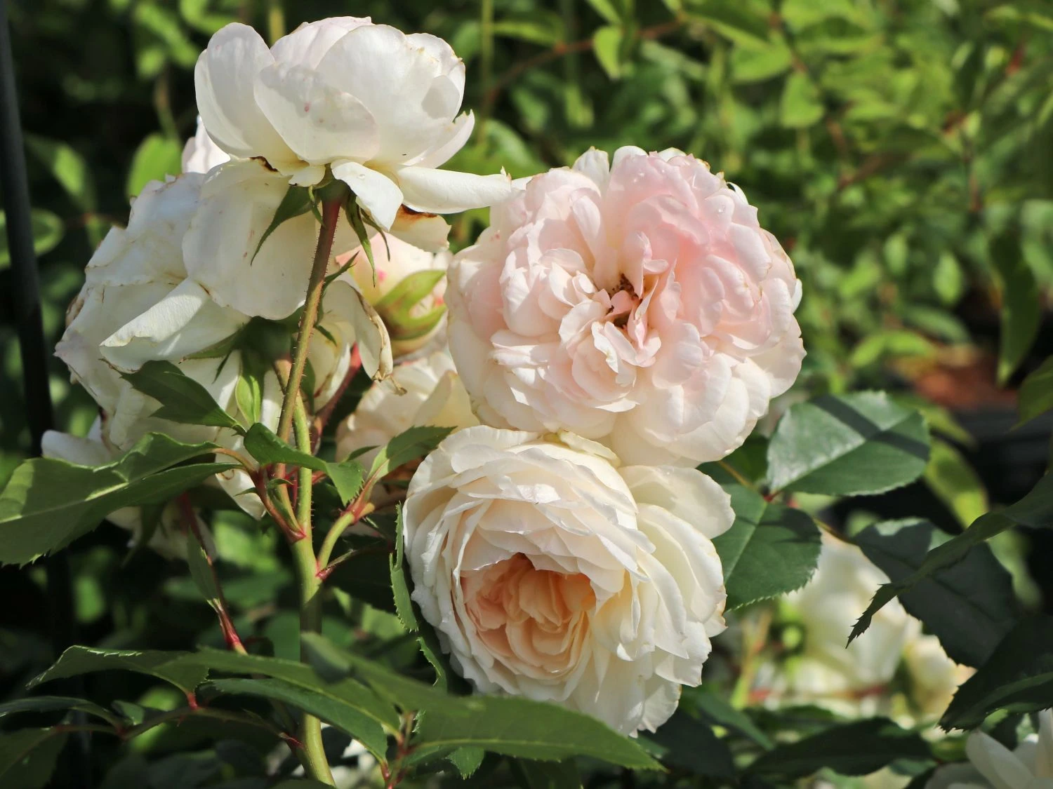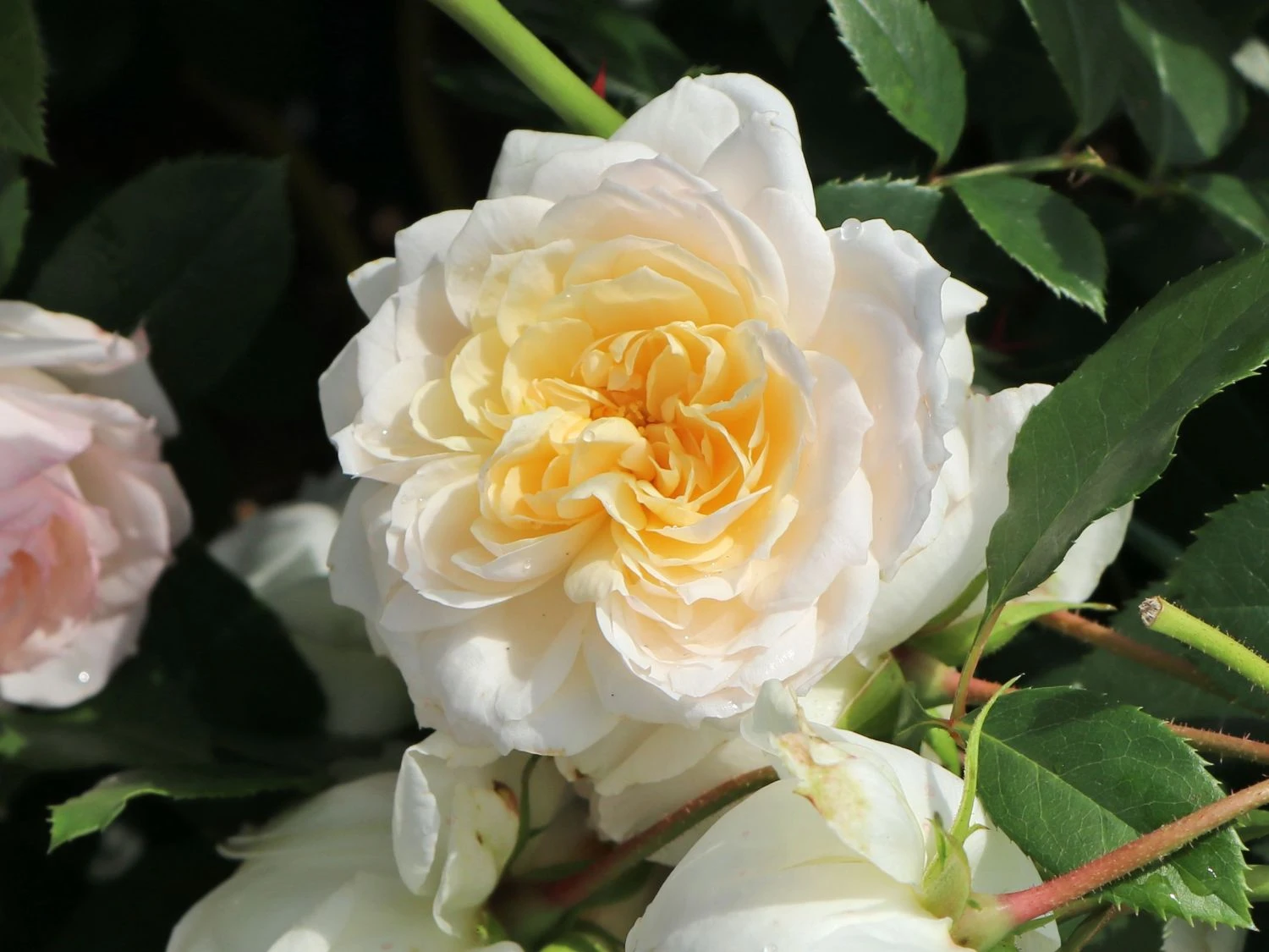 Die Blätter der Beetrose ‚Stephanie Baronin zu Guttenberg‘ sind gefiedert und dunkelgrün. Dadurch heben sie das cremige Weiß der Blüten perfekt hervor. Die Rosa ‚Stephanie Baronin zu Guttenberg‘ bevorzugt einen sonnigen bis halbschattigen Standort im Garten. Am besten entwickelt sich die Beetrose auf einem humosen, frischen und tiefgründigen sowie gut drainierten Boden. Bei sommerlicher Hitze benötigt die Rose regelmäßige Wassergaben. Der Gärtner schneidet die verblühten Blüten regelmäßig ab, damit das Erscheinungsbild perfekt bleibt und die Beetrose frisch wieder austreibt. Die Beetrose ‚Stephanie Baronin zu Guttenberg‘ ist ein aparter Solitär. Fabelhaft wirkt sie auch in einer Gruppe von 3 bis 5 Exemplaren pro Quadratmeter. Die Rose ist bedingt winterhart. Ein Winterschutz aus Vlies oder Mulch ist bei Kahlfrösten und in ungünstigeren Lagen empfehlenswert.