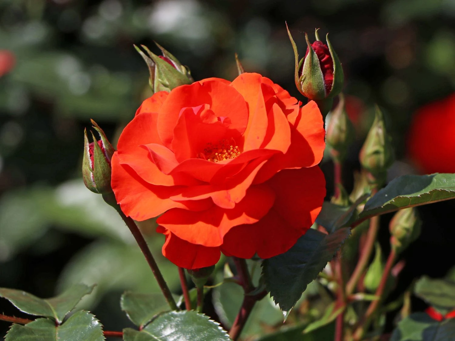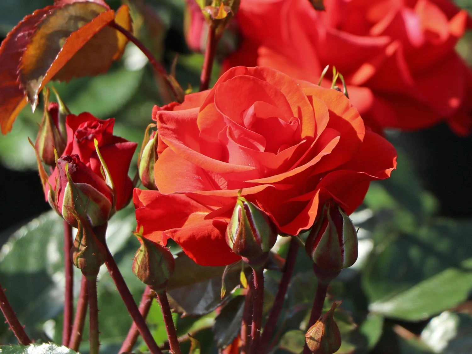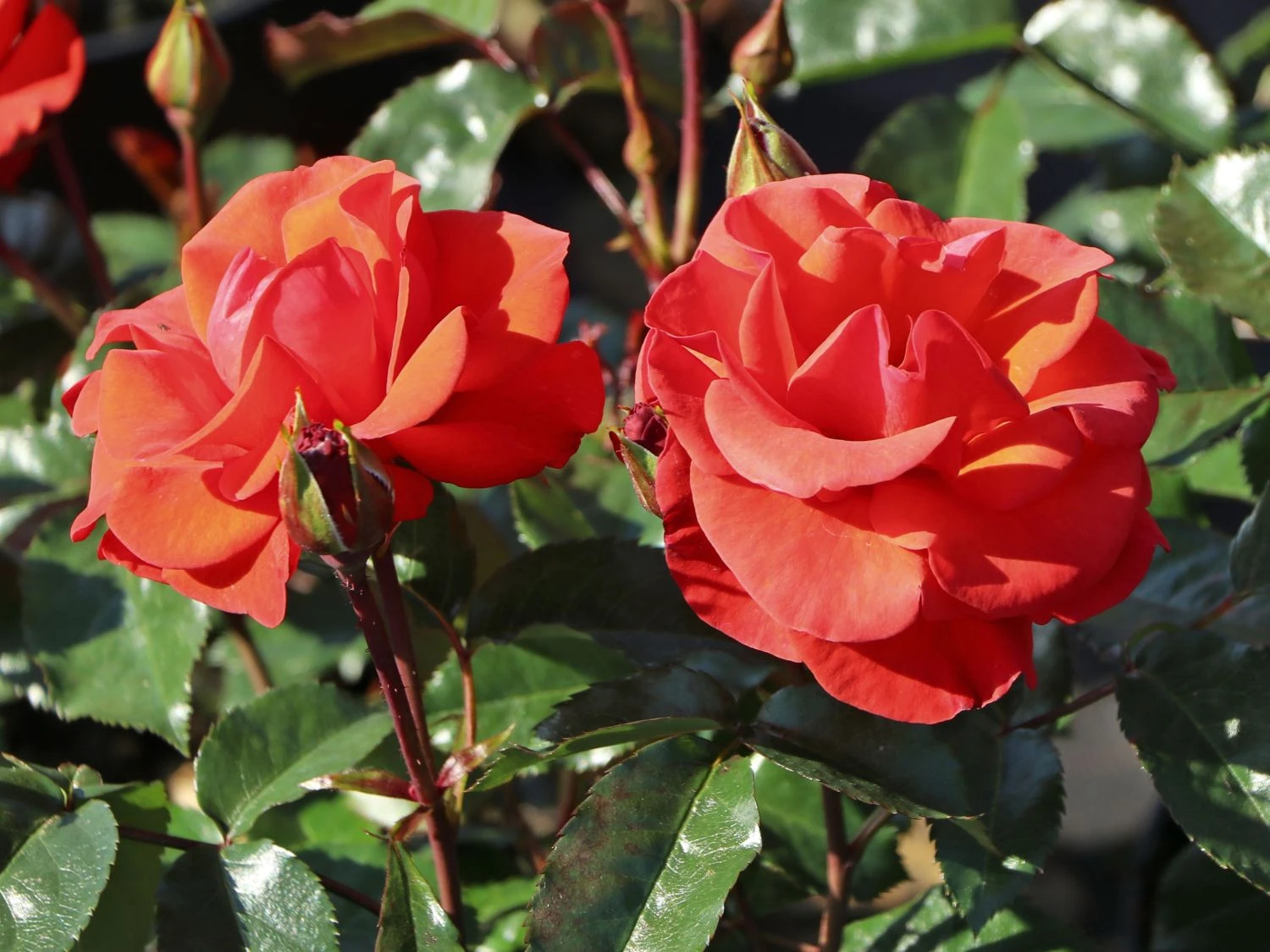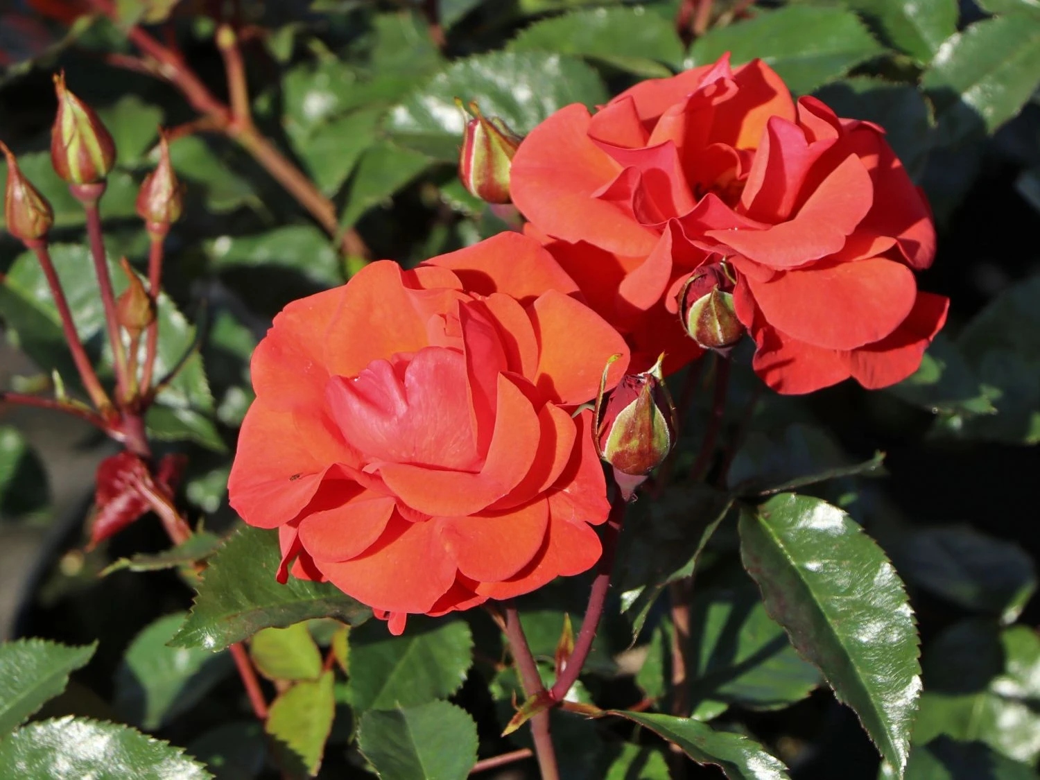 Die Beetrose ‚Westpoint‘ ® wirkt wie ein gigantisches Leuchtfeuer im Garten und zieht mit ihrer farblichen Intensität die Blicke auf sich. Als wäre die Farbe der Blüten nicht schon aussagekräftig genug, wird sie zudem durch das dunkelgrüne und glänzende Blattwerk kontrastreich hervorgehoben. Die schöne Belaubung von (bot.) Rosa ‚Westpoint‘ ® zeigt sich im Austrieb – ebenso wie die Triebe – rötlich gefärbt. Ab etwa Mitte Mai zeigen sich die ersten üppigen Blütendolden und versprechen einen farbgewaltigen Sommer. Die Beetrose ‚Westpoint‘ ® ist eine öfterblühende Sorte, daher lässt sich das farbliche Schauspiel der blutorangen Blüten bis in den Herbst bewundern. Ständig bilden sich neue Knospen und blühen unermüdlich bis in die Tage der ersten Fröste. Diese großartige Sorte ist eine Züchtung aus dem Hause Noack und stammt aus dem Jahr 2011.