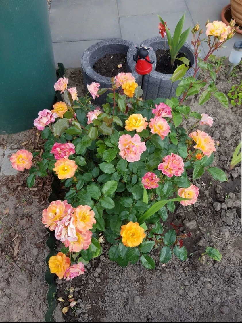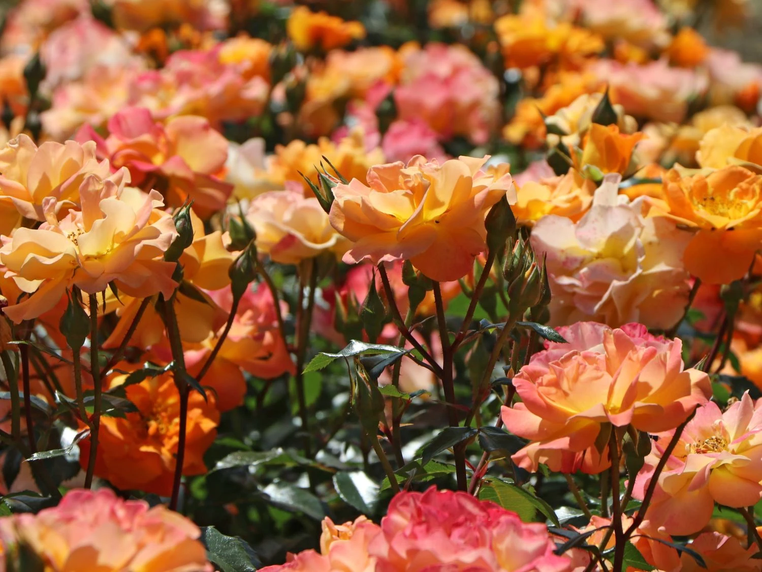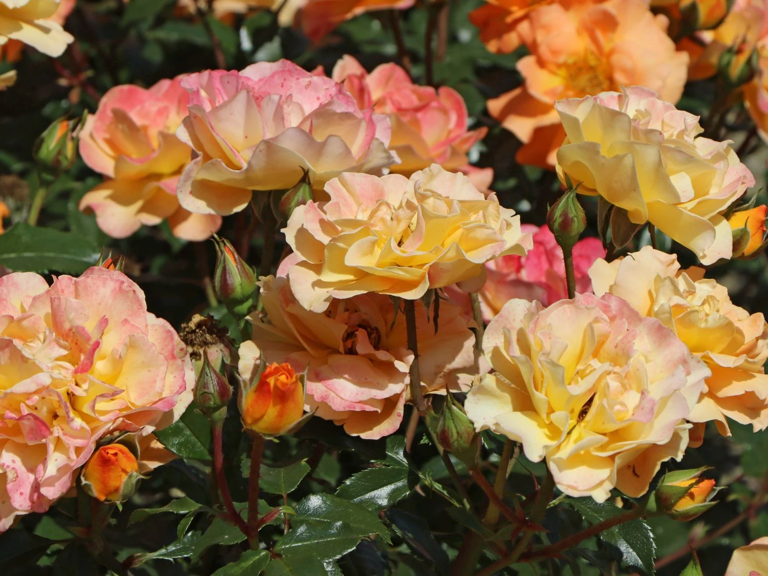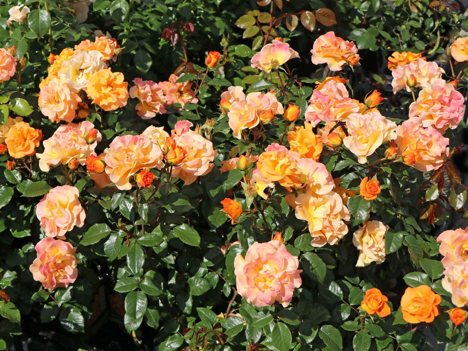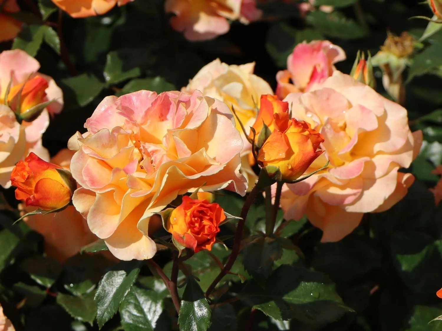 Die Beetrose ‚Westzeit‘ ® bezaubert mit locker halbgefüllten Blüten. Die (bot.)Rosa ‚Westzeit‘ ® ADR-Rose begeistert mit ihrem farbenfrohen Blütenspiel, das von orange bis rosa und apricot changiert. Diese schöne Beetrose ist öfter blühend und erobert durch ihre Farbbrillanz und Wuchskraft die Herzen vieler Rosenfreunde. ‚Westzeit‘ ® ist eine früh blühende Sorte. Sie präsentiert sich von Mai bis Oktober in bester Blühlaune und bildet kontinuierlich neue, zart duftende Blüten. Diese stehen einzeln in Dolden an den kräftigen Zweigen. Sie können bis zu sechs Zentimeter groß werden und nehmen es mit der Eleganz. Sie wächst aufrecht und breitbuschig und erreicht eine maximale Wuchshöhe von 70 Zentimeter. Die Blätter der sommergrünen Beetrose ‚Westzeit‘ ® glänzen elegant und harmonieren großartig mit den charmanten Blüten. Die Beetrose bevorzugt einen sonnigen bis absonnigen Standort. Am besten gedeiht ‚Westzeit‘ ® auf einem tiefgründigen, frischen, humosen und gut durchlässigen Untergrund.