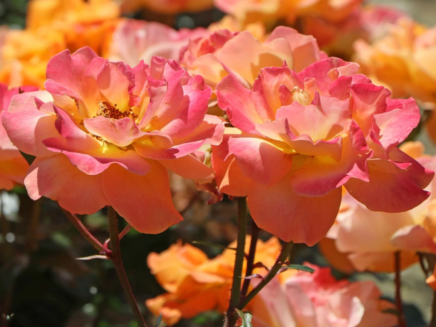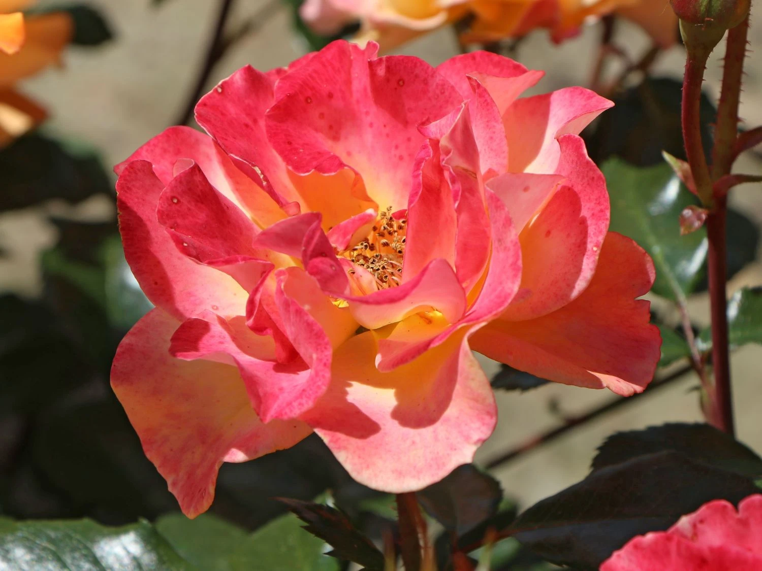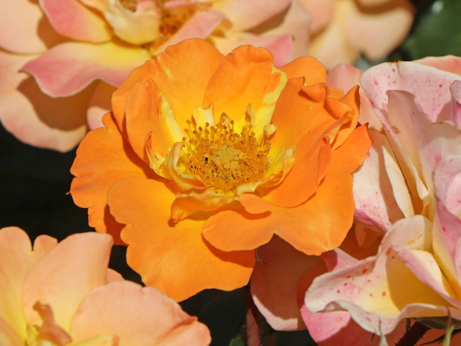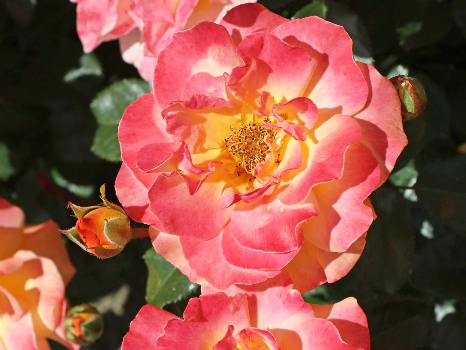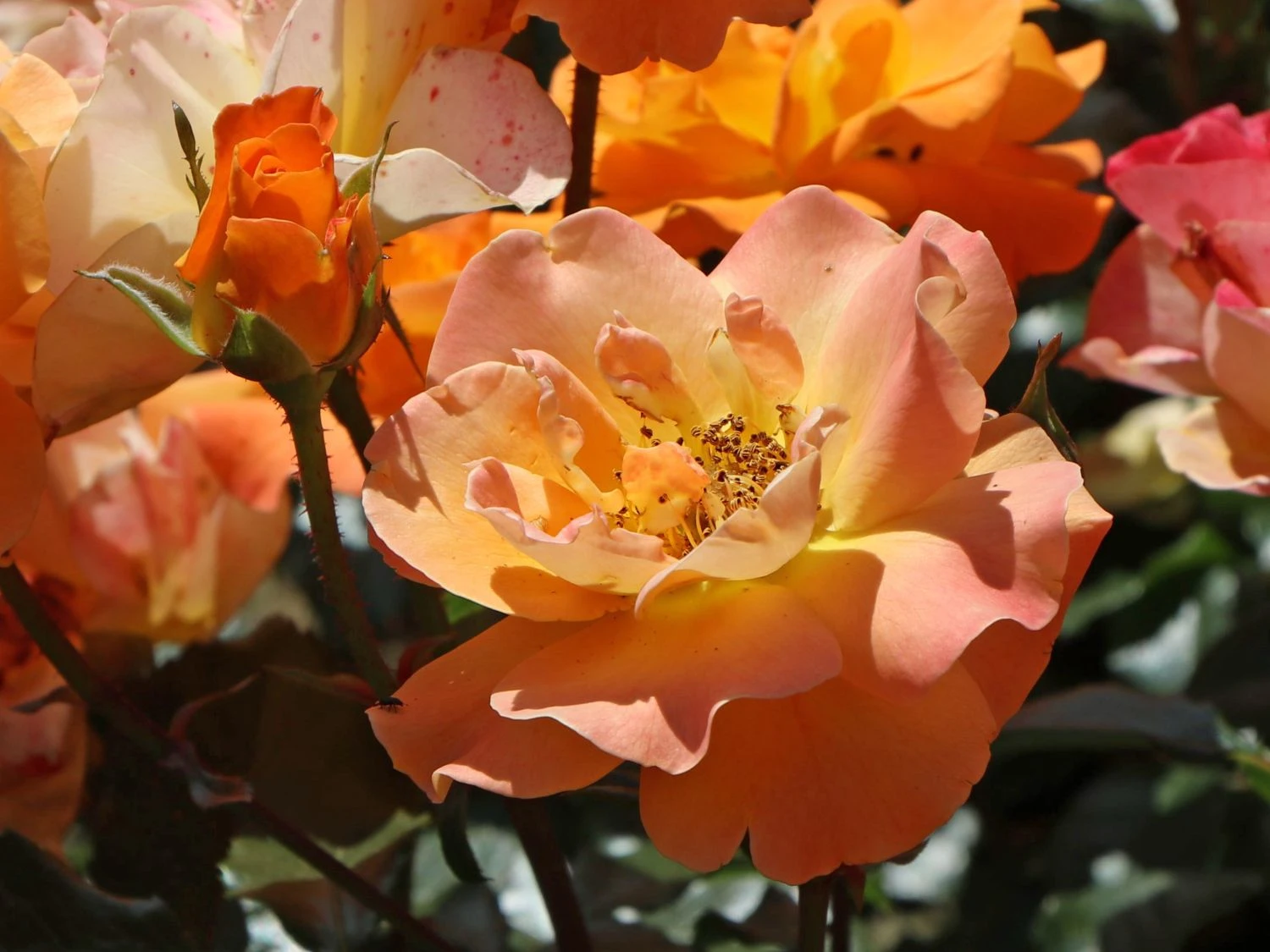 Die Beetrose ‚Westzeit‘ ® bezaubert mit locker halbgefüllten Blüten. Die (bot.)Rosa ‚Westzeit‘ ® ADR-Rose begeistert mit ihrem farbenfrohen Blütenspiel, das von orange bis rosa und apricot changiert. Diese schöne Beetrose ist öfter blühend und erobert durch ihre Farbbrillanz und Wuchskraft die Herzen vieler Rosenfreunde. ‚Westzeit‘ ® ist eine früh blühende Sorte. Sie präsentiert sich von Mai bis Oktober in bester Blühlaune und bildet kontinuierlich neue, zart duftende Blüten. Diese stehen einzeln in Dolden an den kräftigen Zweigen. Sie können bis zu sechs Zentimeter groß werden und nehmen es mit der Eleganz. Sie wächst aufrecht und breitbuschig und erreicht eine maximale Wuchshöhe von 70 Zentimeter. Die Blätter der sommergrünen Beetrose ‚Westzeit‘ ® glänzen elegant und harmonieren großartig mit den charmanten Blüten. Die Beetrose bevorzugt einen sonnigen bis absonnigen Standort. Am besten gedeiht ‚Westzeit‘ ® auf einem tiefgründigen, frischen, humosen und gut durchlässigen Untergrund.