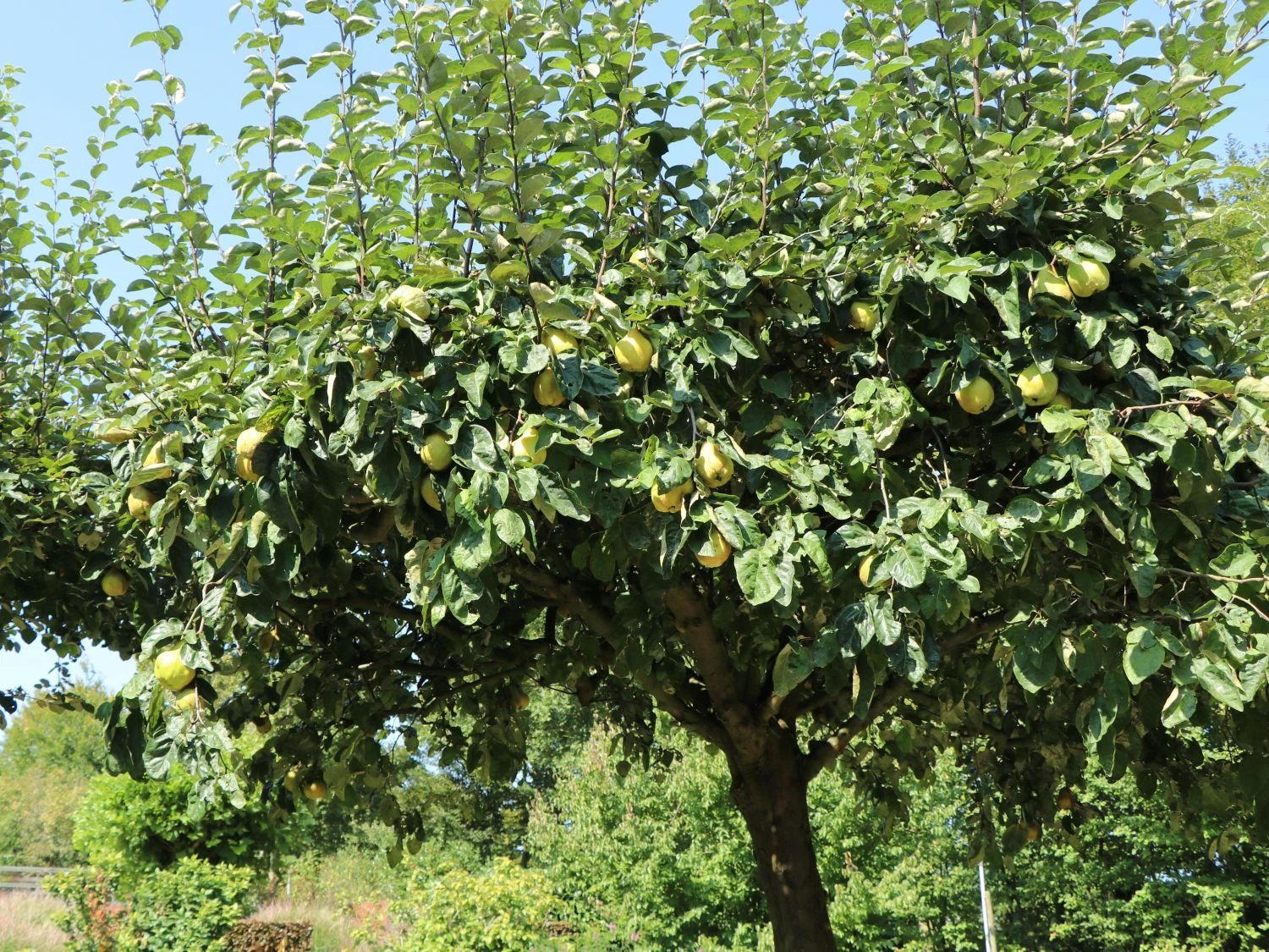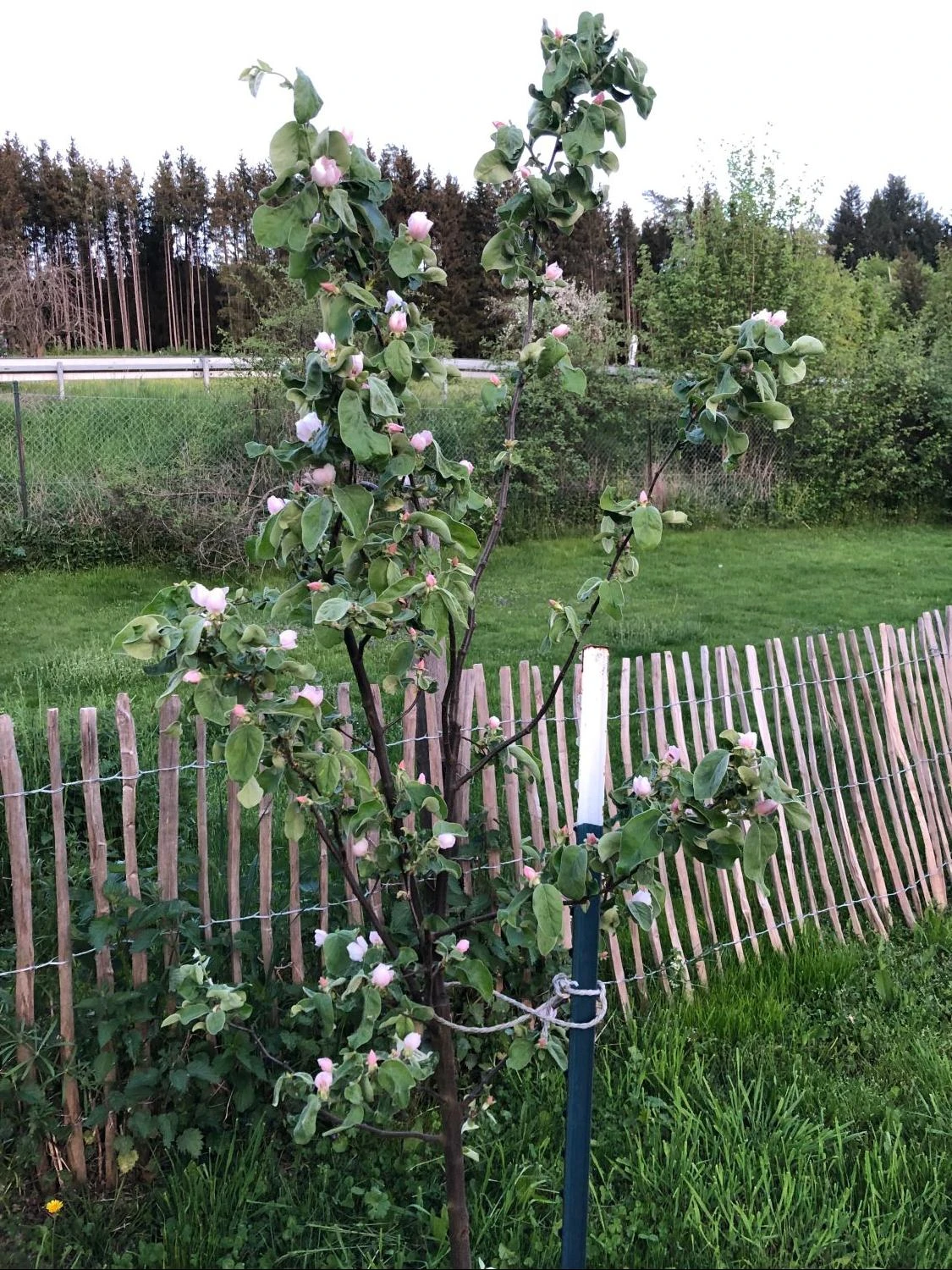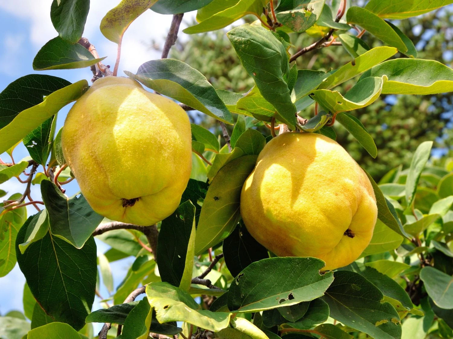 Die Birnen-Quitte ‚Vranja‘ stammt bereits aus dem Jahre 1898 und ist eine alte serbische Kreation des Züchters Nenadovic. Schon bei unseren Großmüttern zählten Quitten zu den Lieblingen im Garten. Die (bot.) Cydonia oblonga ‚Vranja‘ ist von guter Qualität und hat sowohl optisch als auch kulinarisch einiges zu bieten. Wie der Name verrät, sind die Früchte von birnenförmiger, leicht kantiger Gestalt. Im Durchmesser erreichen sie sieben bis neun, in der Höhe neun bis elf Zentimeter. Die Früchte dieses Obstgehölzes neigen zur Extravaganz. Eine Frucht entwickelt sich auf 300 bis 550 Gramm. Selten sind sie bis zu einem Kilogramm schwer. Schon von weitem sind sie an ihrer intensiv gelben, harten, dicken, mit einem dichten, schützenden Flaum besetzten Schale zu erkennen. Das Fruchtfleisch der Birnen-Quitte ‚Vranja‘ hat eine hellgelbe Farbe und den typischen, süßen bis säuerlichen Quittengeschmack. Außergewöhnlich ist der angenehme Duft, den die reifen Früchte verströmen. Bei entsprechender Kultur sind die Erträge hoch und regelmäßig. Im Gegensatz zur Apfelquitte, ist das Fruchtfleisch der Birnen-Quitte weicher und saftiger, was sie leichter zu verarbeiten macht. Aus den reifen Früchte lassen sich leckere Gelees, Marmeladen, Säfte oder Liköre bereiten. Die großen, rosa bis weißen Blüten, die den Baum von Mai bis Juni zieren, sind dekorativ. Sie sitzen im Frühjahr an den Triebspitzen und machen diese Pflanze zu einer begehrten Bienennährpflanze, beispielsweise in einem Bauerngarten.