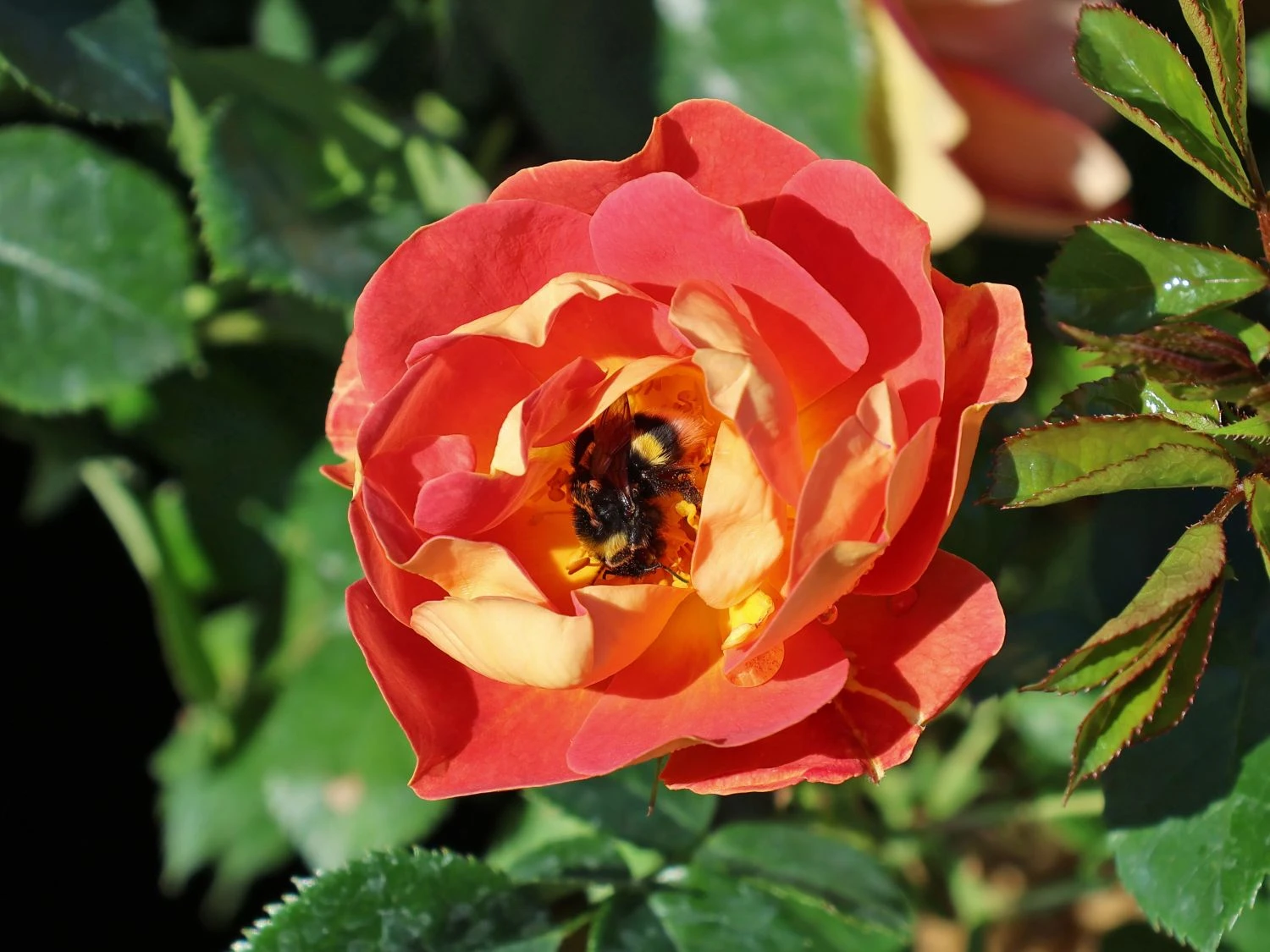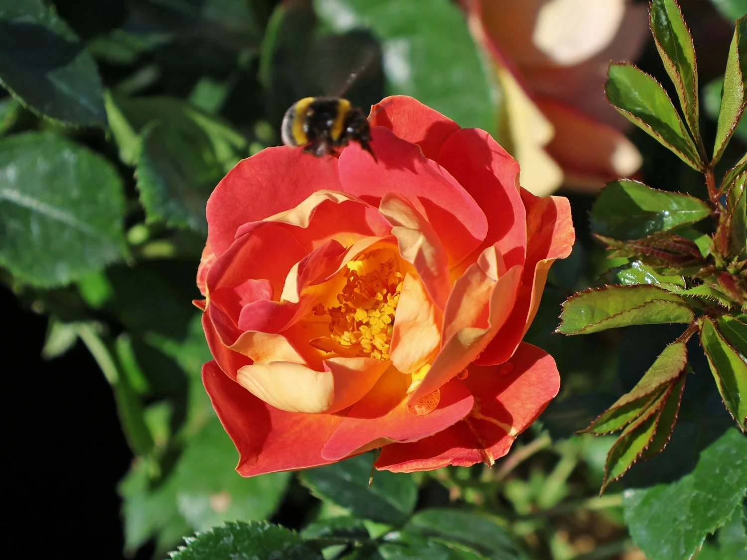 Die Bodendecker-Rose ‚Bienenweide ® mango‘ ist eine weitere wunderschöne Sorte in der Reihe der Bienenweide ® -Kollektion aus dem renommierten Hause Tantau. Reich blühend und blattgesund begeistert (bot.) Rosa ‚Bienenweide ® mango‘ mit ihrer farbenfrohen Blütenpracht. Die Blüten erscheinen in einem unglaublich leuchtenden Orange, sind halbgefüllt und ein beliebter Lande- und Futterplatz für Bienen und Hummeln. Das ganz spezielle Extra der Bodendecker-Rose ‚Bienenweide ® mango‘ ist die ausdauernd geschlossene, dabei gleichwohl bewegliche Blütenform. Nur dadurch bleibt die leuchtend gelbe Außenseite der Blütenblätter für einen langen Zeitraum sichtbar. Nach und nach öffnen sich die Blüten und erlauben einen Blick auf die Innenseiten der Petalen, die in einem kräftigen und warmen Orange bezaubern. Diese Blüten zünden ein farbliches Feuerwerk und sind zudem ein Göttermahl für die Bienen.