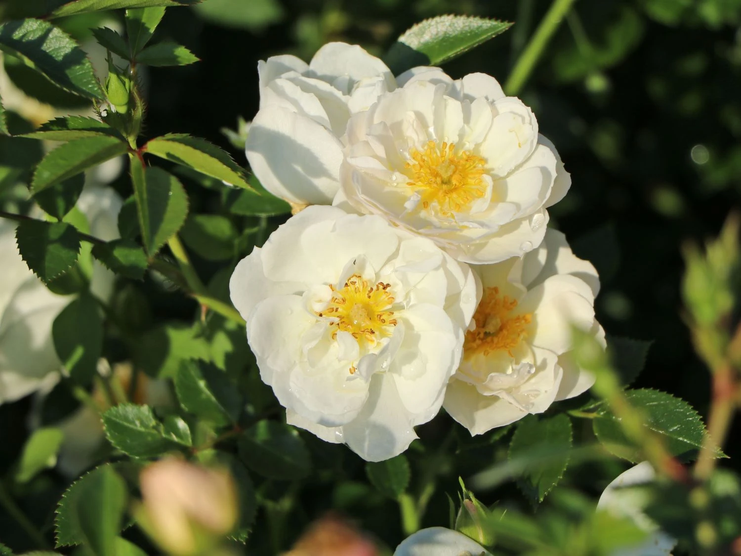 Die Bodendecker-Rose ‚Bienenweide ® Weiß‘ begeistert mit zauberhaften Blüten an verschiedensten Standorten. Mit ihrem niedrigen und kompakten Wuchs begeistert sie und ist die ideale Wahl für kleine Rosengruppen in Beeten. Auch eignet sie sich mit ihrer zierlichen Optik für Pflanzentöpfe und Kübel auf Balkon oder Terrasse. Ihr Name verspricht nicht zu viel, denn sie ist eine wertvolle bienenfreundliche Rose für den Garten. Bienen umschwirren gern die wunderschönen Blüten der (bot.) Rosa ‚Bienenweide ® Weiß‘. Sie erfreuen sich am Nektar der weißen Blütenpracht. Auch Schmetterlinge und Hummeln zählen zu den begeisterten Besuchern dieser Bodendeckerrose. Die Bodendecker-Rose ‚Bienenweide ® Weiß‘ erstrahlt mit wunderschönen schneeweißen Blüten, aus deren Blütenmitte die intensiv gelben Staubgefäße auffällig hervorstechen. Diese halbgefüllten Blüten sind ein herrlicher Anblick. Ihr Laubwerk ist kräftig grün und ein ausgesprochen schöner Kontrast zur schneeweißen Blüte. Die Blätter sind oval sowie vorne zugespitzt. Im Vergleich zu anderen Rosen ist das einzelne Blatt jedoch klein, was großartig zu ihrem Wesen passt. Klein aber keinesfalls unauffällig ist diese beeindruckende Sorte unter den Bodendeckerrosen! Die Rosa ‚Bienenweide ® Weiß‘ zeigt einen typischen Zwergrosen-Charakter. Mit ihrem Wuchsverhalten wächst sie attraktiv und kompakt. Sie erreicht circa 30 bis 50 Zentimeter an Höhe. In kleinen Gruppen entfaltet sie aus diesem Grund ihre Optik am Besten und geht nicht zwischen größeren Pflanzen unter. Bei einer Gruppe im Beet ist ein Pflanzabstand von rund 35 bis 40 Zentimetern zu empfehlen. So entwickeln sich die einzelnen Exemplare ideal und begeistern den Rosenfreund. Zwischen sechs bis acht Pflanzen haben pro Quadratmeter Platz.