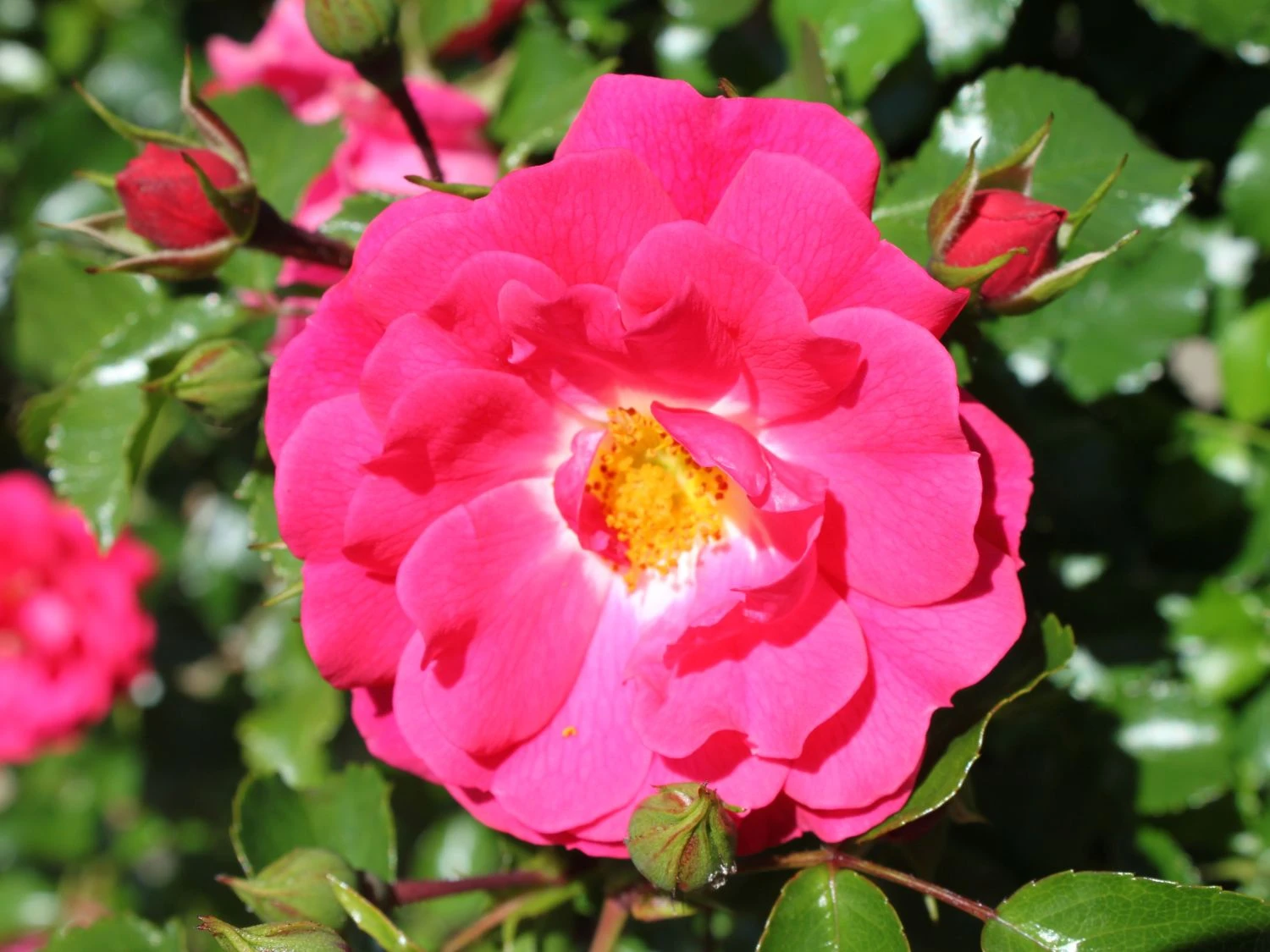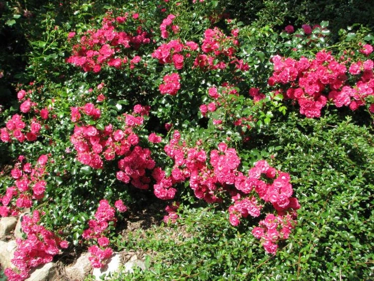 Rosa ‚Gärtnerfreude‘ ® / ‚Toscana‘ ® kam 1999 auf den Markt. Seitdem glänzt sie im öffentlichen Bereich und in privaten Gärten. Der Strauch besticht durch glänzende, dunkelgrüne Blätter. Er wächst ausgezeichnet und besitzt dicht stehende, büschelförmig angeordnete Blütenstände. Nach einem ersten, reichen Blütenflor folgen weitere Blumen bis in den Herbst. Abhängig vom Standort zeigt die Bodendeckerrose ‚Gärtnerfreude‘ ® / ‚Toscana‘ ® letzte Blüten bis zum Frost. Die Blüte hat einen Durchmesser von drei Zentimeter und besteht aus dicht stehenden, gewellten Blütenblättern ohne Staubgefäße. Ihre Blütenblätter sind einheitlich himbeerrosa gefärbt und verändern ihre Farbe durch Regen und starkes Sonnenlicht nicht. Mehrjährige Sträucher überdecken den Boden mit kurzen und langen Zweigen, die ein bequemes Versteck für Vögel und Kleinsäugetiere sind. In tiefen Kästen mit Kübelpflanzenerde wächst die Rose wunderbar und verschönert einen Balkon. Gartenfreunde schneiden nach der ersten Blüte die kahlen Blütenstände oberhalb des ersten Blattpaares ab. Nach dem Schnitt entwickelt der Strauch neue Blütenzweige. Die Bodendeckerrose ‚Gärtnerfreude‘ ® / ‚Toscana‘ ® ist robust, pflegeleicht, winterhart und wächst in regenreichen Lagen und rauen Gegenden Mitteleuropas.