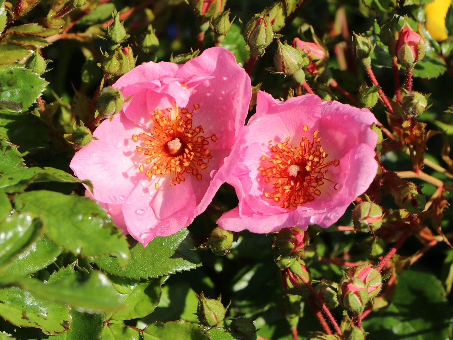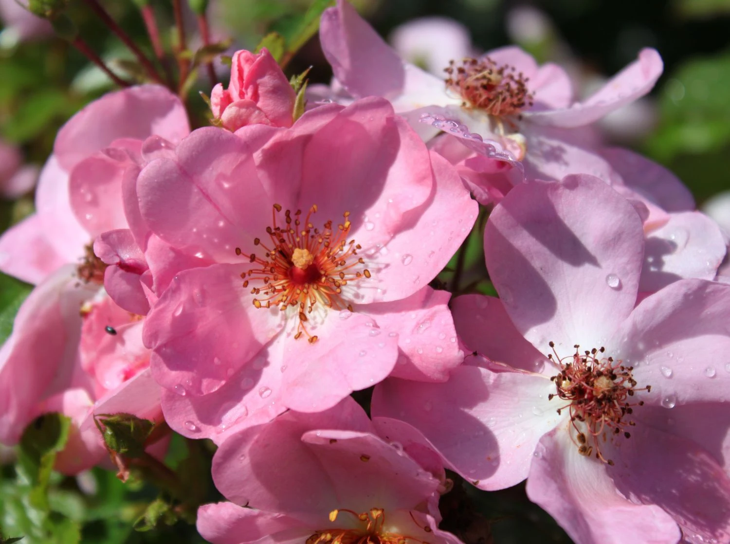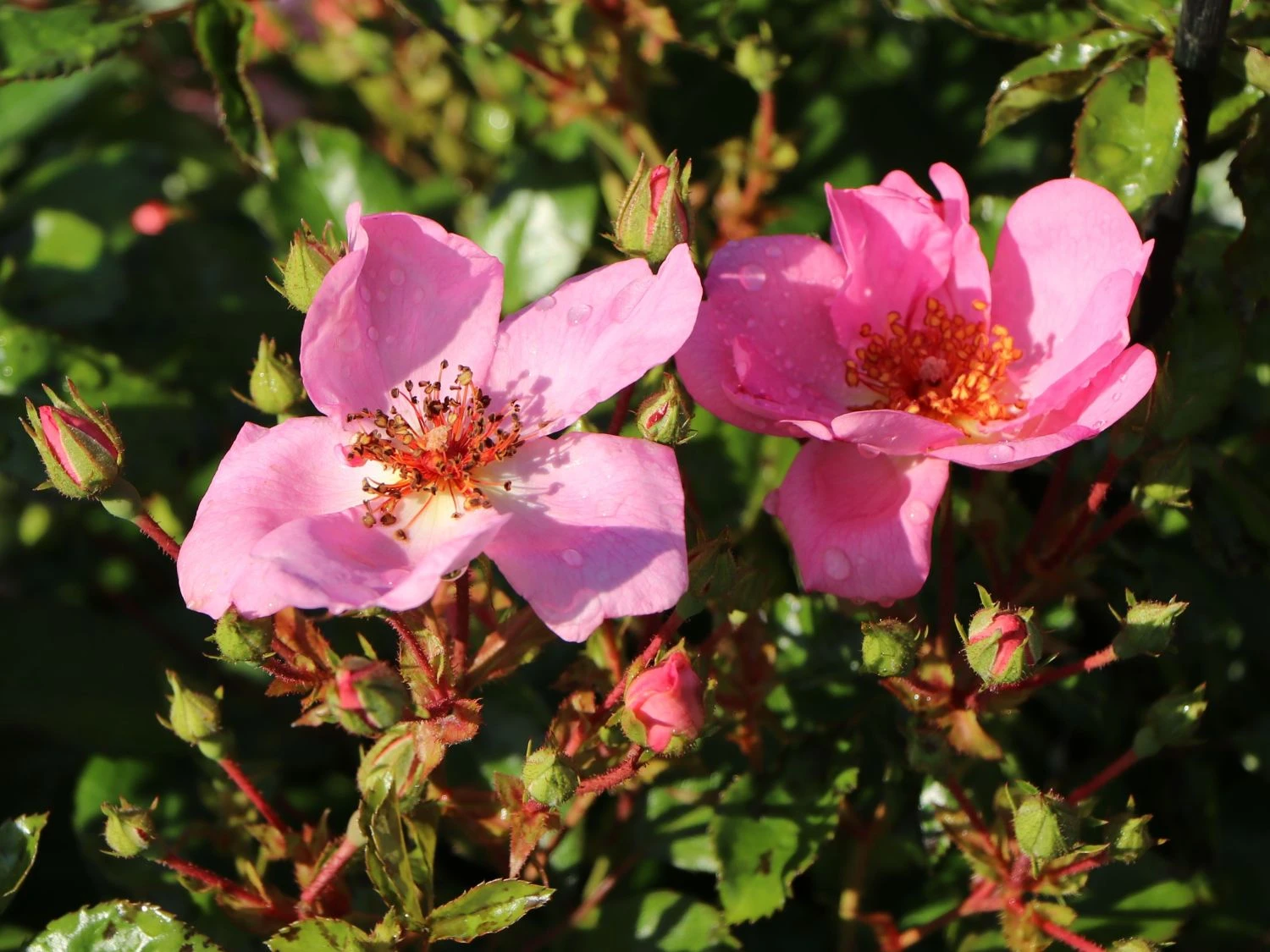 Die einfachen rosa Blüten sind schalenförmig, in der Mitte befinden sich gelbe Staubblätter. Die verblühten Blüten schneidet der Gartenfreund regelmäßig ab. Dadurch spornt er die Rose zum frischen Austrieb an. Die rosa Blüten stehen in großer Anzahl in Dolden an den Trieben. Auch im Pflanzkübel sieht die Bodendeckerrose ‚Sweet Haze‘ ® hinreißend aus und ist auf Balkon oder Terrasse ein hübscher Hingucker. Die Bodendeckerrose ist robust und unkompliziert. Rosa ‚Sweet Haze‘ ® bevorzugt einen sonnigen Standort. Perfekt ist ein frischer, humoser, tiefgründiger und durchlässiger Untergrund. Besonders schön wirkt diese Rose in einer Gruppe. Im Rosenbeet pflanzt der Gärtner nicht mehr als drei Exemplare pro Quadratmeter. Alternativ bietet sich an, diese Rose mit Stauden oder andersfarbigen in Kleinstrauchrosen im Garten zu kombinieren. Beim Einpflanzen achtet der Gärtner darauf, dass die Veredelungsstelle rund fünf Zentimeter tief im Boden ist. Ein Rückschnitt der Bodendeckerrose erfolgt im Frühjahr an.