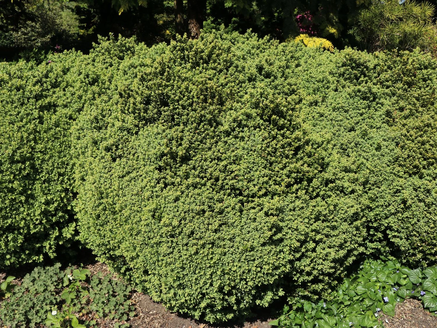 In der Wuchshöhe wie in der Breite erreicht ‚Blauer Heinz‘ 40 bis 50 cm. Mit einem Zuwachs von 4 bis 6 cm im Jahr, lässt er sich viel Zeit mit dem Wachsen. In der Sonne bis Halbschatten lebt er gerne auf normalem Gartenboden. Vielfach findet dieser Buchsbaum seinen Einsatz als einzelnes Ornament in Pflanzgefäßen oder als. Der Buchsbaum ‚Blauer Heinz‘ erlebt als Formschnittgehölz in jüngster Zeit eine Renaissance. Als Element eines formalen Gartens ist der Buchsbaum unverzichtbar. Aus barocken Schlossgärten oder Bauerngärten sind die Pflanzen dieser Art er nicht wegzudenken. Der Buxus sempervirens ‚Blauer Heinz‘ ist ein schwachwüchsiger Buchs. Kompakt wächst der Strauch als Kugel und bleibt das gesamte Jahr hindurch belaubt. Seine blaugrünen Blätter verfärben sich in den Wintermonaten dunkelgrün. Dieser Buchs stellt keine besonderen Ansprüche an den Boden. Diese robuste Pflanze ist winterhart und stadtklima- sowie industriefest. Seine vielfältigen Einsatzgebiete machen den Buxus unwiderstehlich in der Gartenkultur. Als niedrige und hohe Heckenpflanze ist er unverzichtbar. Zum Einfassen von Gräbern und Umranden von Beeten bietet sich dieser Buxus an. Die Pflanze sorgt für dekorative und ansprechende Akzente an jedem Standort. Ob wunderbar in Form gebracht oder als natürliche Kugel, er ziert jeden Standort! Dieser Buchsbaum verlangt dem Gärtner keine Pflege ab. Gemächlich vor sich hin wachsend, zeigt er seine Attraktivität als kleine Hecken- oder Solitärpflanze. Mit leichten Korrekturschnitten ist der Buxus formbar und wird zum dekorativen Ornament im Garten. Nach ausdauernden, sonnigen winterlichen Frostperioden freut sich der Buchsbaum ‚Blauer Heinz‘ über Wasser. An bedeckten Tagen während der Sommerzeit sind Formschnitte am Buxus durchführbar. Bei Hitze und während niederschlagsfreier Perioden verzichtet der Gärtner darauf. Dafür kann der Gärtner die neuen Triebe des Buxus circa um die Hälfte kürzen. Meist reicht ein Schnitt im späten Sommer aus um den Buchsbaum in Form zu halten. Die Sorte ‚Blauer Heinz‘ ist eine natürliche Mutation des Buxus sempervirens ‚Suffruticosa‘. Entstanden ist sie in den Herrenhäuser Gärten in Hannover Herrenhausen. In den 1980er Jahren entdeckte den Buxus ein Gärtnermeister namens Heinz. Auf diese Weise ist sein Name entstanden. Durch seinen extrem langsamen Wuchs, benötigt dieser wertvolle Buchsbaum wenige Rückschnitte. Alle ein bis zwei Jahre reichen aus. Im Einzelstand überzeugt ‚Blauer Heinz‘ als zauberhafte Naturkugel mit wenig Pflegebedarf.
