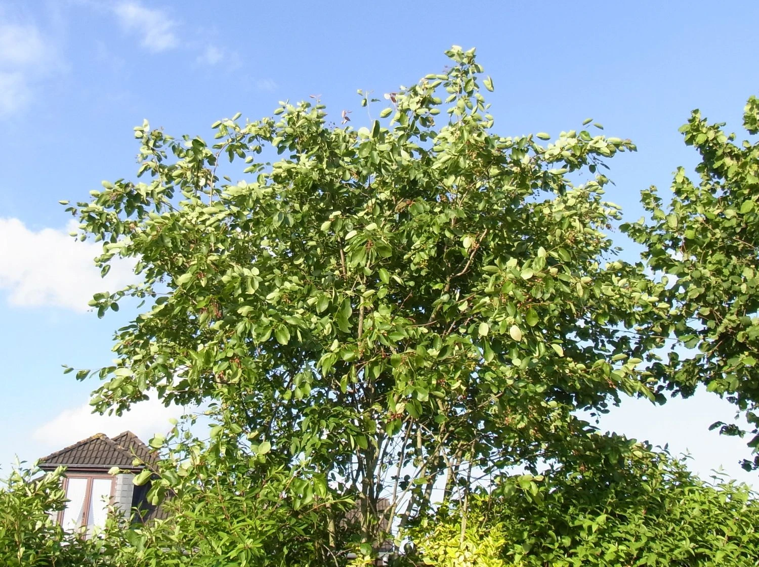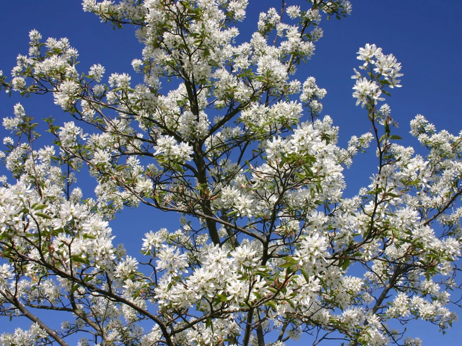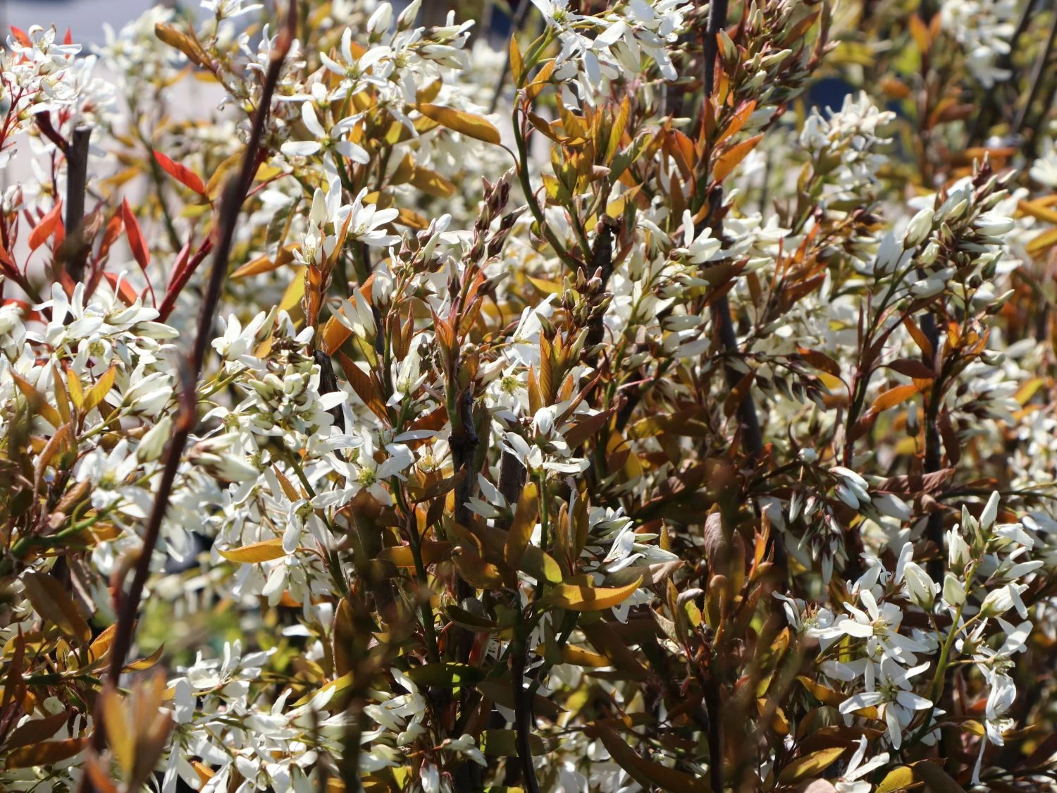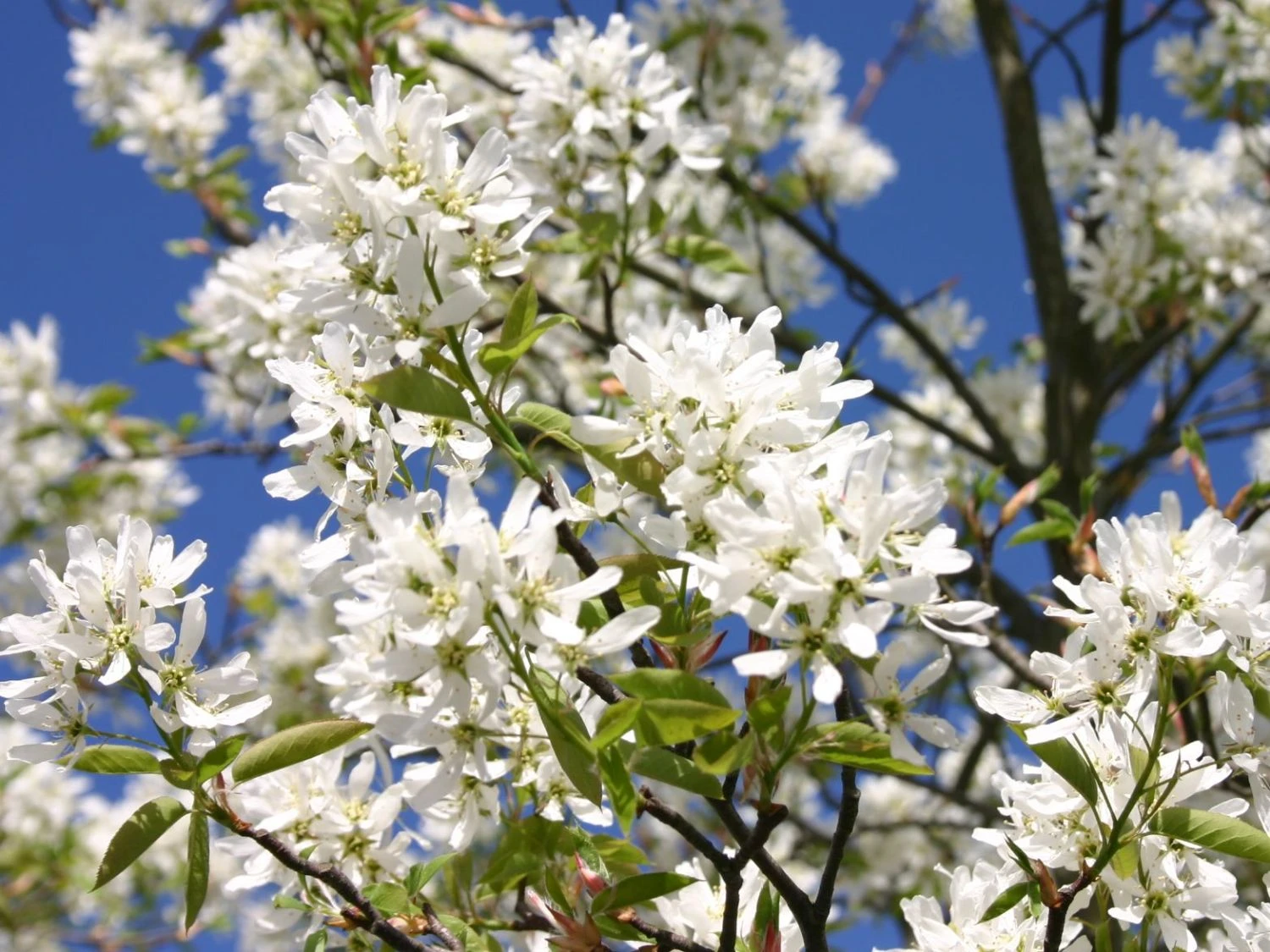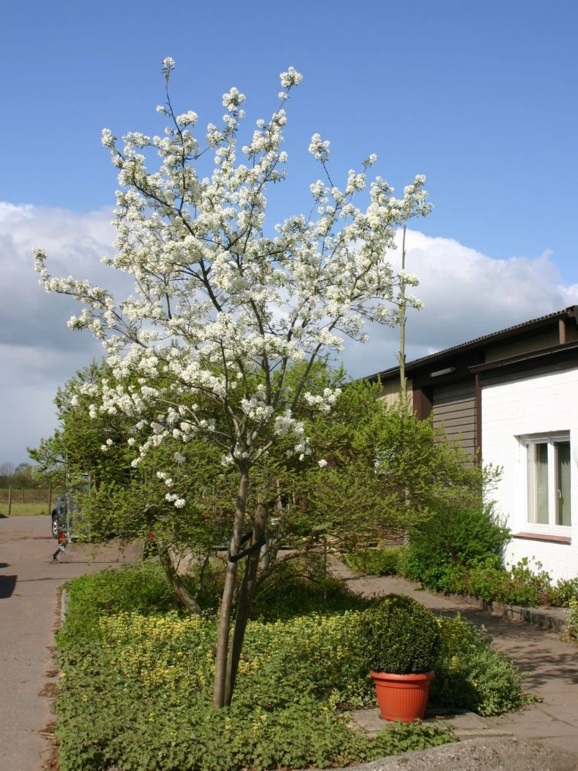 Die Essbare Felsenbirne ‚Ballerina‘ ist eine wunderschöne Solitärpflanze für den Garten. Ihre großen, traubenförmigen Blüten erscheinen in strahlendem Weiß. In ihrer üppigen Pracht überziehen sie den Strauch von April bis Mai. Gleichzeitig mit der Blüte treiben die Blätter aus, die anfangs eine bronze- bis kupferrote Farbe aufweisen. Dieser aparte Kontrast macht die Felsenbirne zu einem besonderen Blickfang im Garten. Der Herbst setzt das Farbenspiel der Amelanchier laevis ‚Ballerina‘ überzeugend fort. Die Farbe der Blätter wechselt von einem satten Dunkelgrün zu strahlendem Purpurrot. Besonders im Sonnenlicht leuchtet der Strauch noch einmal auf bevor er sein Laub vollständig abwirft. Der schöne Zierstrauch wächst mit 20 bis 40 Zentimeter Zuwachs pro Jahr schnell auf eine stattliche Größe heran. Mit bis zu fünf Metern in der Breite und maximal sechs Metern Höhe rechnet der Gärtner. Steht der prächtige Strauch in einer Gehölzgruppe, bildet er vom Frühjahr bis zum Herbst einen gelungenen Kontrast zu Blatt- und Blütenfarben verschiedener Gehölze. Als bezaubernder Blickfang wertet Amelanchier laevis ‚Ballerina‘ jeden Vorgarten auf. Die weiße Blütenpracht harmoniert besonders gut mit Frühblühern wie blauen Krokussen und Anemonen, gelben Narzissen und roten Tulpen. Die Felsenbirne liebt einen sonnigen bis halbschattigen Standort. Sie gedeiht in jedem Gartenboden, bevorzugt dabei leicht sandige und durchlässige Böden. Die Felsenbirne ist winterhart und kommt in trockenen Sommern gut zurecht. Die Essbare Felsenbirne ‚Ballerina‘ wächst zu einem aufrechten Strauch von drei bis fünf Meter Höhe heran. Ein Formschnitt der leicht überhängenden Zweige ist in der Regel nicht nötig. Eine zu dicht gewordene Baumkrone lichtet der Gärtner durch den Rückschnitt einzelner Triebe aus.