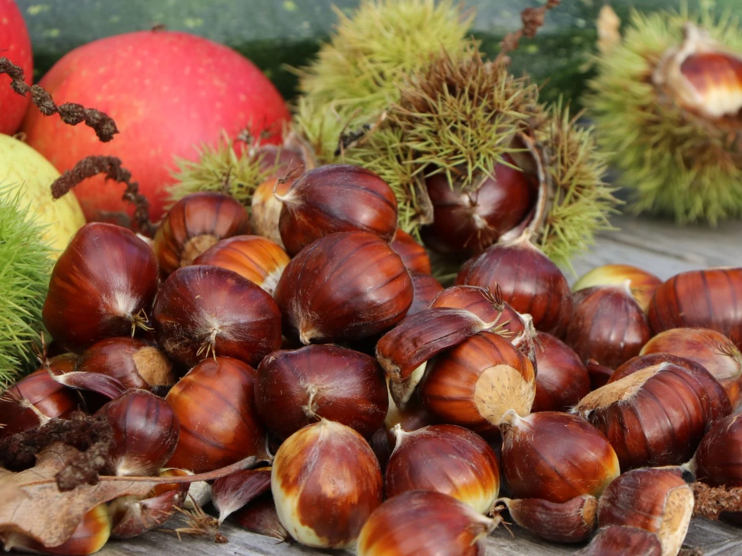 Die Esskastanie ‚Doree de Lyon‘ ist ein unkomplizierter und anspruchsloser Baum. Bereits in jungen Jahren setzt der winterharte Baum Früchte an. Er trägt köstliche stärkehaltige Nussfrüchte, die vielerorts als Maronen bekannt sind. Sie werden im Oktober reif. Die rotbraunen Früchte sind kugelig und zugespitzt. Sie umhüllt eine glänzende Schale, die sich leicht ablösen lässt. Zwei bis drei Früchte reifen in der stacheligen grünen Fruchthülle heran. Diese platzt zur Reifezeit auf und die Früchte fallen zu Boden. Sie eignen sich zum sofortigen Verzehr, lassen sich kandieren, kochen, rösten, pürieren, mahlen, zu Brot, Gebäck oder Likör und vielen weiteren Leckereien verarbeiten. Beliebt sind sie als Beilage zu winterlichen Speisen oder für Mehlspeisen. Da die Nussfrüchte rund eine Woche haltbar sind, ist eine zeitnahe Weiterverarbeitung notwendig. Über Jahrhunderte waren die süßlich schmeckenden und vitaminreichen Früchte der Esskastanie in südeuropäischen Bergregionen ein wichtiges Nahrungsmittel der Menschen. Doree de Lyon‘ ist für ihre großen Nussfrüchte und ihren Fruchtreichtum bekannt. Der Gärtner pflanzt für eine reichere Ernte zwei Bäume. Auf diese Weise findet eine gegenseitige Befruchtung statt. ‚Doree de Lyon‘ bevorzugt einen sonnigen Standort und einen tiefgründigen, frischen und lockeren Boden. Dieser kann lehmig und leicht sauer sein. Die Sorte eignet sich als Solitär in Parkanlagen, in Haus- oder Vorgärten sowie zur Gruppenpflanzung. Durch ihre Kastanien ist die Edelkastanie in der Natur ein wertvolles Tiernährgehölz.
