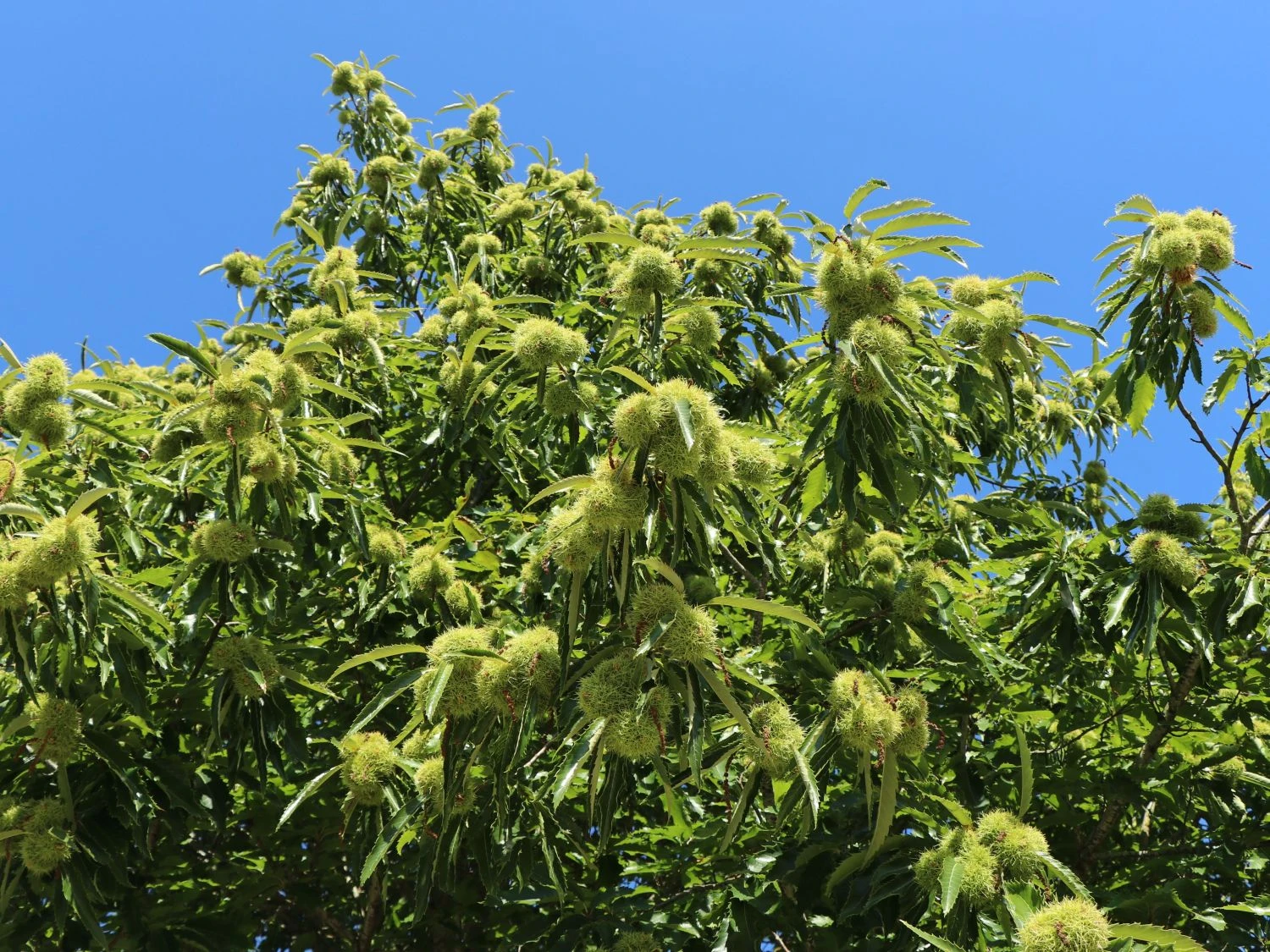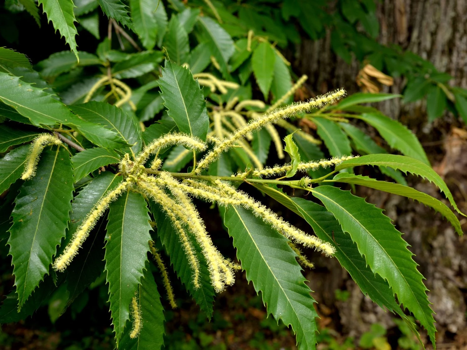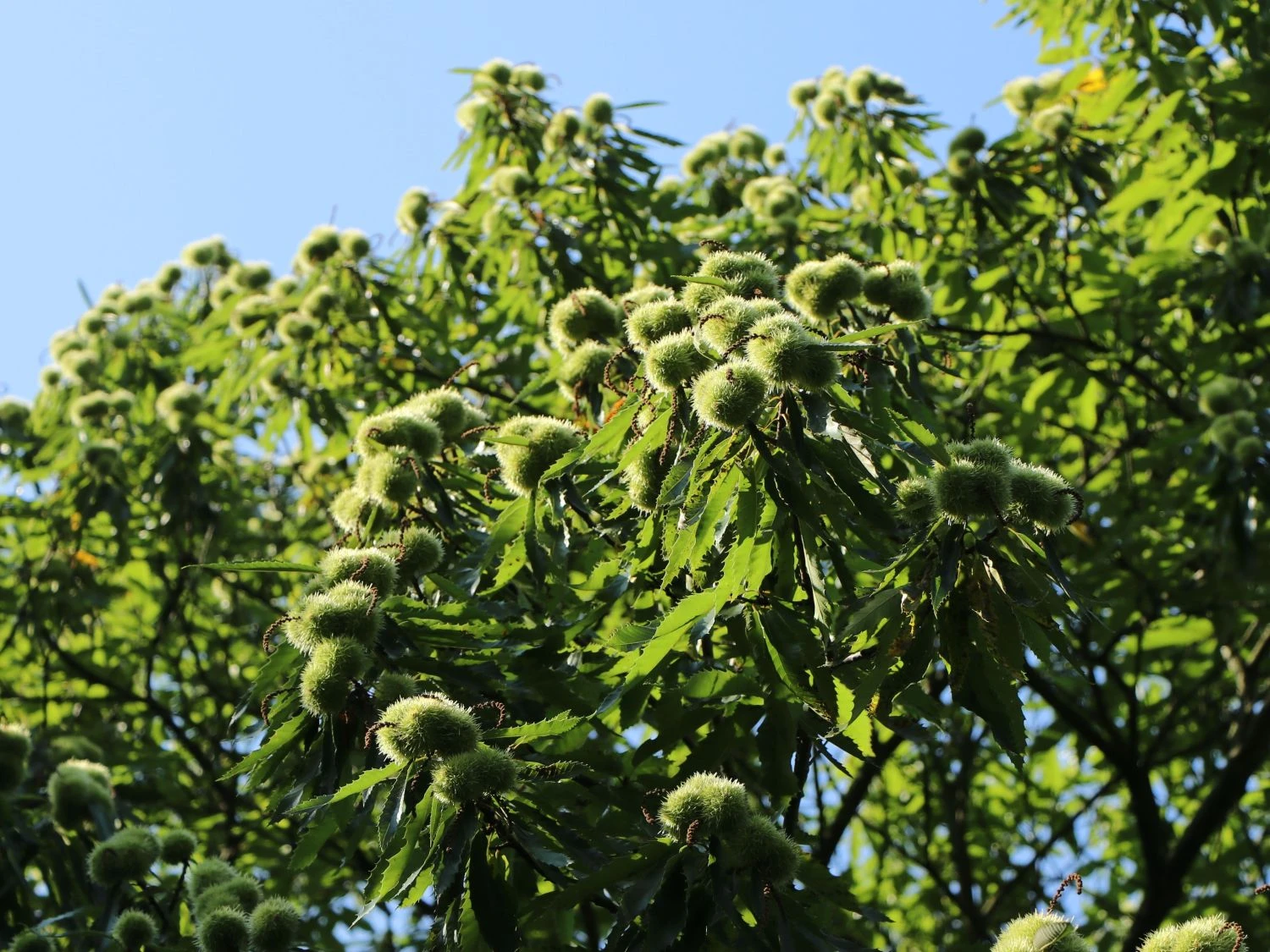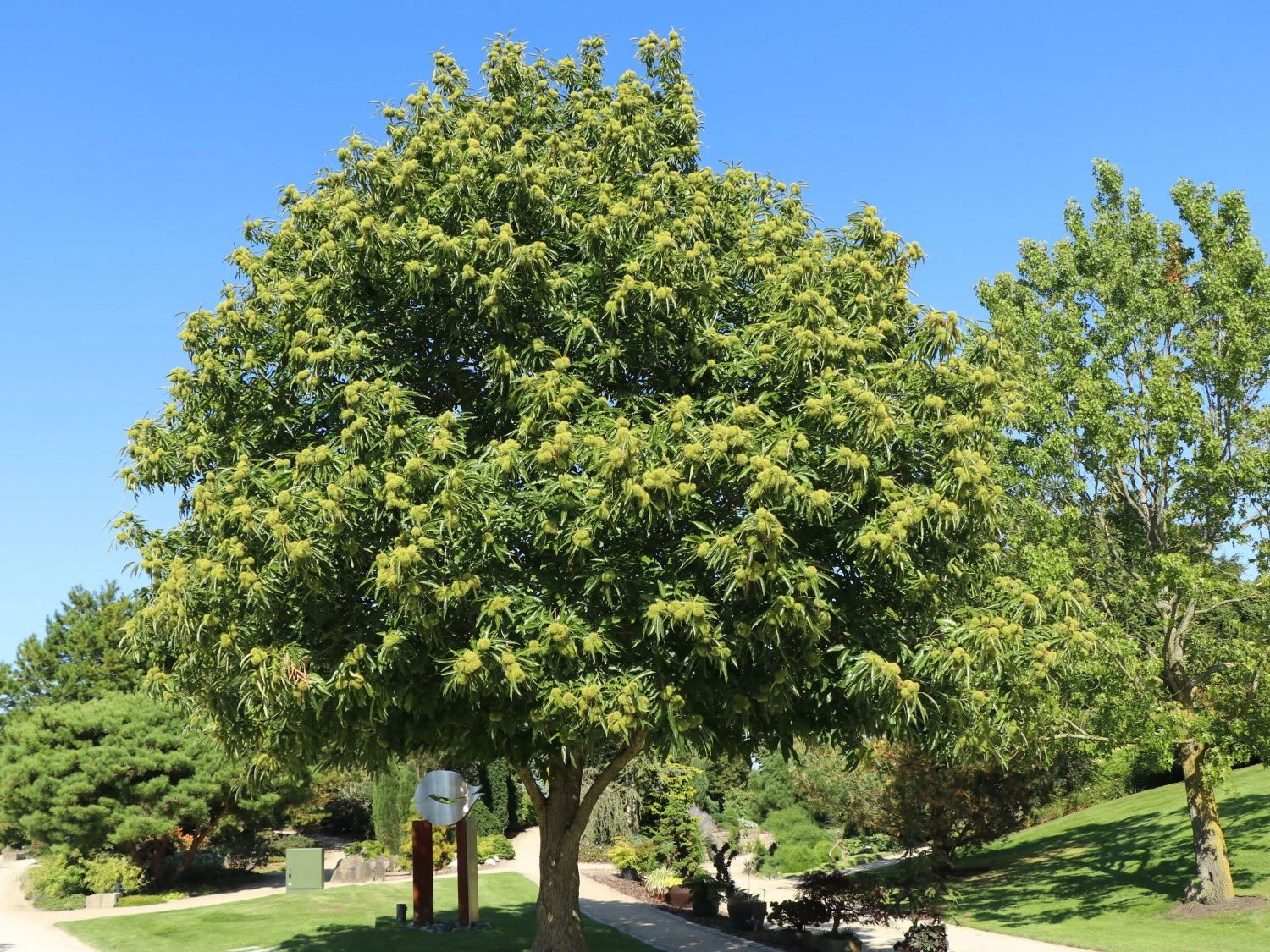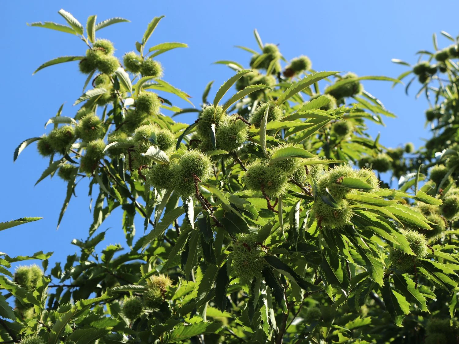 Die Esskastanie ‚Doree de Lyon‘ ist für ihre schmackhaften Kastanien bekannt. Die schöne Kastanie wächst aufrecht und kompakt. Sie wird mittelgroß mit einer maximalen Höhe von bis zu zehn Metern. Der Baum wächst aufrecht und ist gut verzweigt. Die (bot.) Castanea sativa ‚Doree de Lyon‘ bildet in jungen Jahren einen Stamm, der im Alter durchaus als mächtig zu betiteln ist. Die Esskastanie entwickelt im Laufe ihres Lebens eine rundliche bis kegelförmige Krone. Ursprünglich stammen Esskastanien aus Kleinasien. Da sie wärmeliebend sind, sind sie in Süd- und Mitteleuropa stärker verbreitet als in den nördlichen Naturräumen. Die französische Esskastanie stammt von einem ausgelesenen Sämling aus der Nähe von Lyon. Das feste Holz der Esskastanie ‚Doree de Lyon‘ findet im Schiffbau sowie in der Möbelindustrie Verwendung. Trotz der Namensähnlichkeit ist die Esskastanie nicht mit der Rosskastanie verwandt. Die Esskastanie zählt zu den Buchengewächsen, die Rosskastanie zu den Seifenbaumgewächsen. Die Blütezeit der ‚Doree de Lyon‘ liegt in der Zeit von Mai bis Juni. In diesem Zeitraum bildet die Edelkastanie wunderschöne gelbe Blütenkätzchen. Sie wachsen auf eine Länge von 20 bis 25 Zentimetern heran und verströmen einen angenehmen Duft. Der Baum zeigt dunkelgrüne Blätter mit einer elliptischen, lanzettlichen Form. Der Rand der Blätter ist gezähnt. Jedes Blatt erreicht eine Länge von bis zu 20 Zentimetern. Im Herbst leuchtet das Blattwerk dieser Edelkastanie in einem hellen Gelb und begeistert jeden Naturfreund.
