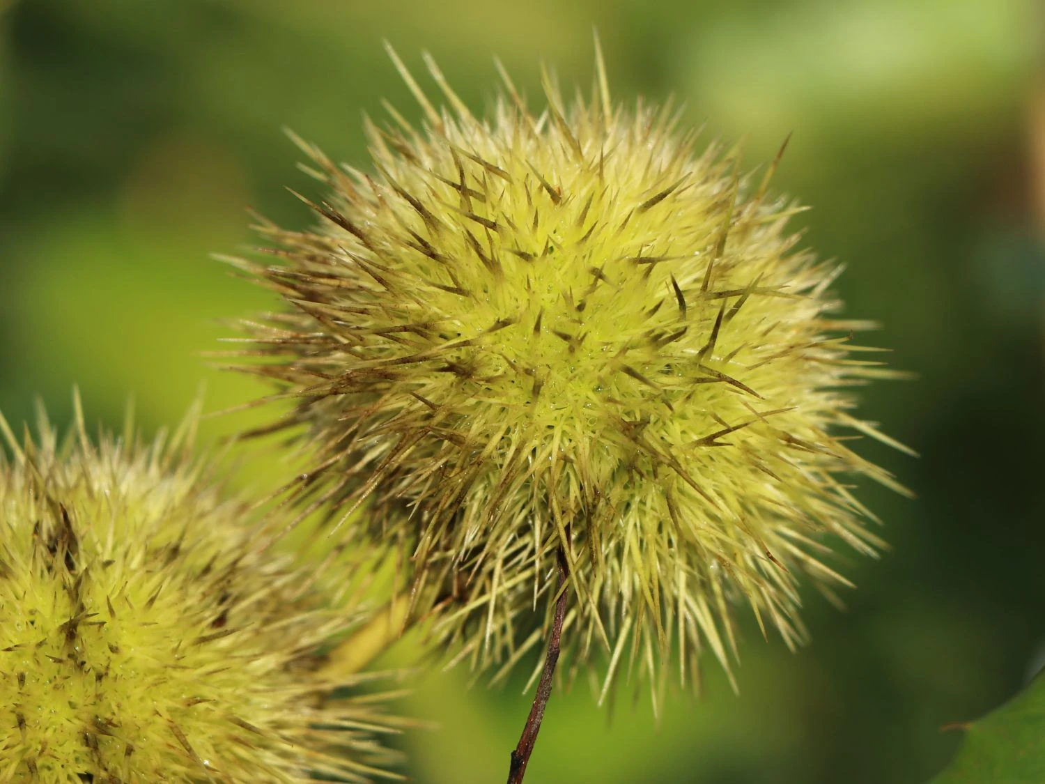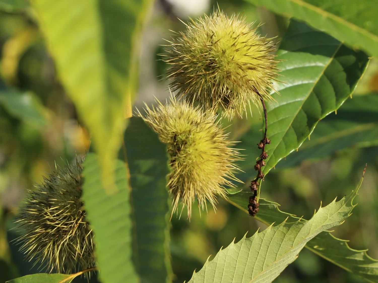 Die Esskastanie ‚Marlhac‘ ist das optische Schwergewicht auf einem Grundstück. Sie überragt mit ihrer Höhe Zierbäume und Obstgehölze und beschirmt mit ihrer breiten Krone einen Treffpunkt. Der Baum entwickelt schön geformte, dunkelgrüne und lederartige Blätter mit gezähntem Rand und kurzen, spitzen Stacheln. Im Herbst färben sie sich hellbraun bis gelbbraun und bilden eine schützende Schicht auf der Erde. Die Knospen der Sorte Castanea sativa ‚Marlhac‘ springen ab Februar auf und entfalten sich im März und April. Kleine, ährenförmige Stängel tragen winzige, grünlich-weiße bis blassgelbe Blüten mit Pollen und Nektar und sind ein Magnet für Bienen und andere Insekten. Ein herber bis strenger Geruch verbreitet sich während der Blütezeit um die Esskastanie ‚Marlhac‘. Über den Sommer entwickeln sich die dunkelbraunen Früchte in einer hellgrünen, stacheligen Schale. Diese Sorte zeichnet sich durch ihr sehr großen und sehr aromatischen Früchte aus. Bereits nach zwei bis drei Jahren Standzeit bildet der Baum seine essbaren Früchte. In südlichen Regionen Europas sind Kastanienbäume verbreitet und die Verwendung der Früchte ist in Weingegenden üblich. Die Castanea sativa ‚Marlhac‘ erfreut mit extragroßen, süßlichen, mehligen Maronen.