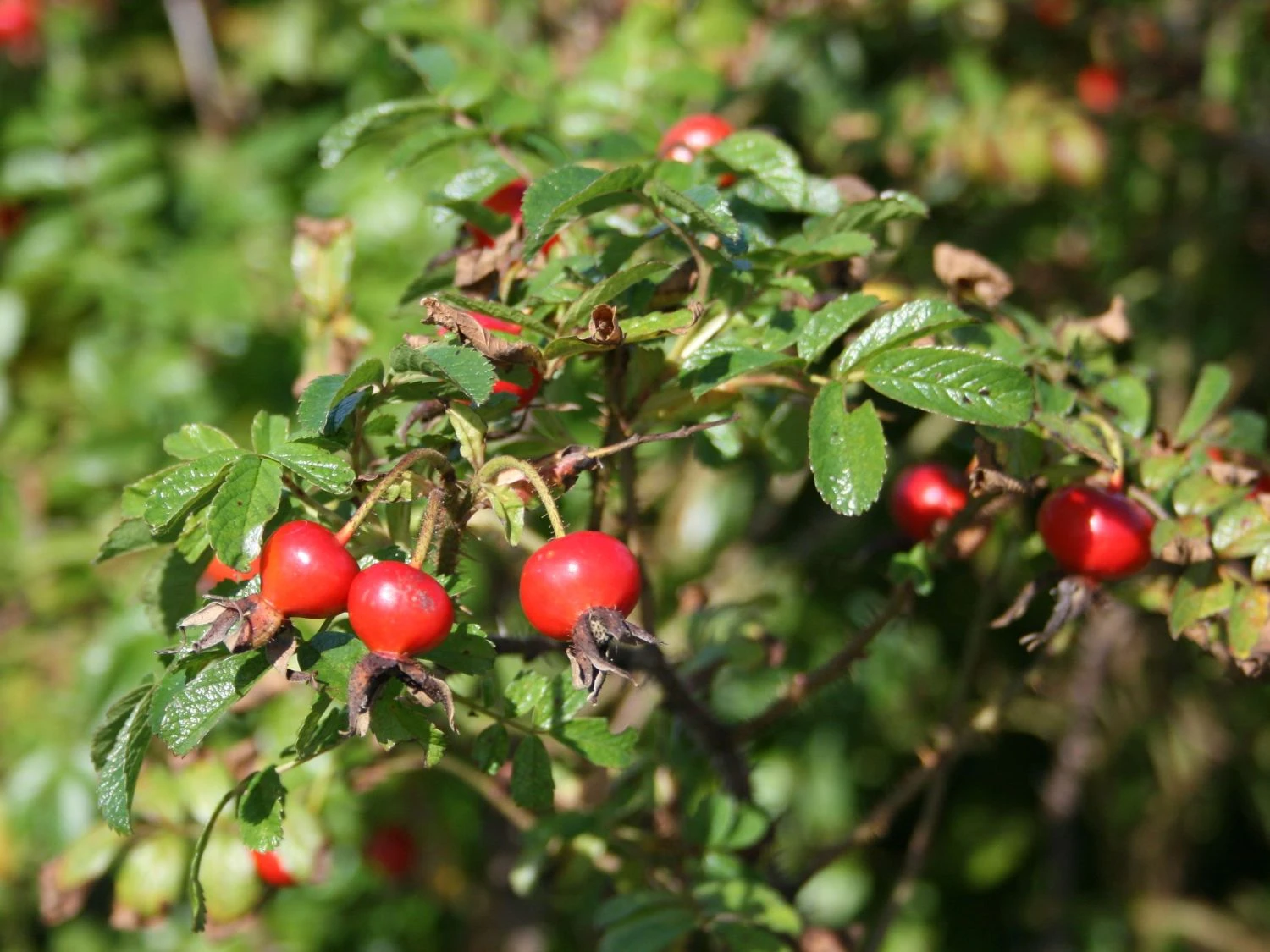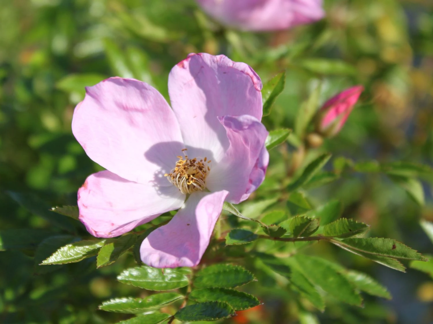 Die Glanz-Apfelrose / Niedrige Strandrose / Böschungsrose ist eine anspruchslose, stark duftende Kleinstrauchrose, die sich bereitwillig an schwierigen Stellen etabliert. Sie wächst aufrecht und ihre Triebe verzweigen sich mehrfach zu einem dichtbuschigen, undurchdringlichen Strauch. In der Regel erreicht sie eine Höhe und Breite von 100 Zentimeter. Von Juni bis August öffnen sich ihre rosaroten Blüten mit einer strahlenden, goldgelben Mitte. Ihr starker, wildrosenartiger Duft zieht zahlreiche Insekten an. Im Herbst verzaubert (bot.) Rosa rugotida mit ihren hellroten, runden Hagebutten und einer goldorangen Herbstfarbe des Laubes. Diese Rosenart ist eine Hybride aus Rosa rugosa und Rosa nitida. Sie stellt eine Pflanzenart in der Gattung Rosen (Rosa) innerhalb der Familie der Rosengewächse (Rosaceae). In ihr vereinen sich alle positiven Eigenschaften ihrer Eltern: dichtbuschiger Wuchs, glänzendes Laub und duftende Blüten. Ihre kräftigen Wurzeln verankern sich tief im Boden und bilden schnell seitliche Ausläufer. Mit dieser Eigenschaft eignet sich die Glanz-Apfelrose / Niedrige Strandrose / Böschungsrose hervorragend für das Befestigen von Böschungen. Gerne wird sie für grüne Flächen und freiwachsende, undurchdringliche Hecken verwendet. Die genügsame Rose verträgt salzhaltigen und trockenen Boden. Ein windiger und zugiger Standort mindert nicht ihr Wachstum, sodass sie sehr gut in küstennahen Regionen gedeiht. Als mittelhohe Hecke bietet sie einen hervorragenden Windschutz.