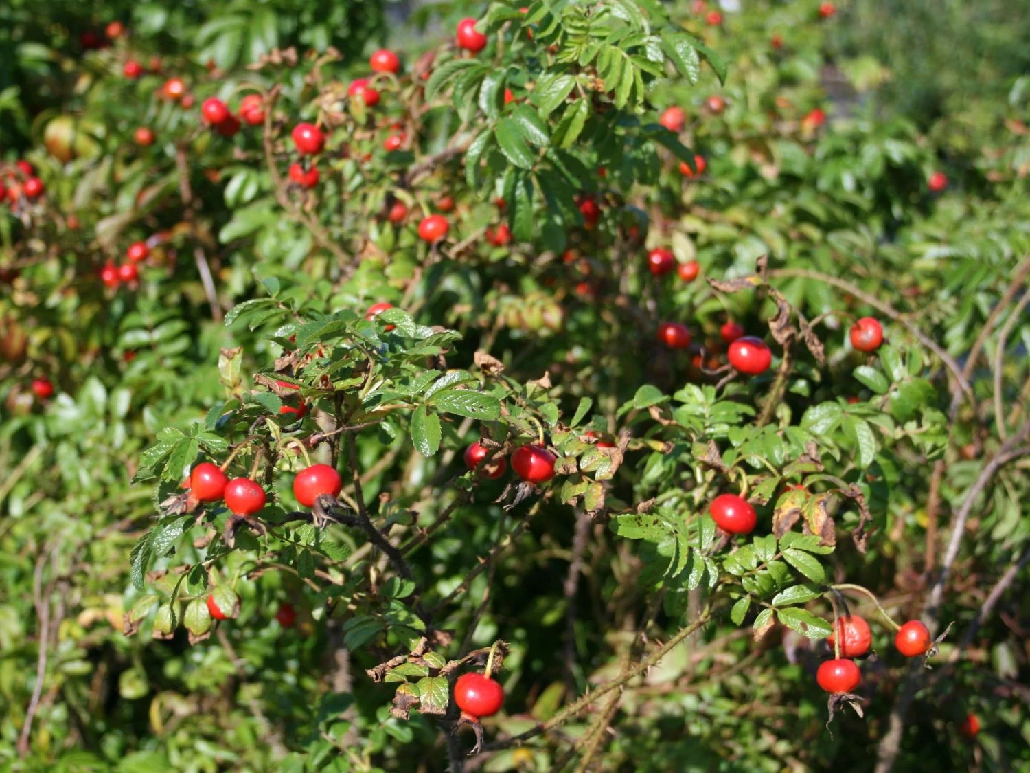 Die niedrig wachsende Glanz-Apfelrose / Niedrige Strandrose / Böschungsrose hat einen extrem kompakten Wuchs. Ihre dicht verzweigten, stark bestachelten Triebe lassen innerhalb kurzer Zeit ein undurchdringliches Gerüst aus Zweigen entstehen. In einem naturnahen Garten bietet dieser Strauch Vögeln und anderen Kleintieren einen wirkungsvollen Schutzraum. Zu ihren herausragenden Eigenschaften zählen ihre tiefreichenden Wurzeln, die in einem nahen Umkreis schnell Ausläufer bilden. Mit Rosa rugotida lassen sich in kurzer Zeit kleine Flächen füllen. Die Laubblätter dieser Rose zeichnen sich durch ihre zierliche Form und einen starken Glanz aus. Der fein gesägte Blattrand trägt zu dem feinen Charakter des Laubwerks bei. Das mittelgrüne Laub bleibt in der Regel während der gesamten Vegetationsperiode gesund. Während der Blütezeit von Juni bis August öffnen sich an den Triebspitzen zahlreiche mittelgroße Blüten. Ihre fünf Kronblätter leuchten kräftig rosarot mit einer goldgelben Mitte, die einen kräftigen Kontrast bildet. Besonders eindrücklich ist ihr starker Wildrosenduft. Auf mehrere Meter Abstand ist das Rosenparfüm wahrnehmbar. Für Bienen und Hummeln bietet der Nektar eine willkommene Nahrungsquelle. Im Herbst beendet die Glanz-Apfelrose / Niedrige Strandrose / Böschungsrose die Vegetationsperiode mit einem furiosen Farbfeuerwerk. Zinnoberrote, runde Hagebutten wetteifern mit dem weithin leuchtenden gelborangen Laub. Einen naturnahen Garten bereichert die Glanz-Apfelrose / Niedrige Strandrose / Böschungsrose als ergiebige Nahrungsquelle für Vögel und Insekten. Das ausläufertreibende Gehölz benötigt viel Platz. Die Fläche von einem Quadratmeter füllen zwei bis drei Exemplare. Die Glanz-Apfelrose / Niedrige Strandrose / Böschungsrose liebt einen sonnigen Standort. Halbschatten toleriert sie, wenn dieser hell ist und umgebende größere Gehölze ihn nicht zu sehr verschatten. Sie stellt keine besonderen Ansprüche an die Bodenqualität. Das ideale Erdreich hat eine sandig-lehmige Qualität. Auf kalkhaltigen Böden entwickelt sich das Rosengehölz nur unzureichend. In einem lockeren Substrat etablieren sich die tiefreichenden Wurzeln schnell. Eine junge Pflanze benötigt in der Anwachsphase regelmäßige Wassergaben. In späteren Jahren erübrigen sich aufwändige, unterstützende Maßnahmen. Die Glanz-Apfelrose / Niedrige Strandrose / Böschungsrose überwintert problemlos und widersteht Frostperioden. Im Frühjahr schneidet der Gärtner bei Bedarf vor dem Austrieb trockene Triebe aus.