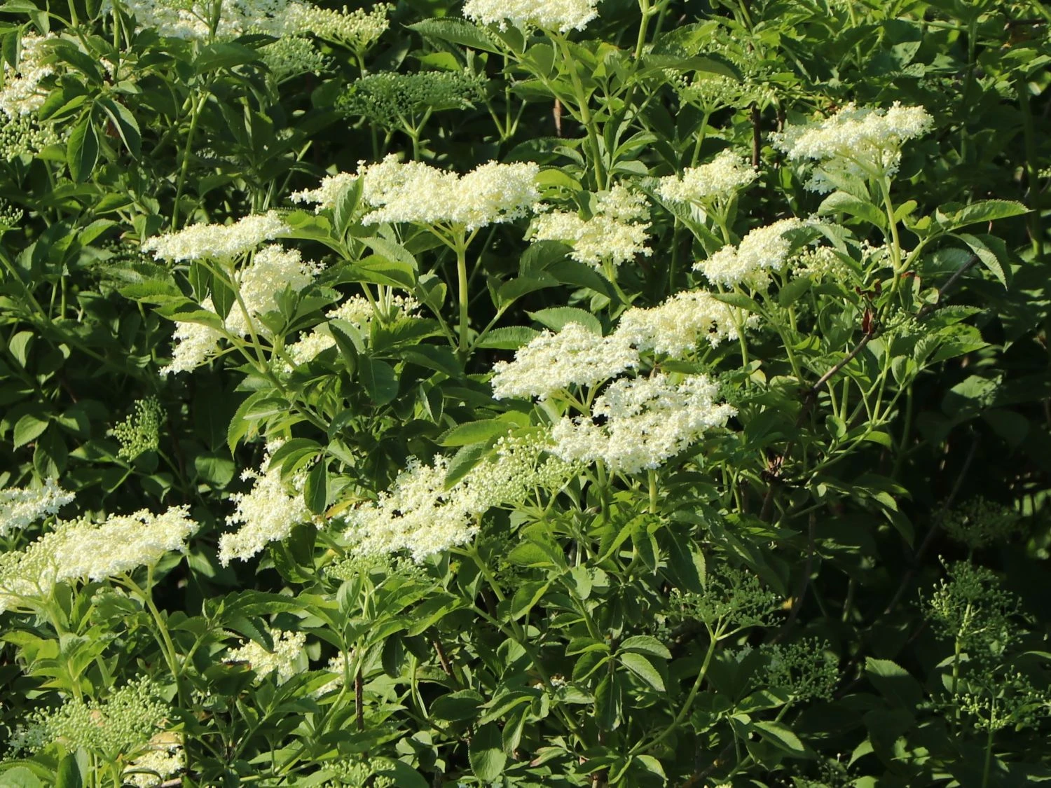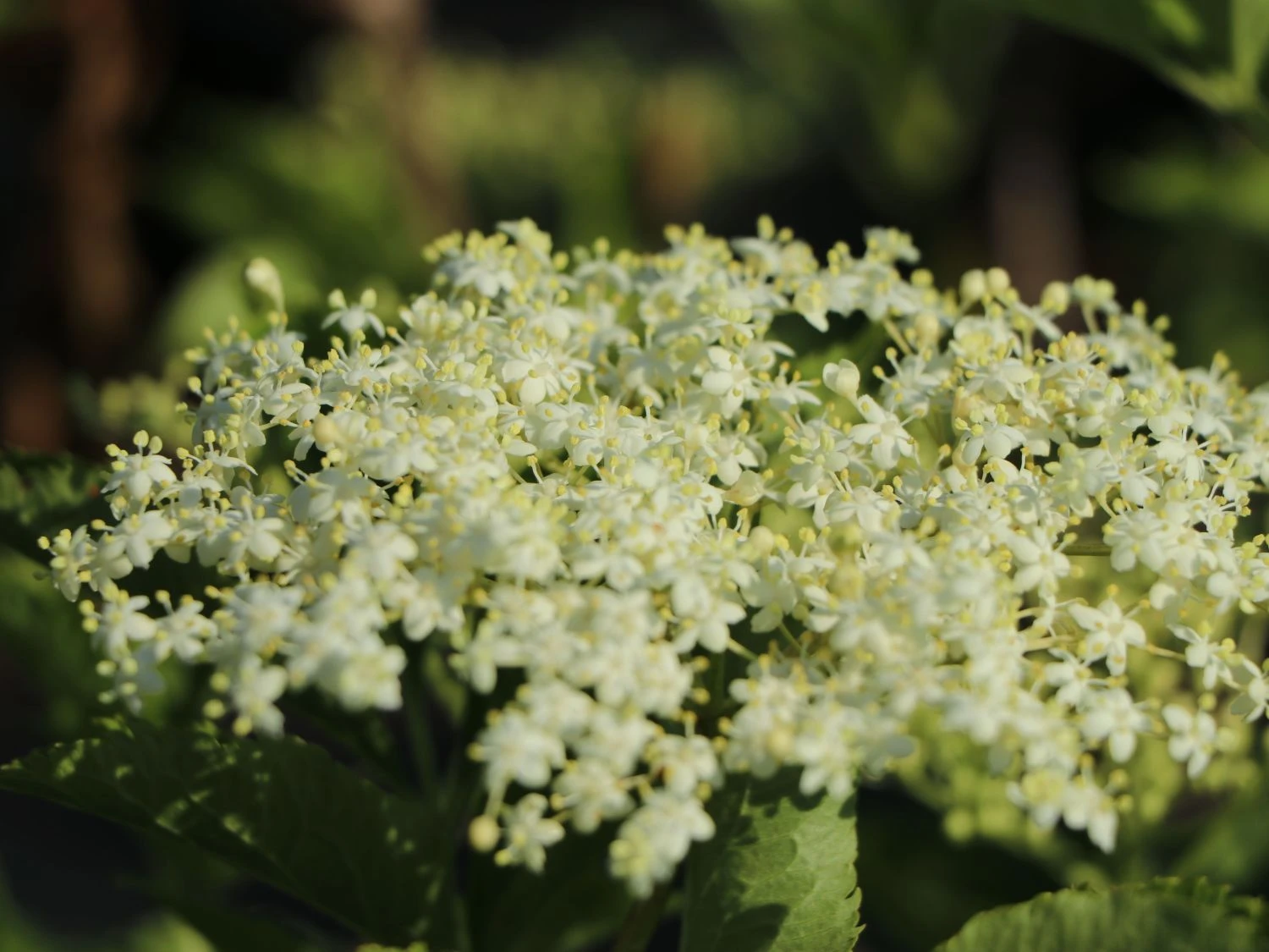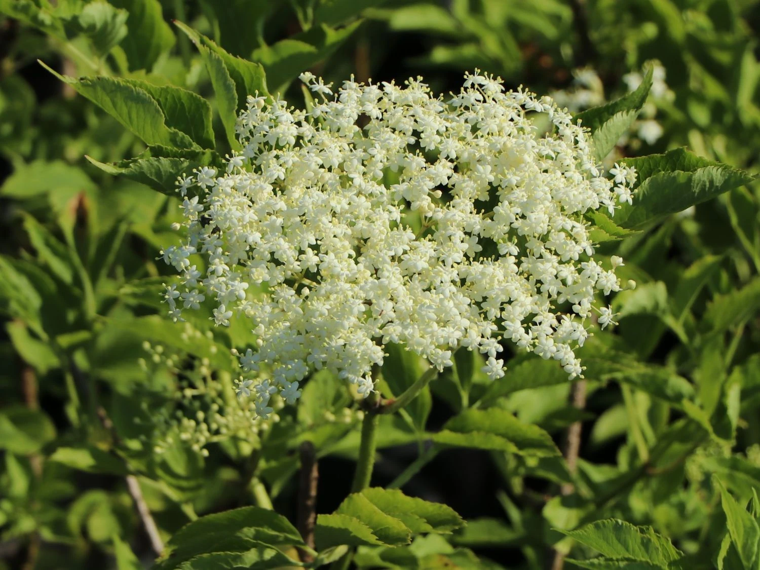 Der Holunder ‚Haidegg 17‘ bildet im Sommer, in der Zeit von Juni bis Juli, große schirmrispige Blütentrauben aus. Die Blüten lassen sich ideal zu wohlschmeckendem Holunderblütensirup weiterverarbeiten. Aus den gelblich-grünen bis cremeweißen und duftenden Blüten entwickeln sich zum Sommer hin dunkle Beerentrauben. Die Erntezeit für die Beeren ist im September. Diese sind im gegarten Zustand genießbar auf aufgrund ihres Vitamingehaltes gesund. Nur für Vögel und Wildtiere sind sie im rohen Zustand genießbar. Gekocht lassen sie sich zu Säften, Gelees oder Marmeladen weiterverarbeiten. Der winterharte und pflegeleichte Großstrauch ist robust und anspruchslos. An das Klima und den Boden stellt er keine besonderen Ansprüche. Er hat einen geringen bis mittleren Wasserbedarf. Der Strauch bevorzugt einen sonnigen bis halbschattigen Standort. Das optimale Erdreich für Sambucus nigra ‚Haidegg 17‘ ist feucht und nährstoffreich. Staunässe oder längere Trockenphasen bekommen dem Strauch nicht. Die Gehölzpflanze wächst breit aufrecht und ist mit seinen großen blühenden Dolden ein wertvolles Nährgehölz für verschiedene Insekten. Das unkompliziertes Gehölz hält sich mit seinem flachen, weitreichenden Wurzelwerk im Boden fest. Die starken Einzeltriebe haben im Innern ein weißes Mark. Der Holunder ‚Haidegg 17‘ ist gegen Wind, Kälte oder Frost unempfindlich. Der Holunder ‚Haidegg 17‘ ist für den Hausgarten sowie aufgrund seiner riesigen Dolden und seiner Ertragsstärke für den Erwerbsanbau bestens geeignet. Im Sommer bilden die großen hellen Dolden eine zauberhafte Duftwolke, im Herbst hängt der Strauch voller schwarzer Beeren. Sambucus nigra ‚Haidegg 17‘ ist im Garten als Beerenlieferant und als dekorativer Solitär eine Sensation. Der Strauch eignet sich wunderbar zum Einfassen von Grundstücken oder zum Unterpflanzen höherer, lichter Gehölzgruppen. Diese Holundersorte ist ein Muss für jeden Naturgarten und ein herausragender Strauch für den Erwerbsanbau.