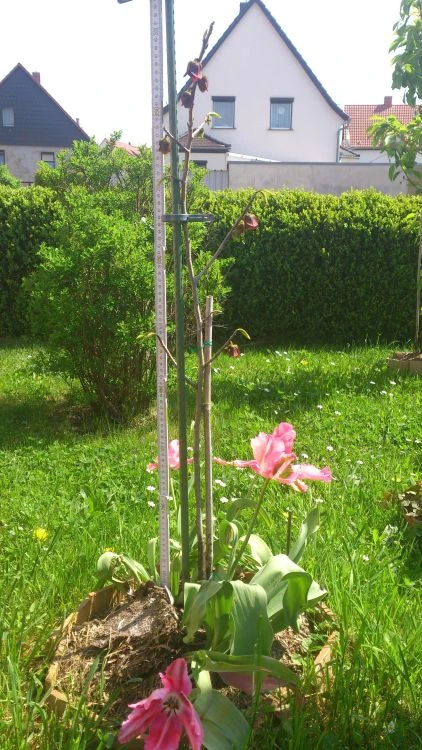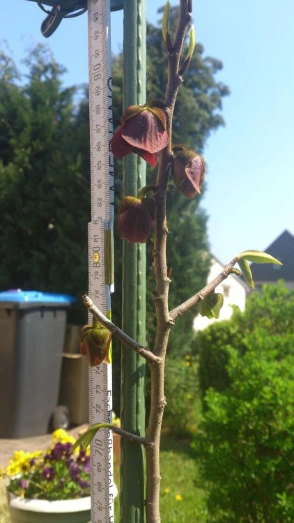 Die Indianerbanane / Papau ist ein echter Exot unter den Obstgehölzen! Dieser Newcomer stammt aus Nordamerika und der Geschmack seiner Früchte ist einfach unvergleichlich. Die Früchte sind süß und ein Aroma aus Banane, Melone und Mango. Zusätzlich wird dem Obst der (bot.) Asimina triloba eine leichter Anklang an Vanille nachgesagt. Allerdings ist die Indianerbanane / Papau nichts für ungeduldige Gärtner, denn erst nach circa drei Jahren ist mit den ersten Blüten an der Pflanze zu rechnen. Aus ihnen entstehen die exotischen Früchte auch nur, wenn ein geeigneter Befruchter in der Nähe steht. Da die Pflanzen dieser Art auf eine Fremdbefruchtung angewiesen sind, wird dazu geraten, zwei unterschiedliche Sorten zu kombinieren. Während der Blütezeit im Mai zeigen sich attraktive purpurfarbenen Glockenblüten an diesem Gehölz. Sie sind ein echter Blickfang mit Seltenheitswert! Die Indianerbanane / Papau ist ein Muss für alle Gartenbesitzer, die das Außergewöhnliche suchen. Der Strauch ist auch unter dem Namen Pawpaw oder Dreilappige Papau bekannt. Er erreicht eine Wuchshöhe von bis zu 400 cm. Die Krone von Asimina triloba gestaltet sich schmal und lässt sich bei einem regelmäßigem Schnitt auf circa 250 cm Breite halten. Die Pflanze verzweigt sich gut und bildet jährlich Neutriebe von etwa 30 cm. An ihnen erscheinen noch vor dem Blattaustrieb die Blüten.