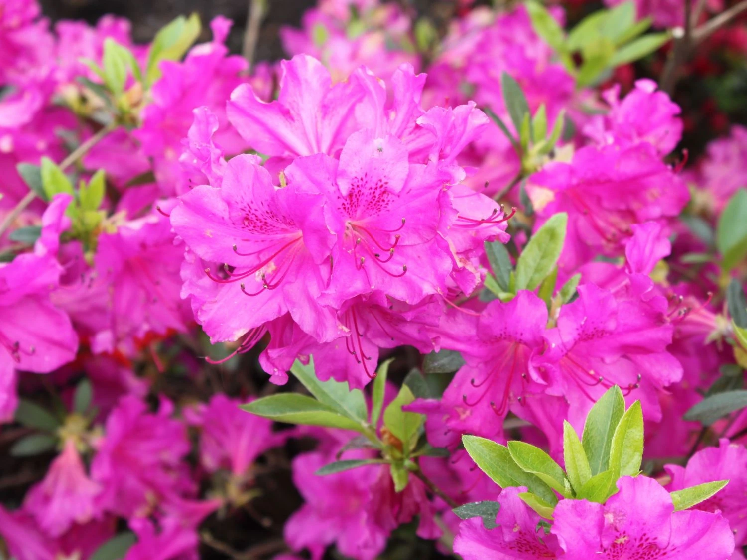 Japanische Azalee ‚Blue Danube‘ – So ein Violett trägt sonst keine andere Japanische Azalee. Diese eindrucksvollen Farben, die noch etwas purpur getönt sind, verblassen nicht. Innen wird die Blüte durch eine weinrote Zeichnung weiter verschönert.