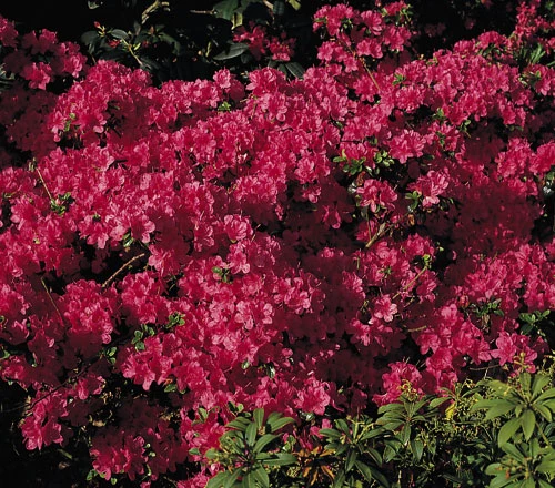 Die Japanische Azalee ‚Rubinetta‘ bietet ein wahres Blütenmeer in rubinrot. Die Blüten tragen im Inneren eine kleine dunkelrote Zeichnung und haben einen Durchmesser von 4 bis 5 cm. Die Kronen sind beinahe sternenförmig.