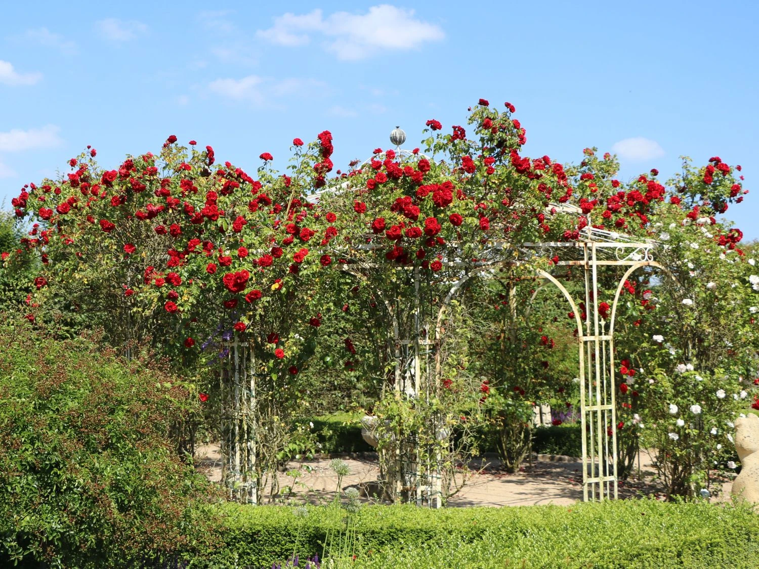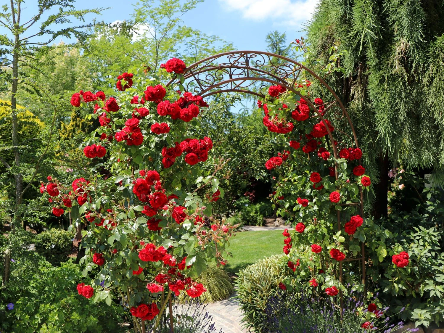 Die Kletterrose ‚Amadeus‘ ® sorgt für eine sagenhaftes rotes Blütenspektakel. Es empfiehlt sich, die verblühten Blüten regelmäßig zu entfernen, um die Blühfreude der Rosa ‚Amadeus‘ ® weiter anzuspornen. ‚Amadeus‘ ® ist robust und winterhart. Die Rose gedeiht am besten an einem sonnigen bis halbschattigen Standort. Ideal ist ein humoser, gut durchlässiger und nährstoffreicher Boden, der lehmig, tiefgründig und leicht tonig ist. Sind diese Voraussetzungen gegeben, erfreut die Rose den Gärtner jahrelang. Steigern kann dieser ihr Flair durch passende Pflanzpartner wie etwa Lavendel oder Salbei. Nach dem Einpflanzen befestigt der Gartenfreund die jungen Rosentriebe an einer Kletterhilfe. Ein Rückschnitt der Kletterrose ‚Amadeus‘ ® erfolgt nach Bedarf im Frühjahr. Der Gärtner entfernt außerdem verholzte und tote Zweige.