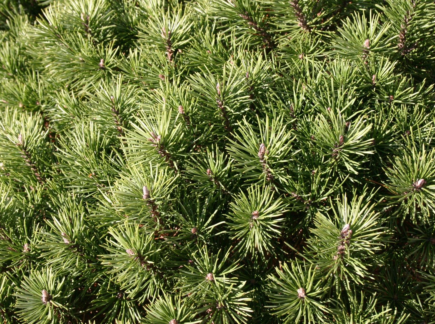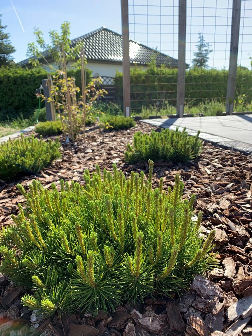Entscheidet sich der Gärtner für eine Hecke aus Kriechkiefer / Zwerglatsche / Zwergkiefer / Kniekiefer, die wenig Pflege und Schnitt erfordert, fällt seine Wahl auf die hübsche Zwergkiefer. Für die Anlage einer dichten Hecke benötigt er zwei bis drei dieser schönen Exemplare auf einem Meter. Ist eine Gehölzgruppe geplant, sind drei Pflanzen pro Quadratmeter ausreichend. Neben dem dichten und ansprechend gefärbten Nadeln punktet die Kriechkiefer / Zwerglatsche / Zwergkiefer / Kniekiefer mit ihren Zapfen. Diese erscheinen an den aufwärts gerichteten Zweigen. Die Pinus mugo pumilio bildet eiförmige bis kugelige Zapfen aus. Diese bis zu vier Zentimeter langen Kerzen reifen ab dem zweiten Jahr nach der Blüte. Während sie im ersten Jahr eine bläulichviolette Farbe aufweisen, nehmen sie im zweiten Reifejahr ein Dunkelbraun an. Gerne steht dieses vielseitig einsetzbare Gewächs in der Sonne oder im Halbschatten. Die Ansprüche der Kriechkiefer / Zwerglatsche / Zwergkiefer / Kniekiefer an den Boden sind nicht groß. Ein frischer bis mäßig trockener, durchlässiger, humoser Untergrund lässt sie wunderbar gedeihen. Leicht angefeuchtet erweist sich der Boden ideal. Bei längeren Trockenphasen in heißen Sommern freut sich diese schöne Pflanze über Wassergaben. Grundsätzlich ist ein Austrocknen der Erde zu vermeiden. Die adrette Pinus mugo var. pumilio ist robust und pflegeleicht. Nach dem Anwachsen fällt die Pflege komplett weg. Will der Gärtner den kompakten Wuchs fördern, knipst er neu ausgetriebene Kerzen im Frühjahr aus. Auf diese Weise bildet die Zwergkiefer verstärkt ihre Seitentriebe aus. Das Gehölz hat seinen natürlichen Lebensraum in den europäischen Alpen. Sehr hohe Regionen sind ihr Zuhause. Dem dortigen Klima hat sie ihr Wachstum angepasst. Selbst dem härtesten Winter hält sie stand. Sie schützt sich durch ihr dichtes, gedrungenes und langsames Wachstum. Sie zeigt sich robust, anspruchslos und standorttolerant. Die Zwergkiefer begeistert durch ihre extreme Winterhärte von bis zu -34°C. Bei Kiefern als Containerpflanzen oder auch in der Kübelkultur ist es häufig zu beobachten, dass sich Wurzelläuse ansiedeln. Diese sind für die Pflanzen nicht schädlich und erzeugen auch keinen negativen Effekt auf den Wuchs und die Entwicklung. Der weiße Belag auf den feinen Wurzeln stammt von Mykorrhiza Pilzen und ist eine typische Eigenart der Kiefern. Das eigentliche Myzel, also die Wurzel dieses Pilzes, stellt sich für das menschliche Auge als weißer Belag dar. Kiefern und Mykorrhiza leben gemeinsam in einer Symbiose, d. h. sowohl der Pilz als auch die Pflanze profitieren voneinander. Daraus lässt sich ableiten, je deutlicher der Pilzmyzel erkennbar ist, desto besser geht es der Pflanze und umso höher ist der Grad ihrer Gesundheit. Aus diesem Grund ist ein möglicherweise vorhandener Belag im Bereich der Wurzeln keine Schädigung, sondern vielmehr als qualitativ gutes Zeichen zu beurteilen, da sich auf diese Art die Gesundheit der Pflanze sogar optisch am äußeren Bereich der Wurzeln ablesen lässt.