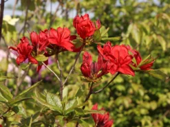 Die Laubabwerfende Azalee ‚Doloroso‘ erfreut das Auge mit ihren opulenten, intensiv leuchtenden Blüten. Sie zeichnet sich durch eine üppige Blütenfülle aus. Ihre traumhaften Dolden erscheinen zwischen dem 3. und 18. Juni. Die kelchförmigen Einzelblüten erreichen einen Durchmesser von rund 6 cm. Sie präsentieren sich in einem dunklen, flammenden Rot. In ihrem oberen Kronblatt hellt sich der Farbton etwas auf. Dank seines unvergleichlich schönen Blütenschmucks erhielt Rhododendron luteum ‚Doloroso‘ im Jahr 1991 auf der BUGA die Silbermedaille. Zudem bezaubert er mit einer attraktiven, glänzenden Belaubung. Seine Blätter sind länglich, lanzettlich geformt und am Ende leicht zugespitzt. Ihr tiefes Grün harmoniert perfekt mit dem kräftigen Rot der Blüten. Im Austrieb schimmern sie rötlich. Sie begeistern im Herbst mit einem satten Orange. Die Laubabwerfende Azalee ‚Doloroso‘ wächst aufrecht, buschig und kompakt und dabei eher breit als hoch. Ihre Höhe beträgt maximal 110 cm, die Breite liegt zwischen 100 und 140 cm.