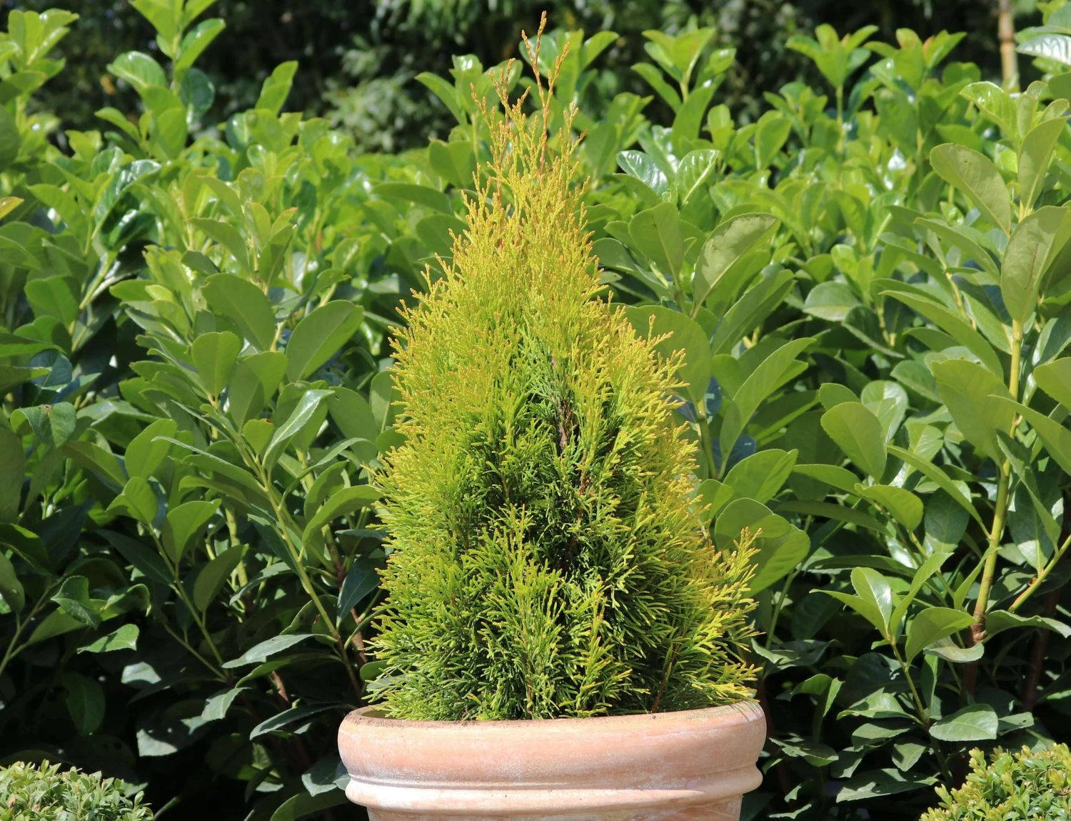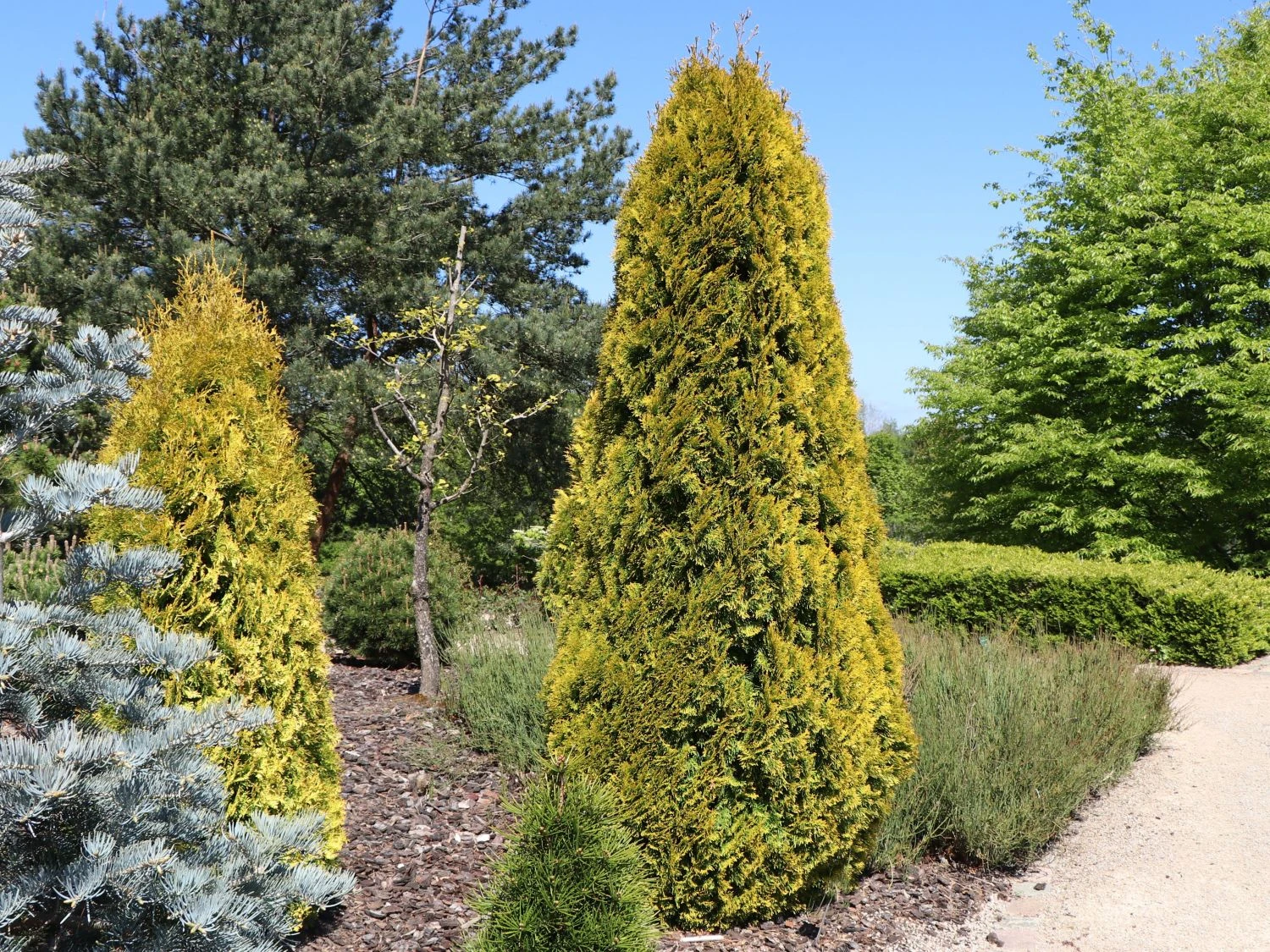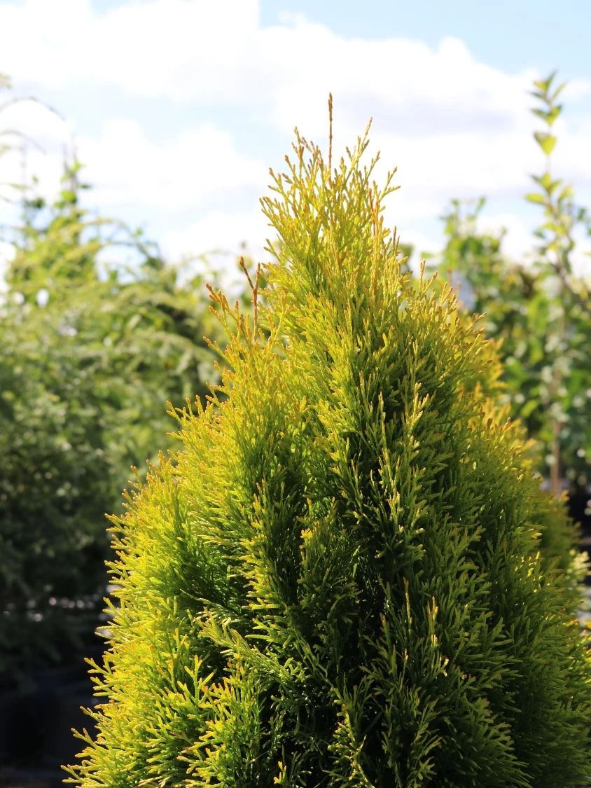 Mit dem Lebensbaum ‚Golden Smaragd‘ ® lassen sich traumhafte Lichteffekte im Garten und an vielen anderen Standorten setzen. Diese Zypresse ist das absolute Schmuckstück unter den vielen Sorten der Thuja. Der wunderschöne und bei vielen Gärtnern beliebte Lebensbaum ‚Golden Smaragd‘ ® gehört zu den Zypressengewächsen. Ursprünglich stammt er aus Nordamerika und dort aus dem östlichen Kanada. (Bot.) Thuja occidentalis ‚Golden Smaragd‘ ® ist eine in Polen gezüchtete Sorte aus Sämlingen der Thuja ‚Smaragd‘. Der Lebensbaum ist als Gartenpflanze, sowie als Hecke außerordentlich beliebt, da er ganzjährig grün ist und einen guten Sichtschutz bietet. Der Lebensbaum ‚Golden Smaragd‘ ® ist in der Aufzucht anspruchslos. Er lässt sich wunderbar in Form schneiden und macht ungeübten Gärtnern viel Freude. Ein besonderer Blickfang ist die Sorte ‚Golden Smaragd‘ ® aufgrund seiner leuchtend gelbgrünen Farbe. In der Kombination mit dunkler benadelten Lebensbäumen sorgt er für einen effektvollen Kontrast. Die Blätter des ‚Golden Smaragd‘ ® sind immergrün und glänzend. In ihrer Farbe sind sie goldgelb bis frischgrün und fallen bis in die Ferne auf.