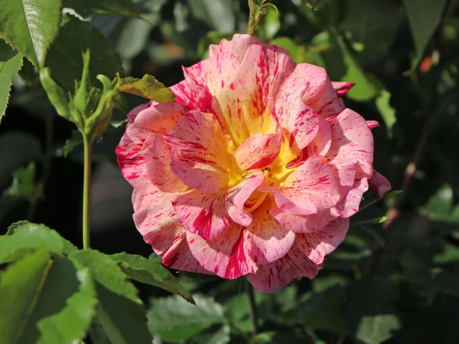 Die französische Malerrose ‚Edgar Degas‘ ® besitzt mit Dornen besetzte Triebe. Die Triebe tragen dunkelgrüne, gefiederte Blätter, die ab März zum Vorschein kommen. Vor dem Laubabwurf im Herbst färbt sich das gesunde Blattwerk hellgelb. Die mittelgroßen, farbenprächtigen Blüten von Rosa ‚Edgar Degas‘ ® erscheinen ab Juni. Sie sind zwischen 6 und 8 Zentimeter groß und erstrahlen bis in den Oktober hinein in gelben, weißen, roten und violetten Farbtönen. Die schalenförmigen, halbgefüllten Blüten duften angenehm nach Zitrone und eignen sich als Nahrungsquelle für Bienen und Hummeln. Auf einem Quadratmeter finden 5 bis 6 Pflanzen Platz. Die Malerrose ‚Edgar Degas‘ ® genießt ein sonniges bis halbschattiges Plätzchen. Sie bevorzugt durchlässigen, tiefgründigen, nährstoffreichen und frischen Boden. Jährlich wächst die Pflanze bis zu 20 Zentimeter. Mit einer Gesamthöhe von bis zu 80 Zentimetern fügt sich der Kleinstrauch in jeden Bauerngarten ein. Die widerstandsfähige Malerrose ‚Edgar Degas‘ ® verträgt jährliche Rückschnitte und blüht jeden Sommer zuverlässig. In der Floristik eignet sich die Rose als außergewöhnliche Schnittblume, da jede Blüte individuell erscheint. Diese schöne Sorte ist einzigartiges Meisterwerk, das Schönheit, Gesundheit und Stärke ausstrahlt.