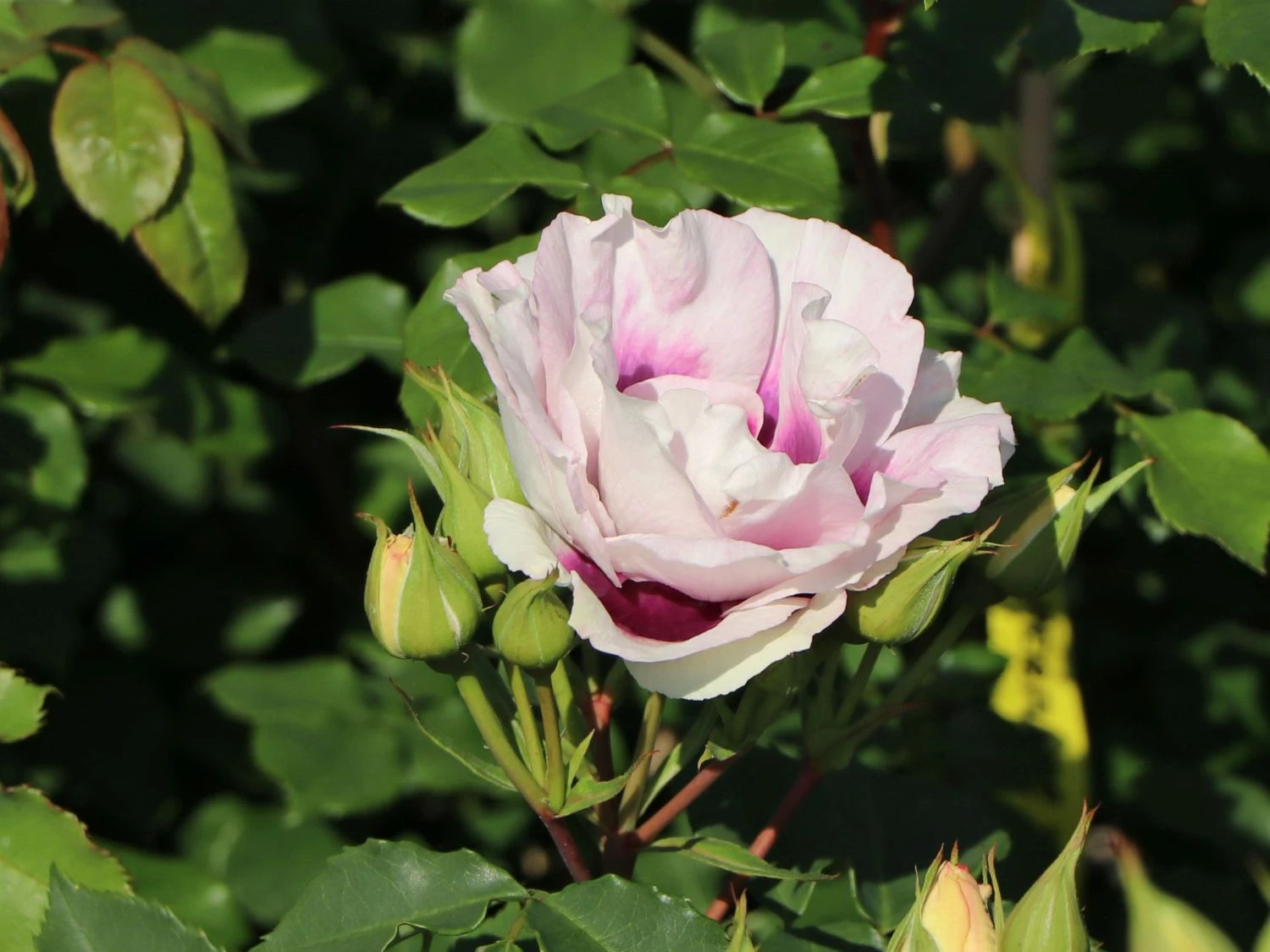 Die Persische Rose Hugs and Kisses ® ‚Eyes for You‘ begeistert durch ihre reichhaltige Blüte und spielt mit ihrer besonderen Optik eine außergewöhnliche Rolle im Garten. Die Blüten von (bot.) Rosa persica Hugs and Kisses ® ‚Eyes for You‘ sind zweifarbig und begeistern in einem auffallenden Purpurrot-weiß. In der Zeit von Juli bis August lassen sich diese farbintensiven Blüten in üppiger Fülle bewundern. Die Persische Rose Hugs and Kisses ® ‚Eyes for You‘ ist keine Einzelgängerin und umgibt sich sehr gerne mit verschiedenen anderen Blühpflanzen. Beliebte Begleiter sind beispielsweise niedrige Stauden wie Salbei oder Lavendel. Der Wuchs der Persischen Rose Hugs and Kisses ® ‚Eyes for You‘ ist buschig und aufrecht. Die schönen Blüten sind von dunkelgrünen, gefiederten, wechselständig angeordneten Blättern umgeben. Diese wunderschöne Rose steht am liebsten an einem sonnigen bis halbschattigen Standort, da sie sowohl das Licht als auch die Wärme liebt.