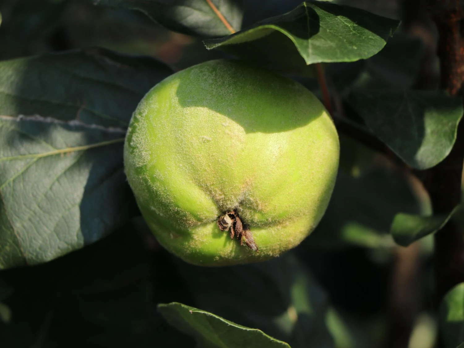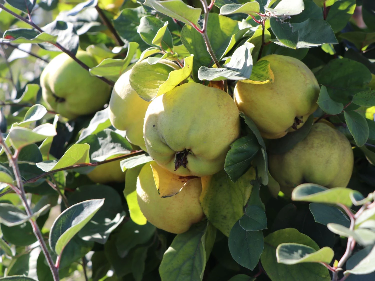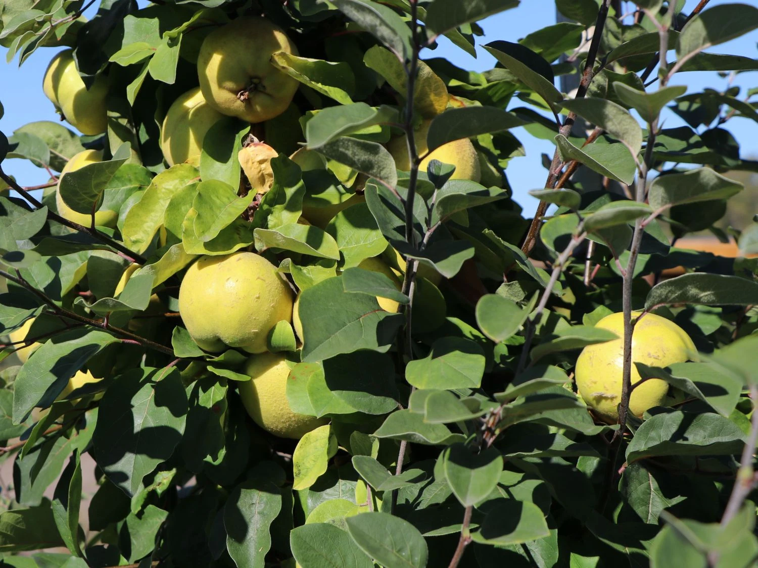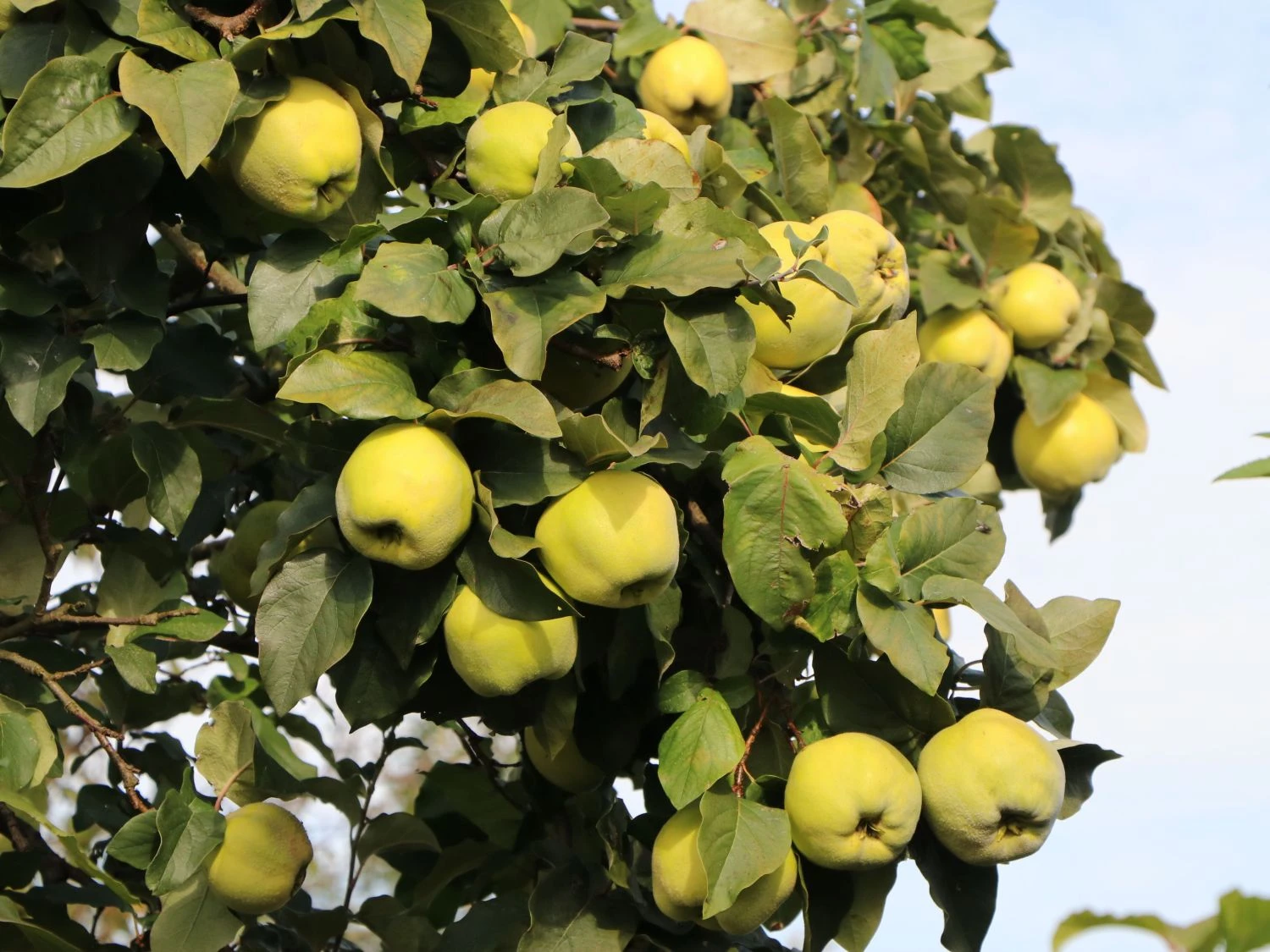 Sommergrün sind ihre Blätter, die zudem spitz zulaufend, leicht wellig, oval und dick am Obstbaum verweilen. Dazu kommen in den Monaten April bis Mai große, einfache, weiße Blüten, die allein schon das Herz des Betrachters erfreuen. Diese kündigen jedoch eine reiche Ernte der großen, mittelfesten, apfelförmigen, oft auch breit birnenförmigen Früchte, die bis in den November haftend sind, an. Normalerweise kann der Gärtner die Früchte von Mitte bis Ende Oktober ernten und sich am Aroma der angenehm duftenden und wohlschmeckenden Früchte erfreuen. Überhaupt sind die Früchte der Grund, weshalb sich Hobbygärtner dieses Obstgehölz in den Garten holen. Die früh reifenden Früchte können von Oktober bis Dezember verwertet werden und zeichnen sich durch ihr weiß bleibendes Fruchtfleisch auch beim Kochvorgang aus. Sie sind vielseitig für Marmelade, Gelee, Likör oder als klarer Saft verwertbar und können als aromatische Beilage oder Duftapfel zusätzlich Verwendung finden. Die Quitte ‚Riesenquitte von Leskovac‘ ist selbstfruchtend, kann jedoch mit einer anderen Sorte befruchtet den Ertrag steigern. Die Frucht der ‚Risenquitte von Leskovac‘ ist groß bis sehr groß und hat eine unregelmäßige Form. Die Schale der Frucht ist goldgelb bis gelb und weist an der Sonnenseite oftmals wenige grüne Flecken auf. Der Geruch der Frucht der Zwerg-Apfelquitte ‚Leskovac‘ ist stark und angenehm aromatisch. Ziemlich anspruchslos erträgt sie einen Standort von sonnig bis schattig und einen normalen Gartenboden, der kalkarm und gut durchlüftet ist. Der Obstbaum Cydonia ‚Riesenquitte von Leskovac‘ wächst stark und breit aufrecht. An guten Standorten erreicht sie eine unglaubliche Höhe von 3,50 bis 5 Metern. Damit gehört die Cydonia ‚Riesenquitte von Leskovac‘ zu den Riesen unter den Quitten. Eine Beeindruckende Sorte für den Hausgarten!