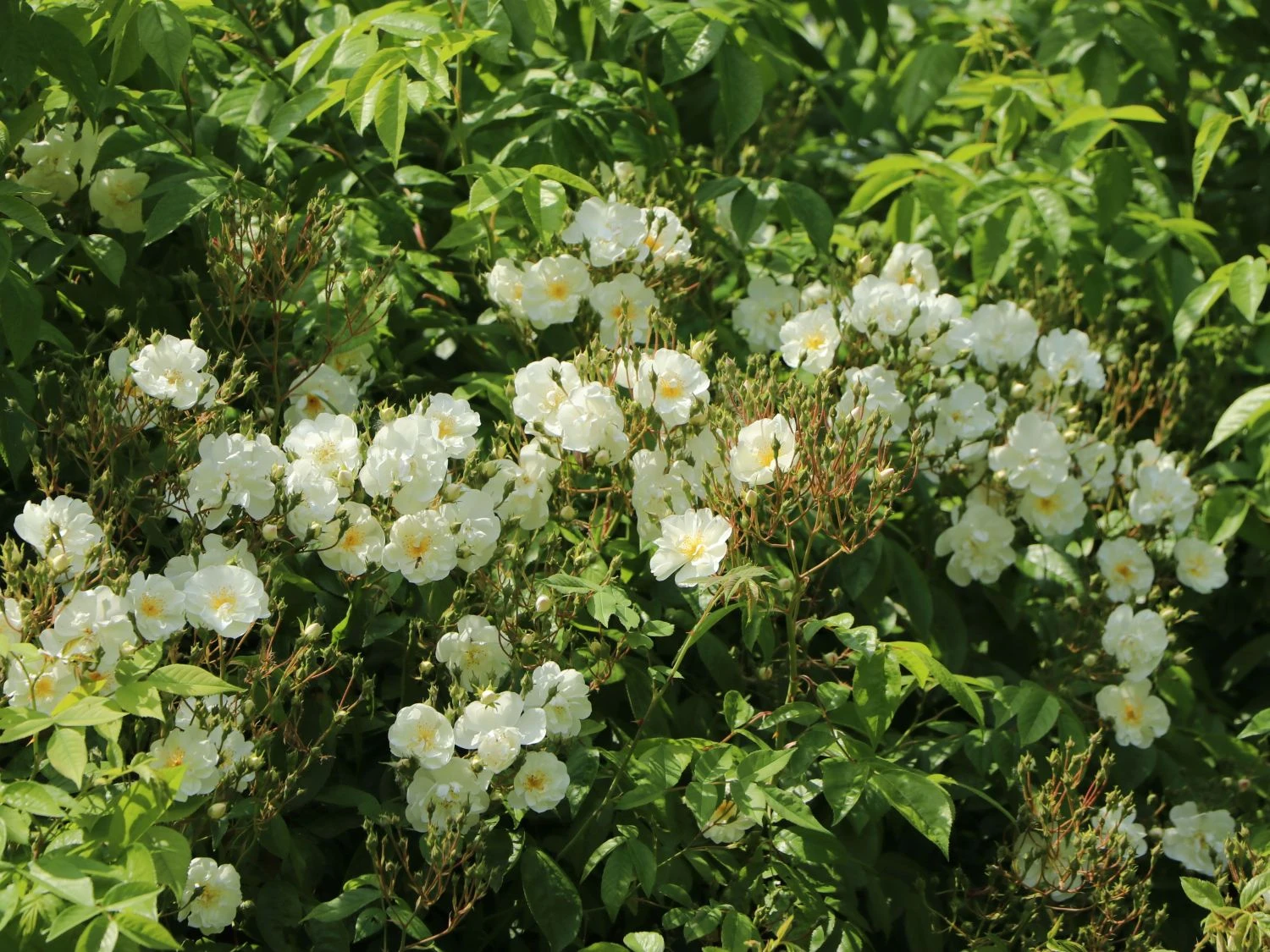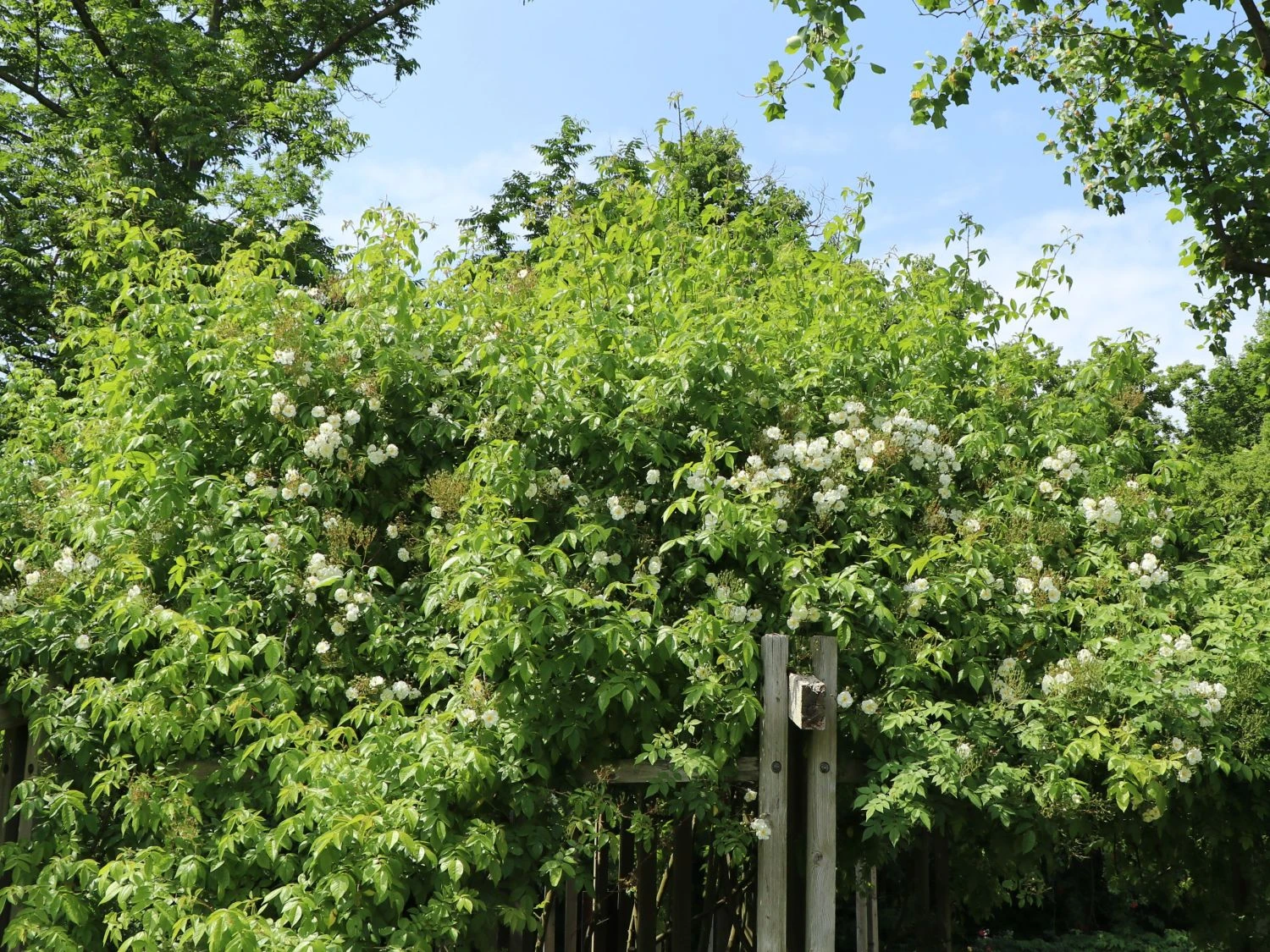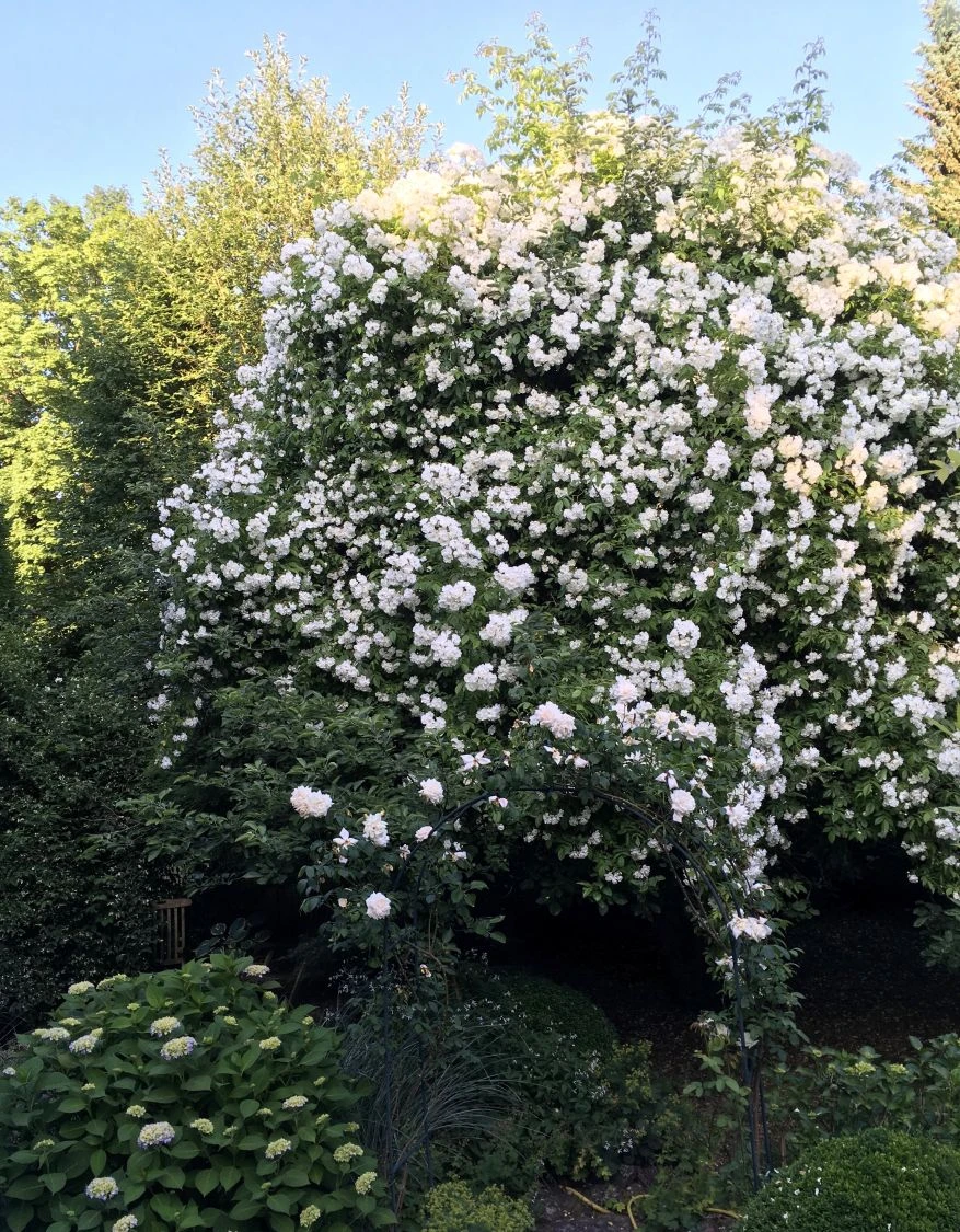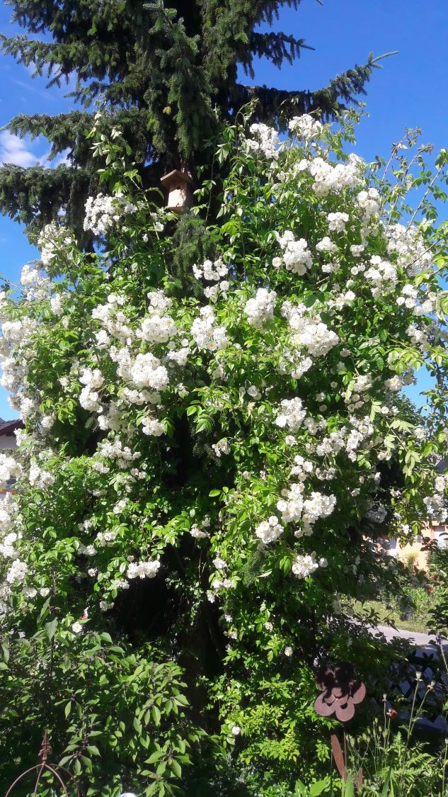 Bei der Ramblerrose ‚Bobby James‘ ist jeder richtig, der nicht genug von rahmweißen Blüten kriegen kann. Die Bezeichnung überreich ist vielleicht sogar noch untertrieben, wenn man sich die Fülle an einfachen, kleinen Blumen betrachtet. Außerordentlich ist auch der intensive Duft dieser einmalblühenden Sorte.