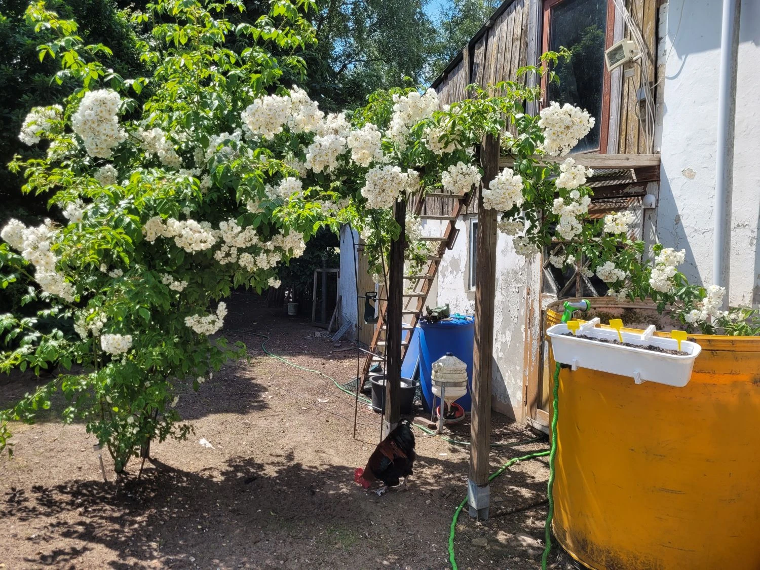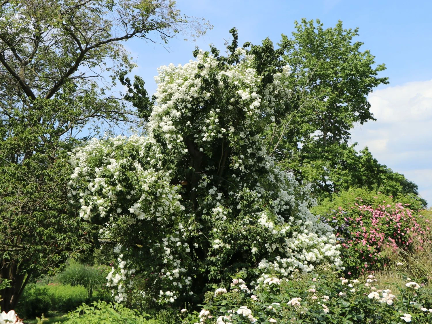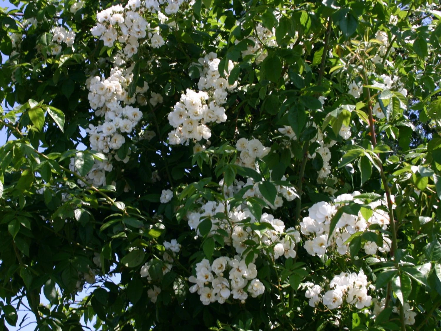 Bei der Ramblerrose ‚Bobby James‘ ist jeder richtig, der nicht genug von rahmweißen Blüten kriegen kann. Die Bezeichnung überreich ist vielleicht sogar noch untertrieben, wenn man sich die Fülle an einfachen, kleinen Blumen betrachtet. Außerordentlich ist auch der intensive Duft dieser einmalblühenden Sorte.