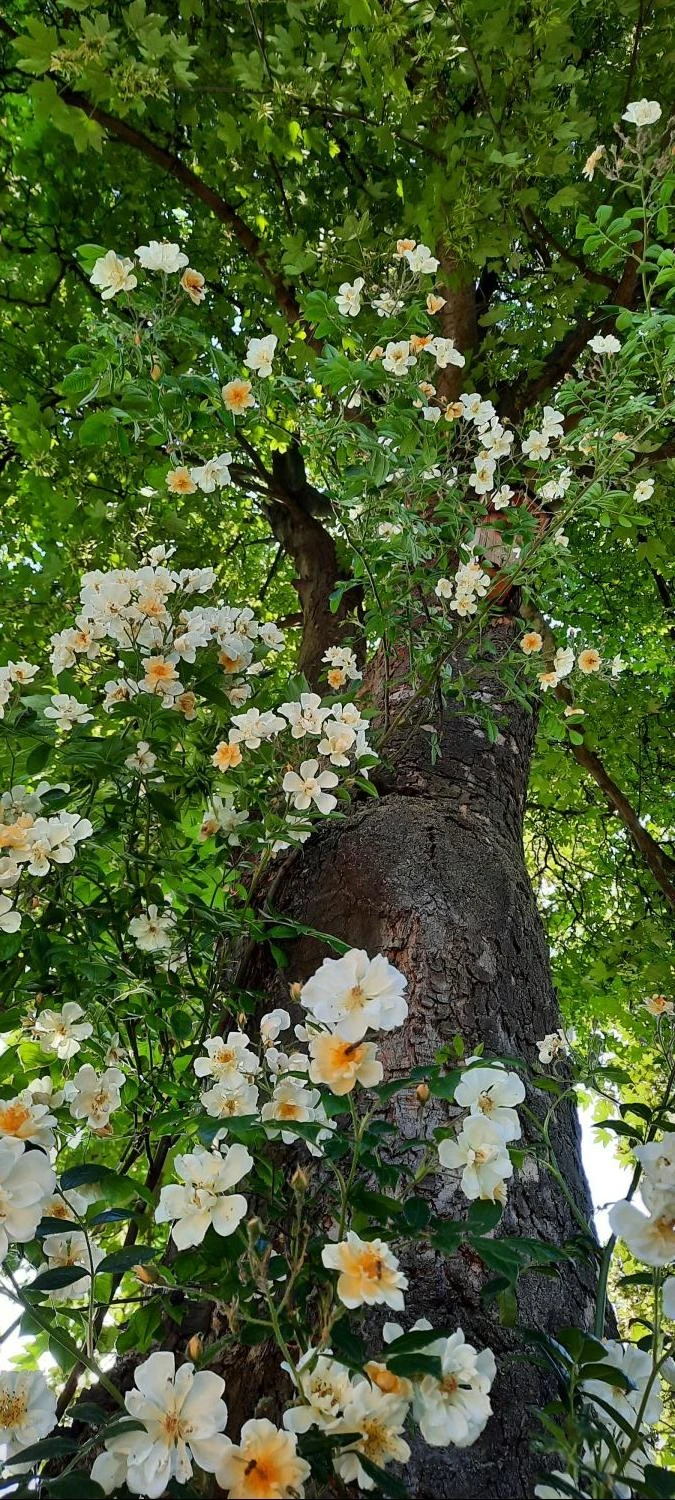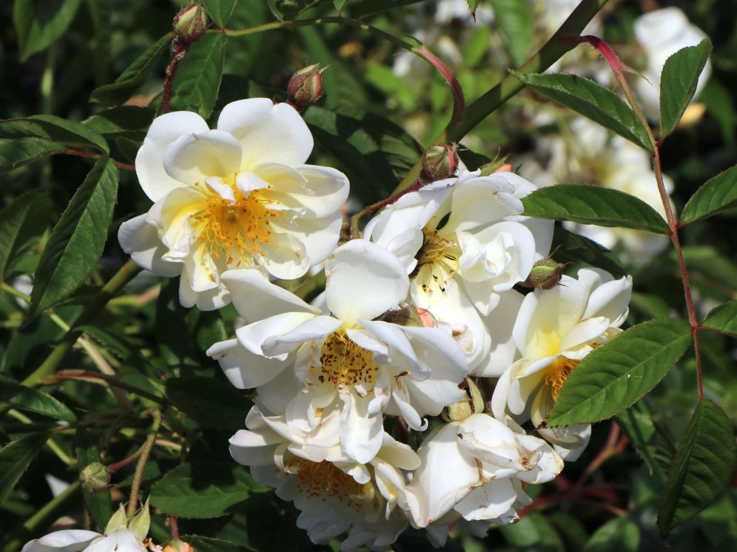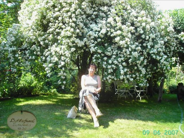 Einen schönen Kontrast zur hellen Blütenpracht bildet ihr grünes, wundervoll glänzendes Blattwerk, das die Blüten eindrucksvoll in Szene setzt. Im Herbst zieren kleine orange Hagebutten den Rosenstrauch. Was den Standort betrifft, ist die Ramblerrose ‚Lykkefund‘ unkompliziert. Gern steht sie in der Sonne. Auch halbschattige Standorte erobert die Pflanze mühelos. Am besten entwickelt sich die Ramblerrose in humosem Boden. Der Gartenfreund befestigt die jungen Triebe beim Pflanzen mit einem Strick an eine Kletterhilfe, ohne sie einzuschnüren. Alles andere übernimmt die Rosa ‚Lykkefund‘ in eigener Regie. Mit lichten Baumkronen verschmilzt sie in zauberhafter Symbiose. In diesem Fall ist es sinnvoll, sie rund einen Meter vom Stamm entfernt im Halbschatten zu pflanzen. Ihre langen Ranken streben problemlos in die Baumkrone, der Sonne und der Wärme entgegen. Die schnell wachsende Rose erreicht in kurzer Zeit ihre maximale Wuchshöhe von bis zu sieben Metern. Hat sie im Boden Fuß gefasst, sind häufiger Jahrestriebe von drei Metern zu beobachten. Erhält die Kletterrose ausreichenden Platz, breitet sie sich bis zu vier Meter aus. Wichtig ist, dass die wuchsfreudige Rose eine stabile Rankhilfe erhält, die ihr zunehmendes Gewicht auch nach Jahren mühelos trägt. Bei Platzmangel lässt sie sich mühelos zurückschneiden. Allerdings verringert sich im Folgejahr die Blütenzahl, da die Ramblerrose ‚Lykkefund‘ an den Trieben des Vorjahres ihre Knospen bildet. Plant der Gärtner einen stärkeren Rückschnitt, ist der Herbst oder das Frühjahr der beste Zeitpunkt. ‚Lykkefund‘ macht überall eine gute Figur. Eine wild-romantische Liaison geht sie mit Obstbäumen ein. Im Frühling blühende Bäume schmückt sie im Sommer mit einem zweiten Blütenmeer und verwandelt ihr komplettes Umfeld in ein märchenhaftes Gartenparadies.