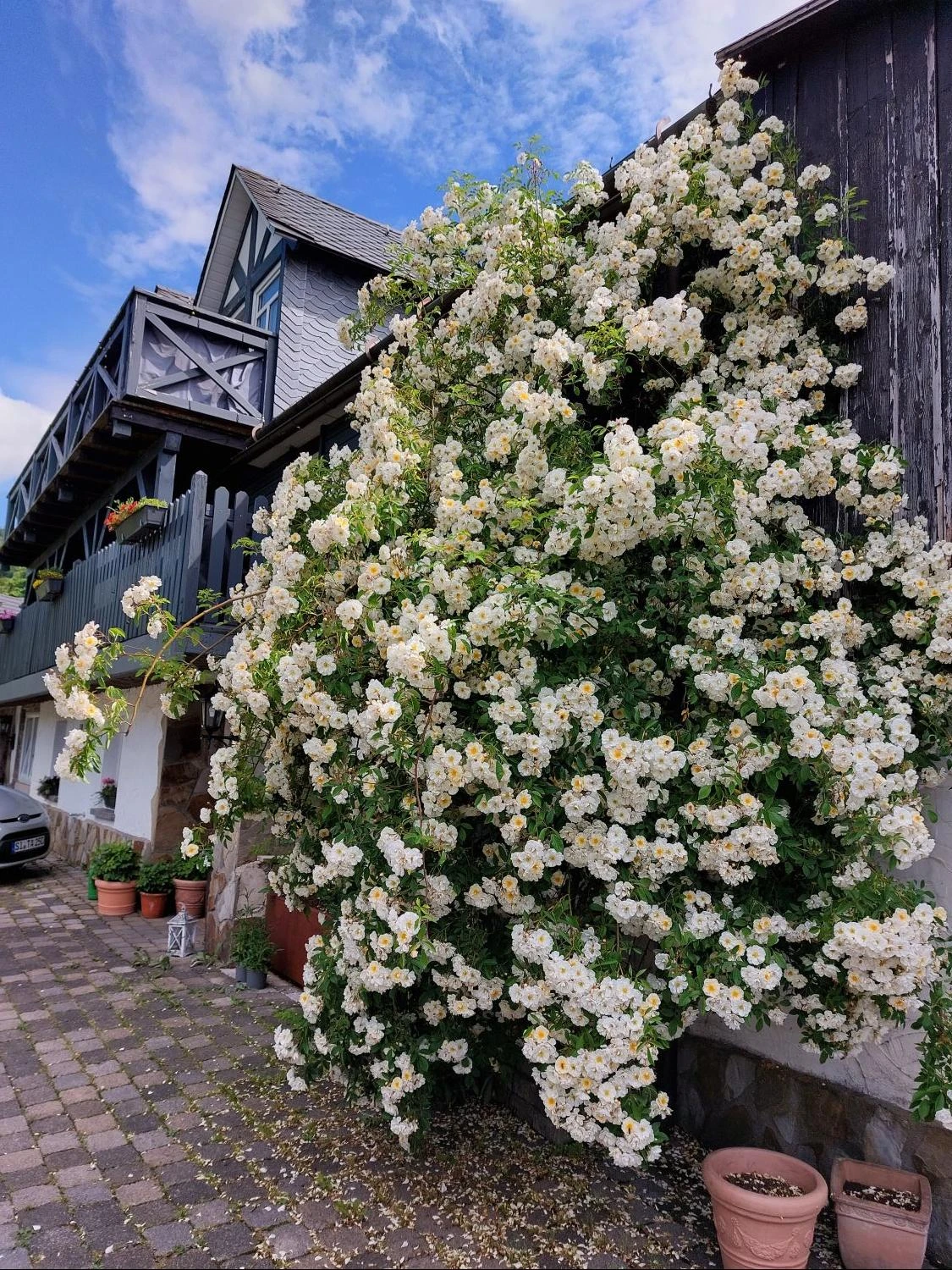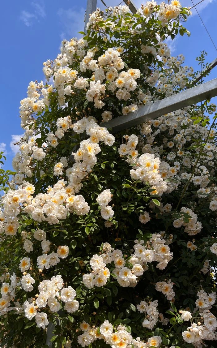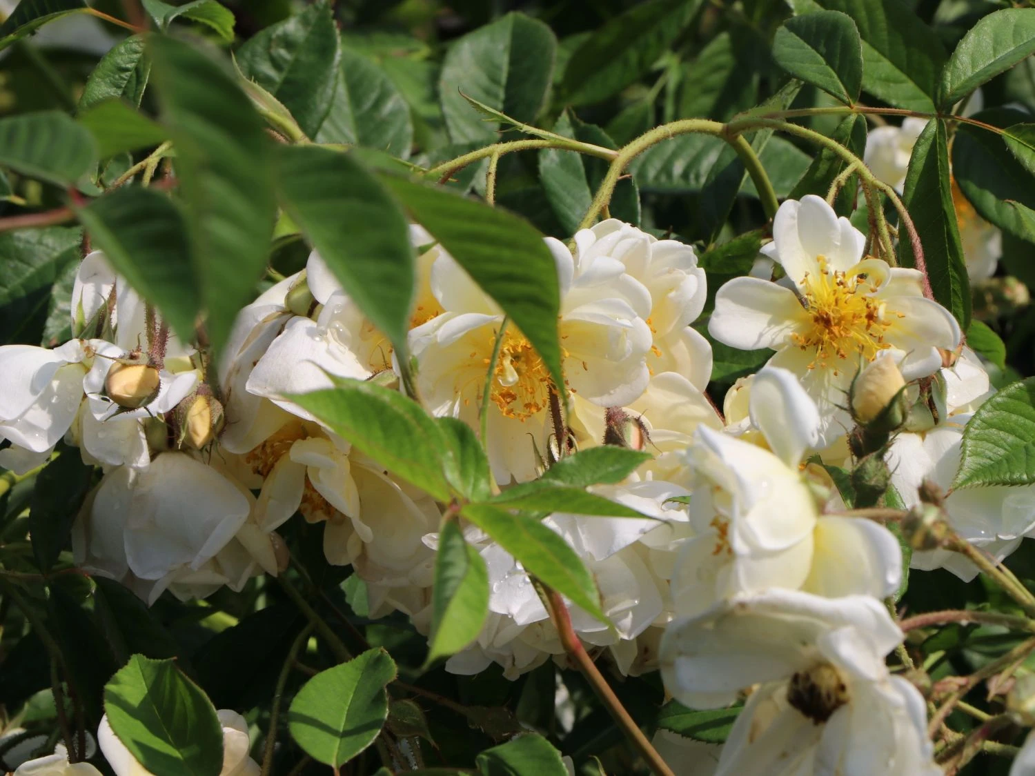 Die Ramblerrose ‚Lykkefund‘ ist mit ihrem überschwänglichen Blütenmeer der Star in jedem Garten! Das Beste: Die schnell wachsende Rose bildet nahezu dornenlose Triebe! Zudem erfreuen die unzähligen cremeweißen Blüten den Betrachter. Von Juni bis Juli läuft das Rosenwunder zur Höchstform auf und stiehlt anderen Pflanzen im Garten die Show. Besonders attraktiv wirkt (bot.) Rosa ‚Lykkefund‘ an Rosenbögen, Pergolen oder in Bäumen. Jeden Garten verwandelt die robuste und winterharte Ramblerrose während ihrer mehrwöchigen Blütezeit in ein cremeweißes Meer. Die liebliche ‚Lykkefund‘ stammt ursprünglich aus Dänemark. Sie entstand im Jahr 1930 und ist eine Zucht des bekannten Rosenexperten Aksel Olsen. Als biologische Eltern gelten die Wildrose Rosa helenae und die historischen Bourbonrose Zéphirine Drouhin. Kein Wunder, dass sich diese Sorte mit ausgesprochener Eleganz und robustem Wesen präsentiert. Längst hat die aus Dänemark stammende Kletterrose weltweit die Gärtnerherzen erobert und unzählige Bewunderer gefunden, die sich an ihrem Blütenreichtum begeistern. Daneben lässt sich die pflegeleichte Ramblerrose vielfältig einsetzen. Sie passt in jeden Garten und verleiht ihm ein romantisches Flair im Stil englischer Gärten. Niemand entzieht sich dem einzigartigen Anblick einer von ihr berankten Mauer oder eines alten Gartenhauses! Ihren Hauptauftritt feiert die überschwänglich blühende Ramblerrose von Juni bis Juli. Dicht an dicht stehen die kleinen Blüten in Büscheln an den langen, biegsamen Ranken. Einmal im Jahr blühend, verzaubert die Ramblerrose ‚Lykkefund‘ ihre Umgebung mit ihrem lieblichen Duft. Aus den Knospen entwickeln sich anfangs apricot-gelbliche Blüten, deren Farbe langsam verblasst und in ein elegantes Cremeweiß übergeht. Das Innere der Blüten präsentiert schöne Staubgefäße und behält einen warmen Gelbton. Die einfachen Blüten sind zum Teil leicht gefüllt und bilden einen magischen Anziehungspunkt für Bienen, Hummeln und andere nützliche Insekten.