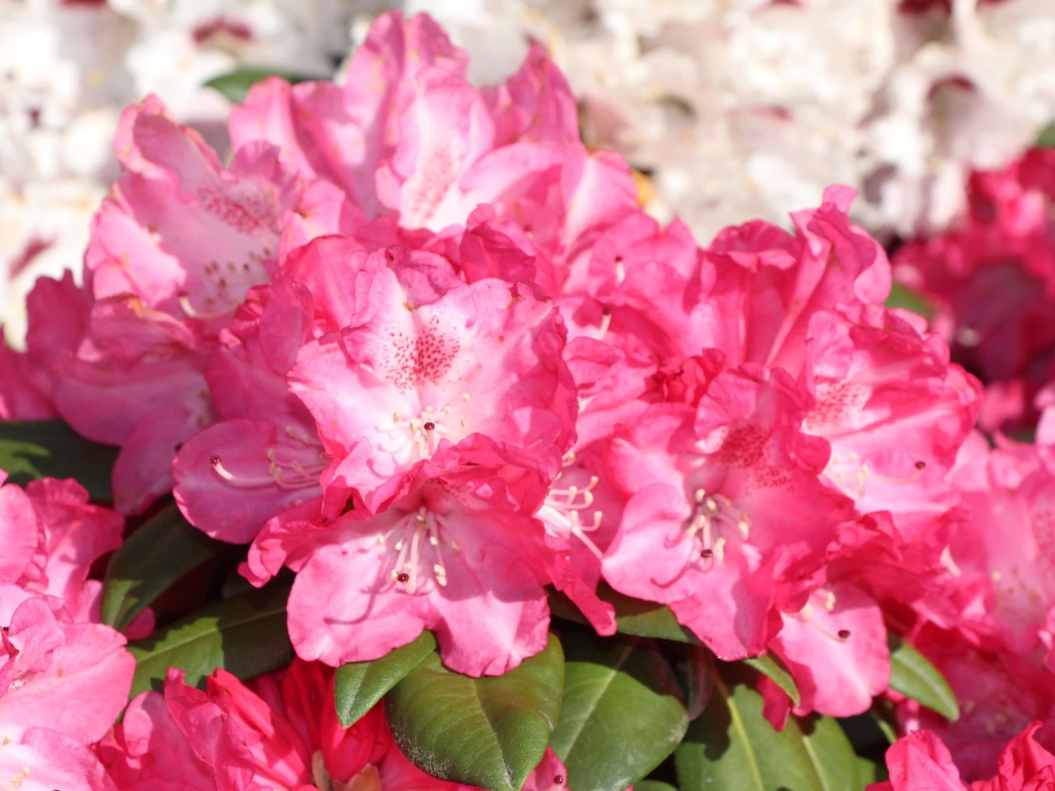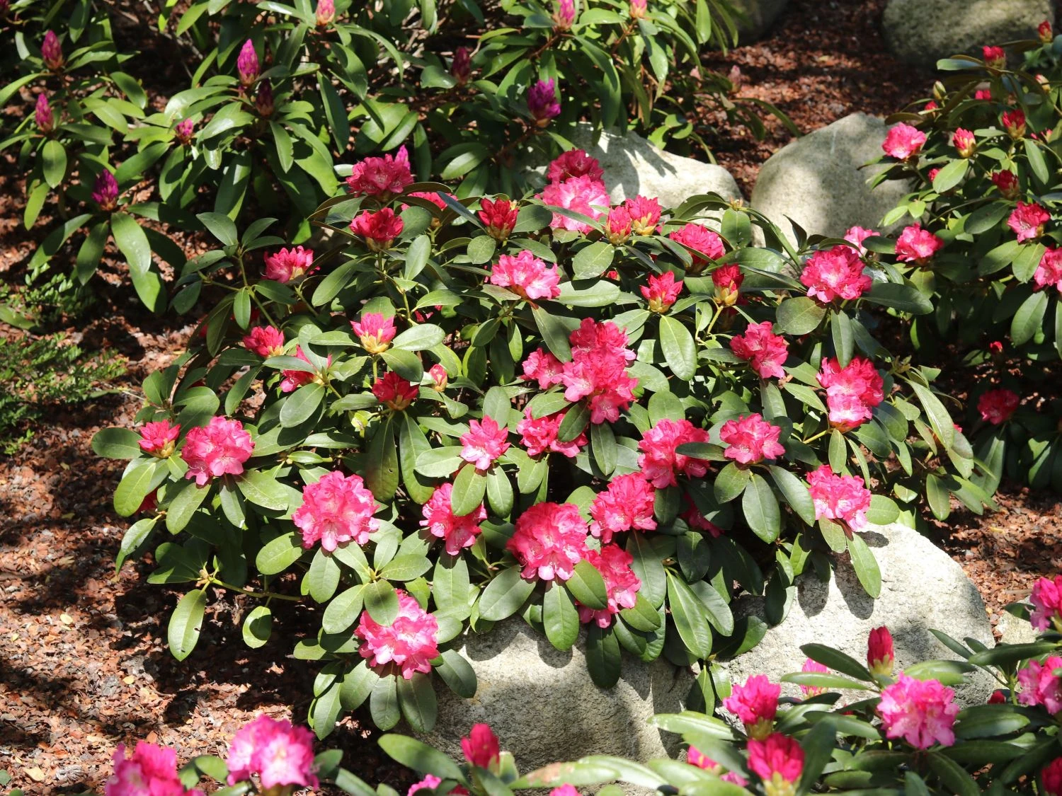 Der Rhododendron ‚Anuschka‘ ist ein kleiner und langsam wachsender Zierstrauch mit beeindruckender Blütenfülle. Die Blüten werden über 10 cm groß und leuchten dunkelrosa. Außen sind die Kronblätter dunkelrosa, sie hellen nach innen immer mehr auf bis sie nahezu weiß sind. Die rotbraune Zeichnung ist das I-Tüpfelchen bei dieser Sorte. (Bot.) Rhododendron yakushimanum ‚Anuschka‘ blüht von Ende Mai bis Mitte Juni. In dieser Zeit wirkt er wie ein Meer aus rosa Blüten und zieht alle Blicke magisch an. ‚Anuschka‘ zählt zu den schönsten rosa blühenden Sorten mit einer atemberaubenden Strahlkraft. Die weit geöffneten Blüten ziehen auch Bienen und Hummeln an. Der Rhododendron wird zwischen 100 und 140 cm hoch und bis zu 160 cm breit. Er ist ein Hingucker in Gärten, auf Friedhöfen oder in Parkanlagen. Auch in Dachgärten oder Innenhöfen setzt er traumhafte Akzente. Der Rhododendron ‚Anuschka‘ passt vorzüglich in Japanische Gärten und eignet sich zum Unterpflanzen von größeren Bäumen. Aufgrund seiner kompakten und dichten Wuchsform ist dieser Rhododendron zudem ein praktischer Sichtschutz.