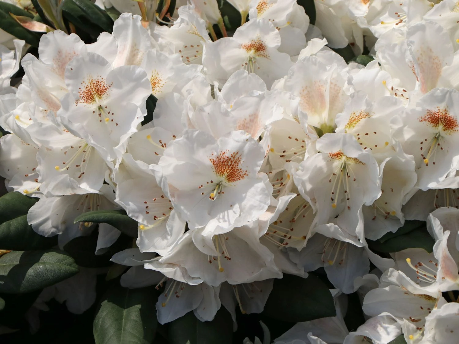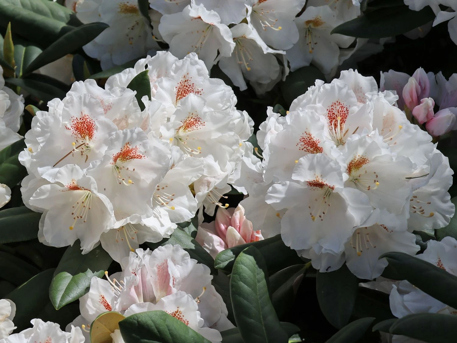 Rhododendron ‚Apollonia‘ – es dauert ein wenig, bis seine weißen Blüten ihren Rosa-Hauch verlieren und sich in einem reinen Weiß zeigen können. Aber dann ist die rotbraune Zeichnung auf dem oberen Kronblatt besonders eindrucksvoll. Dafür sorgen auch die gewellten Säume der Blüten, die einen Durchmesser von bis zu 8 cm haben können.