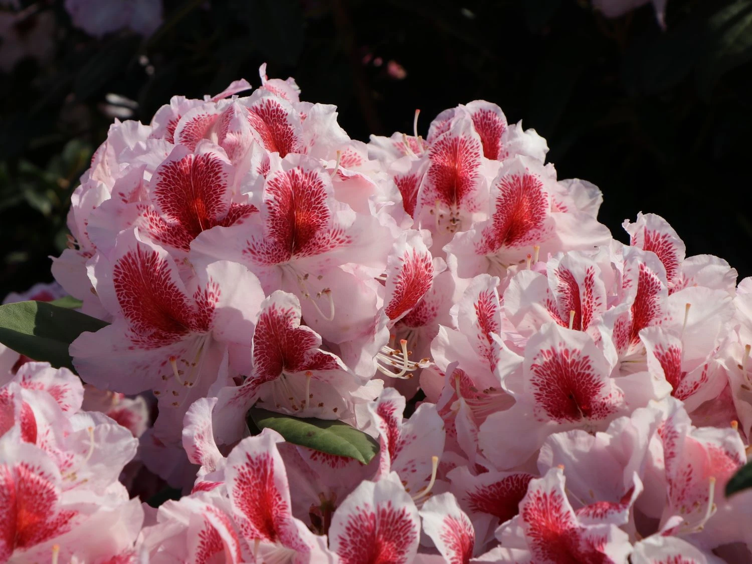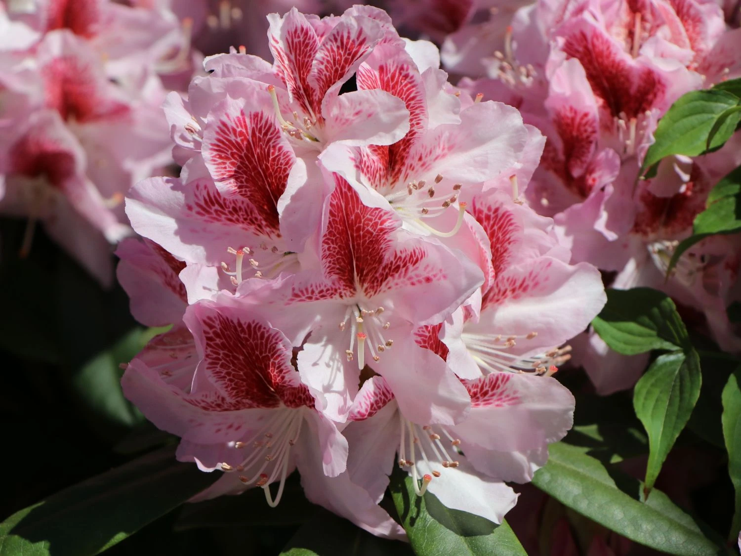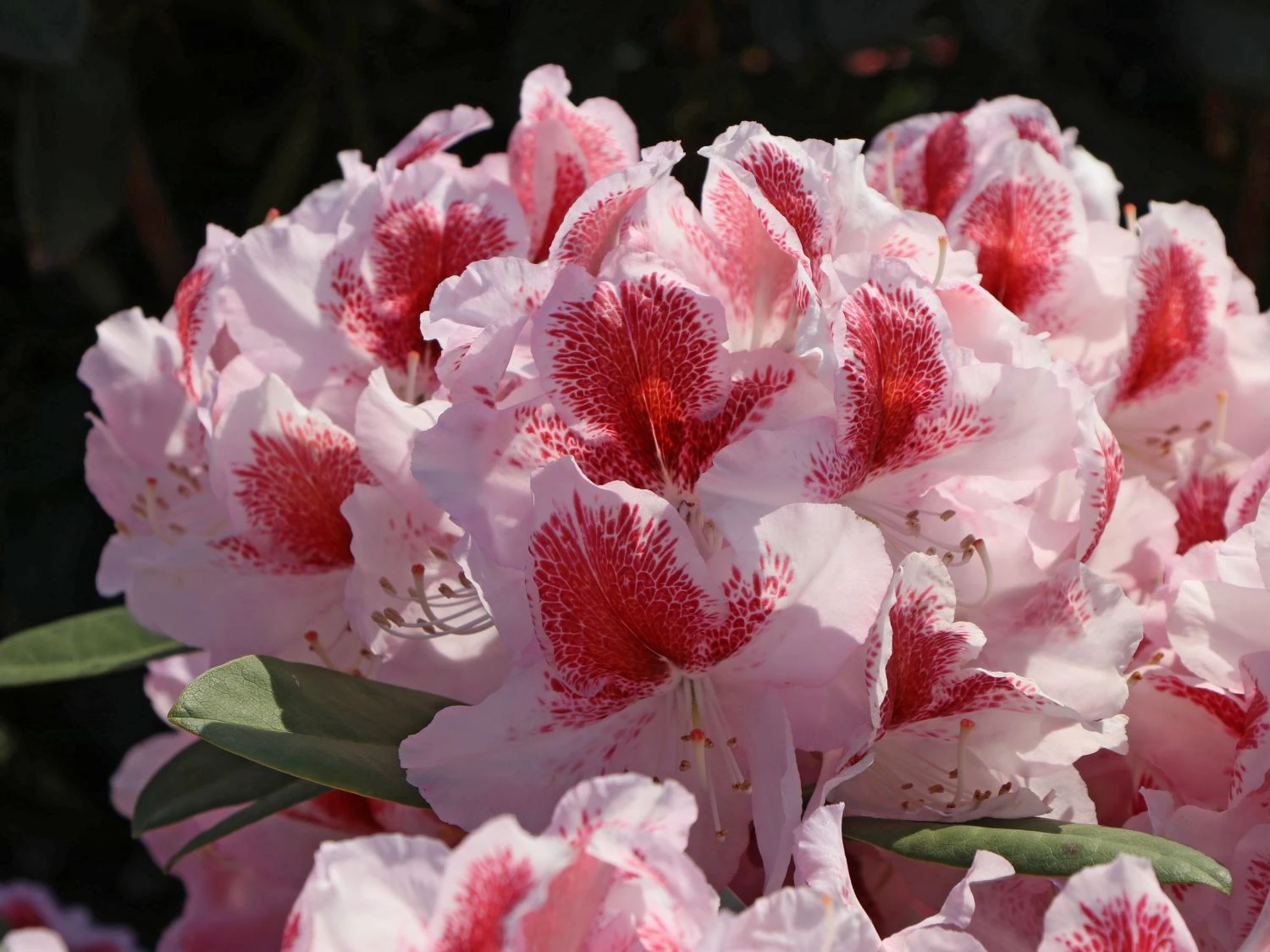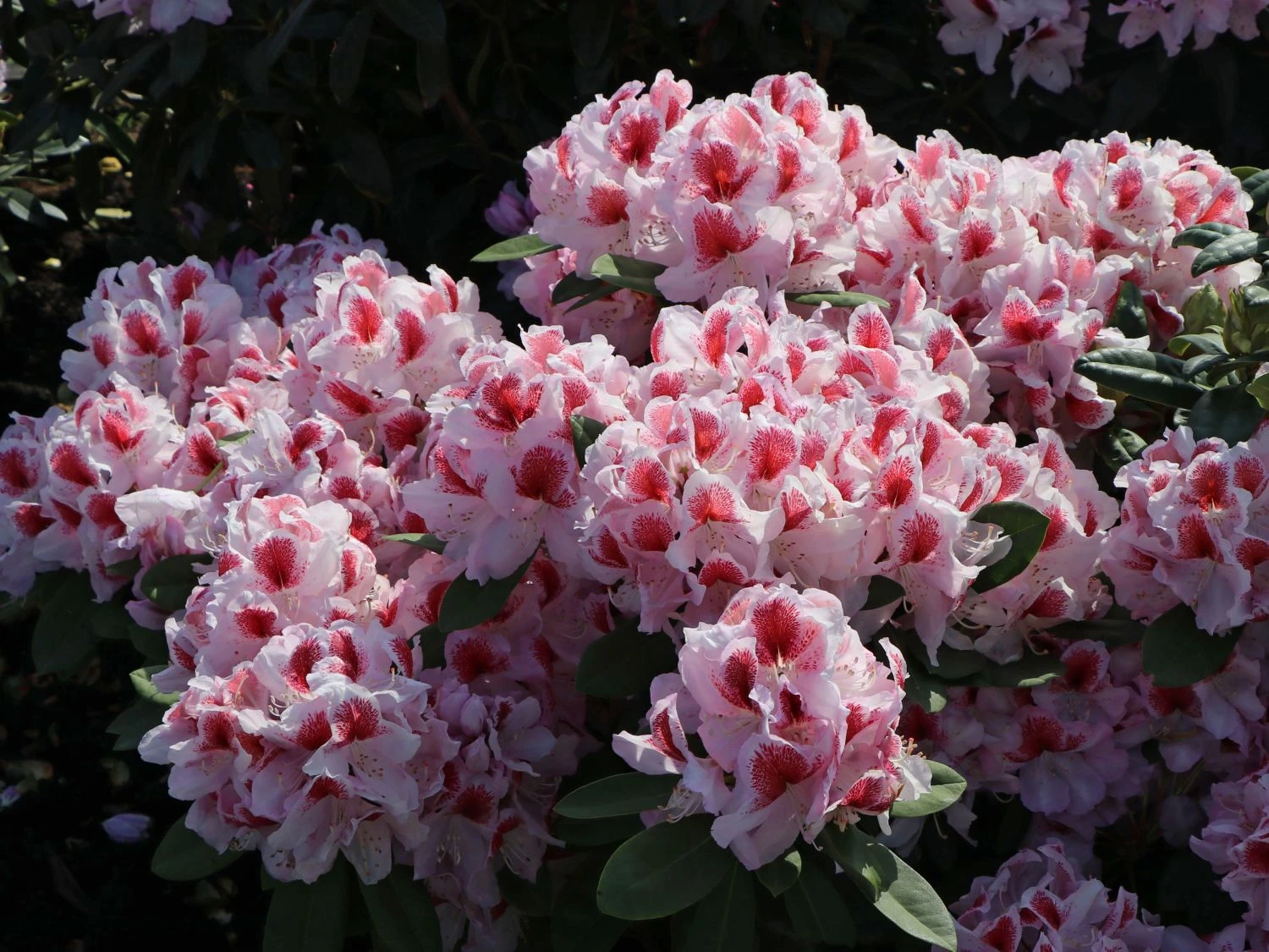 Der Rhododendron ‚Belami‘ ® zeichnet sich durch seine auffällige Blütenpracht aus. Von Mitte Mai bis Anfang Juni bezaubert er mit großen, rosig-weißen Blüten. Die auffällige, großflächige, rote Zeichnung macht den Flor besonders attraktiv. Die Blütensäume von (bot.) Rhododendron Hybride ‚Belami‘ ® sind leicht gewellt. Die tiefgrüne, elliptische Belaubung des Rhododendron ‚Belami‘ ® untermalt die schöne Blüte sehr wirkungsvoll. Bienen und Insekten finden in ihm einen guten Nektar- und Pollenspender.