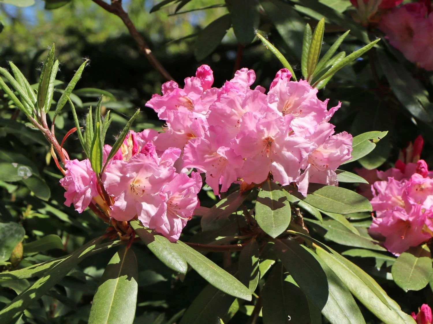 Der Rhododendron ‚Bellefontaine‘ ist nicht nur durch seine bestechende Farbgebung ein echter Hingucker! Auf den Blütenstutzen sitzen bis zu 12 rubinrosa Blüten, die innen zartrosa mit lila Tönung ausgestattet sind. Die Blüten lassen ihre Umgebung leicht süßlich duften, die Belaubung ist glänzend tiefgrün.